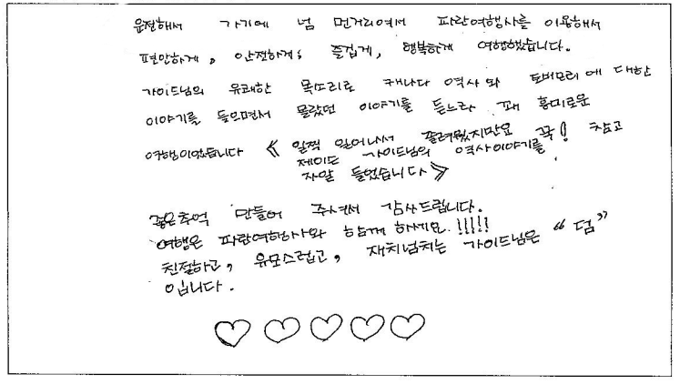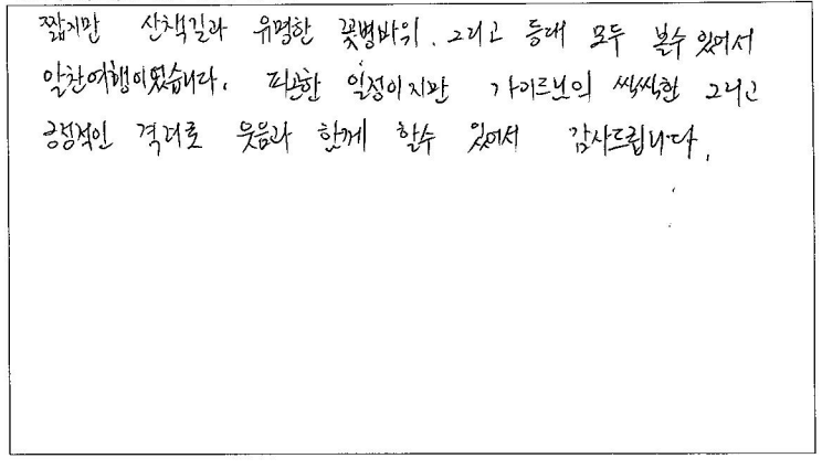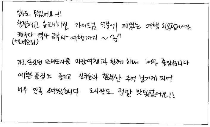 ![]() 토버모리 여행 너무 즐겁고 행복했습니다. 전체적으로 잘 구성된 일정에 날씨도 좋았구요 토버모리의 아름다운 경치와 유리같이 맑은 물을 보고 감동했습니다. 버스기사님의 친절함과 안정적인 드라이브 그리고 좋은 가이드분을 만나서 여행이 한층 더 즐거웠습니다. (고객의 편리를 최우선으로 하시는 모습이 좋았습니다) 1일 여행을 고민중이라면 파란여행의 토버모리 1일 투어를 추천합니다. ![]() 운전해서 가기에 너무 먼거리여서 파란여행을 이용해서 편안하게, 안전하게! 즐겁게, 행복하게 여행했습니다. 가이드님의 유쾌한 목소리로 캐나다 역사와 토버모리에 대한 이야기를 들으면서 몰랐던 이야기를 듣느라 꽤 흥미로운 여행이었습니다. <일찍 일어나서 졸려웠지만요 꾹 참고 가이드님의 역사이야기를 잘 들었습니다 좋은 추억 만들어 주셔서 감사드립니다. 여행은 파란여행과 함께 하세요! 친절하고, 유머스럽고, 재치 넘치는 가이드님은 '덤'입니다. ![]() 식사도 맛있어요~!! 친절하고 유쾌하신 가이드님 덕분에 재밌는 여행 되었습니다. 캐나다 역사 공부와 여행까지 가고 싶었던 토버모리를 파란여행과 함께 해서 너무 좋았습니다. 예쁜 풍경도 즐기고 친구들과 행복한 추억 남기게 되어 너무 만족스러웠습니다. 도시락도 정말 맛있었어요!! ![]() 너무 너무 즐거운 여행이었습니다. 푸른 빛의 물과 나무들 사이에 있는 집들... 하얀 연안등대도 보고 아! 이곳에서 살고 싶다!! 역시 짜임새 있는 스케쥴 파란여행 최고입니다. 여행은 '파란여행 가이드님은 김가이드님. 오늘 정말 감사했습니다. ![]() 짧지만 산책길과 유명한 꽃병바위, 그리고 등대 모두 볼 수 있어서 알찬여행이었습니다. 피곤한 일정이지만 가이드님의 씩씩한 그리고 긍정적인 격려로 웃음과 함께 할 수 있어서 감사드립니다. ![]() 한 번쯤 오고 싶었던 토버모리에 차가 없어 못 오던 찰나에 주변소개로 파란여행과 함께 하게 되었습니다. 꽃병섬에 머무르는 시간이 여건상 짧았지만 그럼에도 너무 만족한 당일 여행이었습니다. 차가 없으면 여행하기 어려운 캐나다에서 당일 좋은 상품 만들어주시고 여행 내내 발게 웃으며 가이드 해주신 가이드 분과 파란여행 모두 감사드립니다. ![]() 분주한 일상생활을 벗어나 힐링되는 여행을 하게 해주신 파란여행에 감사드립니다. 그리고 열정적으로 친절하신 가이드님께도 감사드립니다. 주위에 있는 지인분들에 파란여행 토버모리 여행을 추천하겠습니다. 또한, 다음 가을단풍여행도 파란여행을 통해 갈려고 합니다. ![]() 차가 없으면 가기 힘든 멋진 여행지들을 항상 파란여행과 함께합니다. 뚜벅이에게 아주 귀한 알찬 하루였어요. 감사합니다~!! |