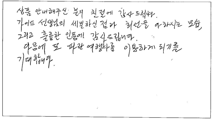 ![]() 복잡한 도시에서 벗어나 아름다운 경치를 바라보면서 힐링하고 싶으신가요? 지금 당장 파란여행의 토버모리 1일 투어를 신청하세요 귀로 듣는 것보다 직접 투어하면서 멋진 자연으로 힐링되는 이 기분을 느껴보셔야 합니다. 좋은 투어에 감사드립니다! 가이드님! 파란여행! 다른 투어로 또 만나요 ![]() 꽃병섬으로 들어가는 크루즈를 타고 싶어서 토버모리 당일 여행을 신청했어요 아 어쩌나 비가 오고 있었어요 그런데 가이드님이 어찌 어찌 하시더니 셔틀버스만 주차해서 크루즈를 탈 수 있는 선착장에 가서 마지막 배를 탔어요 야호! 배를 타고 도착한 꽃병섬에서 정말 신나게 잘 놀았어요 조금 씩 내렸던 비 때문에 운치있는 여행이었어요 대박~ 돌아오는 선착장에서 웅성웅성 구름처럼 많은 사람들 가운데(왜냐면 셔틀버스만 올 수 있는 선착장) 개선장군 처럼 파란여행 로고의 버스를 타고 가이드님이 우리들을 태우러 왔답니다. 이런 극진한 대우를 받다니... 가이드님 멋져요!!! 정말 감사했어요! ![]() 좋은 추억의 여행 감사드려요 엄청 큰 대우 받은 여행에 감사드려요 가이드님 항상 건강하세요 파란여행이 번창하길 바랍니다. ![]() 친절한 가이드. 세힘한 배려. 개개인 맞춤/여가 활용 선택옵션 만족스러운 여행 합리적인 가격 감사합니다 ![]() 아름다운 자연경관 풍경을 보며 힐링의 시간을 가졌다. 좋은 코스로 기획하고 안내해 주신 여행사와 가이드님께 감사의 말씀을 전한다. 토버모리 1일여행 강추입니다! ![]() 상품 안내해주신 분의 친절에 감사드립니다. 가이드 선생님의 세밀하신 점과 최선을 다하시는 모습. 그리고 훌륭한 인품에 감사드립니다. 다음에 또 파란여행을 이용하게 되기를 기대합니다. |