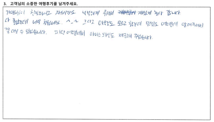 ![]() 혼자 처음으로 패키지여행을 파란여행과 함께했는데 너무 만족스러웠습니다. 가기전에 걱정도 많이 됐는데 전화로도 친절하게 일정에 대해서 설명해주시고 꼼꼼하게 한명한명을 챙겨주시는 느낌을 받아서 챙겨주셔서 좋았습니다! 여행 일정도 오타와, 몬트리올, 퀘백까지 2박3일동안 알차게 보냈습니다. 가이드님께서도 너무 유쾌하게 설명도 많이 해주시고 중간중간 추억에 남길 수 있는 예쁜 사진들도 정말 많이 찍어주셨습니다! (사진 너무 잘 찍으세요!!) 자유시간도 충분했고 맛집 list와 편의시설까지 표시되어있는 지도까지 준비해주셔서 덕분에 편하고 알찬 자유시간을 보낼 수 있었습니다! 호텔도 총 두 곳에서 머물렀는데 두 곳 다 너무 만족스러웠습니다. 그리고 아이스와인까지 서프라이즈 선물로 주셔서 호텔에서 아이스와인과 만족스럽게 하루를 마무리할 수 있었습니다! ![]() ![]() ![]() ![]() |