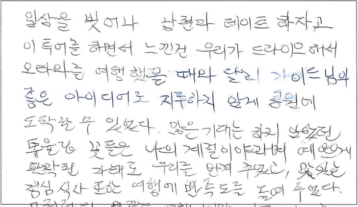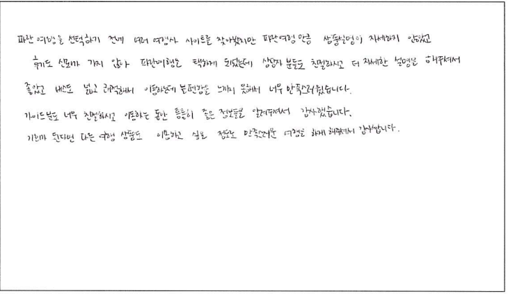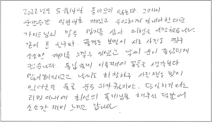 ![]() 코로나 전에 파란 오타와 튤립축제 상품을 이미 경험했습니다. 당시에 만족도가 높아 오늘 다시 한번 다녀오게 되었습니다. 언제나 변함없는 파란만의 고객 만족 극대화의 마인드가 다시 한번 느껴지는 여행이었습니다. 1일은 짧고 이틀은 조금 긴 오타와 여행을 파란 덕분에 너무 잘 다녀왔습니다. 늘 감사합니다. ![]() 2022년 5월 14일 날씨 맑음 오타와 튤립축제 너무 재밌게 갔다와요! 가이드팀의 TMI스토리와 History 너무 유익했고 캐나다에 17년 살면서 몰랐던 이야기도 알게 되었어요! 날씨도 화창하고 ( 날씨가 힌몫헸어요) 그리고 생각보다 투어시간도 넉넉했어요! 보통 자유시간이 너무 짧다고 생각했던 다른 여행과 다르게 이번여행은 넉넉하게 하고 싶은거 보고 싶은거 다아~ 봤어요! 버스도 깨끗하고 넓고 음식도 양이 많고 맛있고 최고의 날이였어요! 가이드님 말씀처럼 오늘은 하루뿐이고 오늘 나는 특별했어요! *영화 (졸려서 다는 못봤지만, 이것도 좋았어요!* P.S 달리는 차안이라서 글씨는 개판이지만 좋은 여행 감사합니다! ![]() 일상을 벗어나 남편과 데이트 하자고 이 투어를 하면서 느낀건 우리가 드라이브해서 오타와를 여행했을 때와 달리 가이드님의 좋은 아이디어로 지루하지 않게 공원에 도착할 수 있었다. 많은 기대는 하지 않았던 튤립 꽃들은 나의 계절이라며 예쁘게 활짝핀 자태로 우리를 반겨주었고 맛있는 점심식사 또한 여행에 만족도를 높여 주었다. 모처럼의 짧은 여행이었지만 힐링 할 수 있는 여행에 가이드님과 파란여행에 감사하다. ![]() 2022년도 5월 14일 돌아오지 않는다 그래서 순간순간 일분일초 재밌고 유익하게 보내야 한다던 가이드님의 말을 밑거름 삼아 여행을 시작했습니다. 같이 온 친구와 풍경도 보면서 서로 사진도 찍구 소소한 재미를 느낄 수 있었고 날씨 운이 좋았던게 컸습니다. 튤립축제 이틀째에 꽃들은 생각보다 많이 펴있었고 날씨도 화창하고 사진찍는 맛이 있더군요, 물론 운도 따라줬지만. 당일치기 라는 리밋이내에 최선의 플래닝을 해주신 덕분에 소소한 재미 느끼고 갑니다. ![]() 파란여행을 선택하기 전에 여러 여행사 사이트를 찾아봤지만 파란여행 만큼 상품설명이 자세하지 않았고 후기도 신뢰가 가지 않아 파란여행을 택하게 되었는데 상담자 분들도 친절하시고 더 자세한 설명을 해주셔서 좋았고 버스고 넓고 쾌적하니 이동하는데 불편함을 느끼지 못해서 너무 만족스러웠습니다. 가이드분도 너무 친절하시고 이동하는 동안 틈틈히 좋은 정보들을 알려줘서 감사했습니다. 기회가 된다면 다른 여행 상품도 이용하고 싶을 정도로 만족스러운 여행을 하게 해주셔서 감사합니다. ![]() 오늘 날씨 좋았고 옆에 소중한 친구로 좋고. 모두가 좋았다고 할께요. 가이드 하신 분도 좋구요. Everything Good!! |