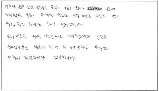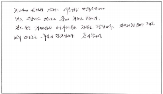 ![]() 긴 여행이 아닌 당일치기 짧은 여행이라 큰 기대없이 버스에 올랐는데 너무나도 만족스러웠습니다. 패키지 여행의 장점만 극대화 시킨 여행인거 것 같아요! 이번 이후로 파란여행 다른 여행상품도 꼭 이용해 봐야겠다는 생각이 들었습니다. 하루동안 수고해주신 가이드님 감사합니다! ![]() 열과 성을 다해서 준비하신 느낌, 완전 짱이였어요. 날씨 빼고 다 준비한다는 '파란여행'. 오늘 날씨는 누가 가져왔을까요. 100% 편안함. 파란의 단골로 다니다보니 토론토에 이 여행사가 있음이 너무 감사한일, 모두 다 잘되시기를. ![]() 날짜가 얼마 남지 않은 상황에서 급하게 예약했는데, 바로 전화로 확인해주시고 자세하게 설명해주셨어요. 버스로 이동하는 내내 가이드님께서 여러가지 알려주셔서 지루하지 않게 시간 보냈습니다~ 날씨도 좋아서 더 기분 좋았어요 ^^ ![]() 폭풍을 견디지 못한 튤립이 조금 아쉬웟지만 일상을 벗어나서 힐링이 되었던 하루였습니다. 장거리 버스 여행임에도 불구하고 가이드님의 설명과 안내 덕분에 지루하지 않은 시간이었고 감사했습니다. ![]() 코로나로 이제 좀 여행을 다니고, 주변도시 구경하려고 하다가 파란여행 신청하게 되었습니다. 친구들과 좋은 추억 많이 만들고 갑니다! 가이드님도 너무 친절하시고 중간중간 지루하지 않게 잘 해주셨어요 :) 감사합니다. Thank you! ![]() 캐나다에서 지낸지 이제 3개월차 된 어학연수생입니다. 그동안 오고싶던 캐나다였지만 좋지않은 날씨와 잘 알지 못하는 캐나다 지식때문에 큰 흥미없이 공부만 하면서 지냈는데 짧은 시간이었지만 처음으로 캐나다는 즐거운 곳이라는 생각을 했습니다. 긴 이동시간이 걱정되었는데 가이드분께서 여러이야기와 지식들을 알려주셔서 긴 시간이 길게 느껴지지 않았네요. 감사합니다. 즐겁게 놀다갑니다. ![]() 며칠전 심한 폭풍우로 튤립이 많이 없어 걱정했던 부분이 무색할 정도로 너무 예쁜 사진도 많이 찍고, 좋은 추억을 많이 남겨 갑니다. 특히 버스로 정말 편안하고 가이드님께서 친절히 설명해주신 덕분에 한결 더 편안하고 유익한 여행이 되었습니다. 감사합니다. ![]() 캐나다에서 살면서 언제나 이용하는 여행사 입니다. 믿고 다음에도 언제나 함께 하려고 합니다. 잠도 쫒는 가이드님의 역사해설은 정말로 짱입니다. 파란여행 하면 제일 먼저 떠오르는 추억이 된것입니다. 감사합니다. ![]() 날씨도 좋고 여행도 좋았습니다. 투어를 계획할 때 항상 파란여행를 선택해서 후회하지 않는 여행이 된거 같아요. 감사합니다. ![]() 편안하고 쾌적한 차량으로 여유로운 당일 여행이었습니다. 도시락도 맛있었고 가이드의 포인트도 유용했구요. 일상에서 잠시 벗어나 가족이 함께 한 즐거운 하루였습니다. 감사합니다. |