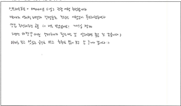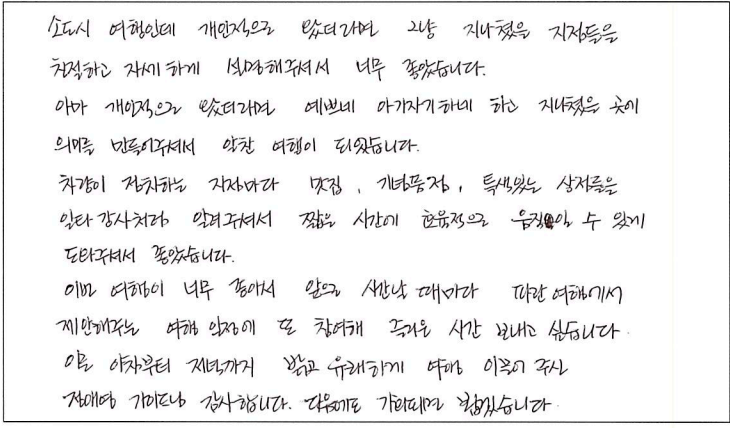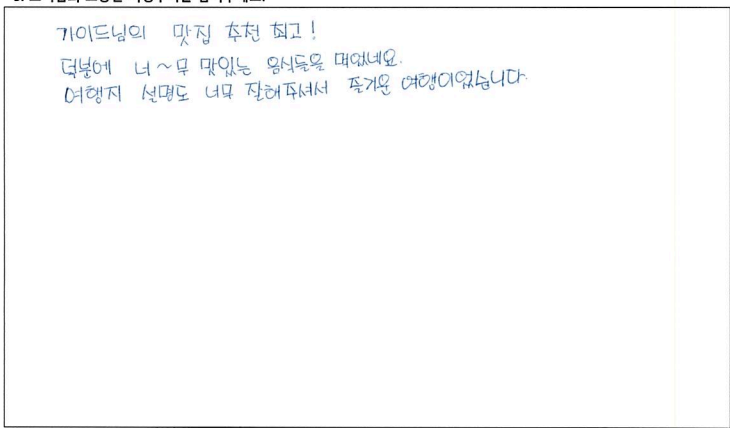 ![]() 답답한 일상을 벗어나 대자연을 느끼고 갑니다. 날씨도 준비한 듯 너무 좋았고 친절한 가이드님의 설명도 귀에 쏙쏙! 너무 설명도 잘하시고 추천해주신 곳이나 음식은 정말 환상이었습니다. 큰 기대하지 않고 참여핸 투어가 선물을 받은 느낌이네요. 메노나이트, 스트라드포트 상품 최고에요. ![]() 메노나이트 + 스트라드포트[1일] 관광 여행 추천합니다. 여러가지 역사적 배경과 설명들로 초행인 여행길이 풍부해졌습니다. 맛집 추천해주신 곳들 다 너무 맛있었어요! 가이드님 짱bb 파머스마켓 갈때는 장바구니 필수라는 걸 알려주면 좋을 것 같습니다. :) 마차도 보고 맛있는 음식도 먹고 초원도 많이 보고 잘 즐기다 갑니다. :) ![]() 가이드님의 맛집 추천 최고! 덕분에 너~ 무 맛있는 음식들을 먹었네요. 여행지 설명도 너무 잟해주셔서 즐거운 여행이었습니다. ![]() 소도시 여행인데 개인적으로 왔더라면 그냥 지나쳤을 지점들을 친절하고 자세하게 설명해주셔서 너무 좋았습니다. 아마 개인적으로 왔더라면 예쁘네 아기자기하게 하고 지나쳤을 곳에 의미를 만들어 주셔서 알찬 여행이 되었습니다. 차량이 정차하는 지점마다 맛집, 기념품점, 특색있는 상점들을 일타 강사처럼 알려주서서 짧은 시간에 효율적으로 움직일 수 있게 도와주셔서 좋았습니다. 이번 여행이 너무 좋아서 앞으로 시간날때마다 파란여행에서 제안해주는 여행 일정에 또 참여해 즐거운 시간 보내고 싶습니다. 이른 아침부터 저녁까지 밝고 유쾌하게 여행 이끌어 주신 가이드님 감사합니다. 다음에도 기회되면 뵙겠습니다. |