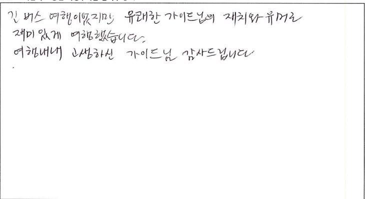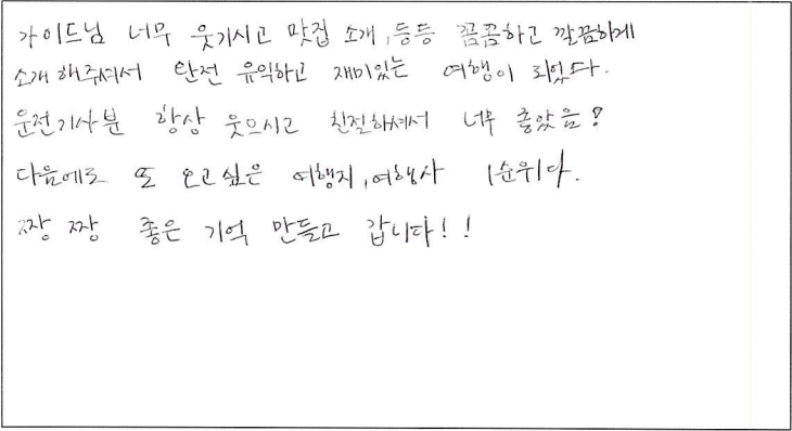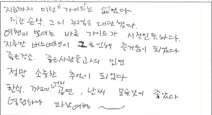 ![]() 처음 단체여행이었는데 정말 깜짝 놀랐습니다. 생각하지 못했던 다양한 준비로 지루할 틈 없이 여행을 즐겼습니다. 한국에서의 예약단계 부터 친절하고 세심함이 느껴졌었는데 출발 후 여행 내내 가이드님의 세심한 준비성에 감탄하며 찐 즐거웠습니다. 다음에도 여행 계획은 파란여행과 함께 할 것 같습니다. 즐겁고 소중한 추억을 만들어 주셔서 감사합니다. 가이드님 ~ 짱!! 짱!!! ![]() 처음 방문한 캐나다 여행~ 여행사 패키지 여행이라 반신반의 했지만 우리 가이드님 만나서 즐거운 여행이었습니다. 쇼핑없는 여행도 진짜? 했는데 진짜 1도 없었어요~!^^ 설명해 주시고 자유시간도 적절히 주시고 지루한 버스시간도 재밌는 시간 보내게 해주셔서 감사해요! 주신 아이스와인 선물은 가족과 함께! ^^ 다음에 또 오게될 것 같아요. 다음번엔 단풍이 있는 가을에요~ 그때도 가이드님 계시겠죠?~~ ![]() 혼자서 여행할 기회가 생겨 자유여행과 패키지 여행을 고민하다가 파란여행의 캐나다 동부 4박5일을 선택하게 되었습니다. 교통편, 숙소를 고민할 필요 없이 여행 할 수 있다는 점이 가장 큰 장점이었는데 이 여행덕분에 멀리 몬트리올, 퀘벡까지 가볼 수 있어 좋았습니다. 그리고 이동 할때마다 이것저것 친절하고 재미있게 설명해주신 가이드님 덕분에 캐나다에 대해 많이 배울 수 있었습니다. 다음에는 가족, 친구들과 함께 캐나다의 다른 도시로도 떠나보고 싶습니다. ![]() 2박 3일 오타와, 몬트리올, 퀘벡을 편안하고 알차게 잘 보고 왔습니다. 제공식(한식)도 맛있게 먹고요, 2박 숙소(호텔)도 깨끗하고 편안했어요. 가이드님께서 관광지는 물론 캐나다에 대한 자세하고 잼있는 소개로 많은 도움이 되었습니다. 다음에도 파란여행의 프로그램 믿고 이용하고 싶습니다. ![]() 가이드님 수고 많으셨습니다~ 여행을 통한 지식 습득까지 유용한 여행이었던 것 같습니다. 준비 많이 해주신 가이드님 최고네요! ![]() 이렇게 긴 버스 여행은 처음이라 걱정이 많았는데 가이드님의 너무 재밌고 정보를 꽉꽉 채운 설명으로 정말 유쾌하고 즐겁게 일정을 즐길 수 있었습니다. 정착지마다 설명과 맛집 정보도 맞춤으로 알려주셔서 효율적인 여행 일정을 짤 수 있었습니다. 선물 주신 아이스와인도 맛있었어요. 감사합니다. 다음에도 파란여행으로 하겠습니다. ![]() 너무 즐겁고 만족스러운 여행이었고 나중에 친구들이 캐나다에 방문하게 되면 이번과 똑같은 코스로 같은 가이드 분과 한번 더 여행을 하고 싶습니다. 가이드 안내, 식사, 호텔, 차량등 모든 부분에서 매우 만족했습니다. ![]() 가이드님 덕분에 긴 시간 정말 즐겁고 지루하지 않게 여행 했습니다. 캐나다의 역사와 다양한 이야기로 많은 것을 배우고 잊지못할 추억이 되었습니다. 다음여행도 꼭 파란여행과 가이드님과 같이 하는 여행을 선택 해야 겠어요^^ 감사합니다. ![]() 제가 4번째 여행이었는데 가이드님, 설명과 안내가 최고였어요. 호텔은 상상 이상의 만족감 입니다. ![]() 혼자 자유여행으로 몬트리올, 퀘벡을 다녀올까 했는데 운전, 비행기 다 막막하고 불편해서 알아보던 차에 이 패키지를 알게되었는데 코스도 알차고 저렴한 가격으로 콤팩트하게 다 둘러볼수 있어서 너무 유익했던것 같아요. 운전 시간이 길어서 걱정했는데 가이드님께서 유익한 설명을 많이 해주셔서 지루할 틈 없이 다양한 내용 많이 알아가서 좋아요. 혼자 왔으면 절대 못 봤을 것들을 설명해 주셔서 너무 좋았습니다. 호텔도 만족스러웠고 식사는 한식 위주. 다들 무난하게 만족 할 수 있는 수준이었습니다. 몬트리올, 퀘벡, 자유시간 일정도 있어서 좋았어요~ 짧은 시간에 적은 돈으로 최고의 선택입니다. ![]() 가이드님 너무 웃기시고 맛집 소개 등등 꼼꼼하고 깔끔하게 소개해주셔서 완전 유익하고 재미있는 여행이 되었다. 운전기사분 항상 웃으시고 친절하셔서 너무 좋았음! 다음에도 또 오고 싶은 여행지, 여행사 1순위다! 짱짱 좋은 기억 만들고 갑니다!! ![]() 지금까지 이런 "가이드"는 없었다. 시간 순삭, 그의 능력은 대단했다. 여행의 묘미는 바로 가이드가 시작인 듯하다. 지루한 버스여행이 그로 인해 즐거움이 되었다. 좋은 장소, 좋은 사람들과의 인연, 정말 소중한 추억이 되었다. 한식, 까페, 거리공연, 날씨 모든것이 좋았다. 영원하라 파란여행~~ ![]() 긴 버스 여행이었지만 유쾌한 가이드님의 재치와 유머로 재미있게 여행 했습니다. 여행 내내 고생하신 가이드님 감사드립니다. ![]() 가이드님 멋진 분이십니다. 여행 내내 유쾌한 설명으로 즐거웠어요. 가족여행으로 추천하고 싶어요! ![]() 오랫동안 기다려 왔던 퀘벡 여행이었습니다. 가이드님의 전문성, 유머 너무나 좋았구요. 여행의 깊이는 이루 말할 수 없었습니다. 담번엔 가을 퀘벡, PEI 노려 볼 거구요, 좋은 추억 만들어 주셔서 다시한번 감사드립니댜. |
