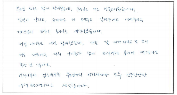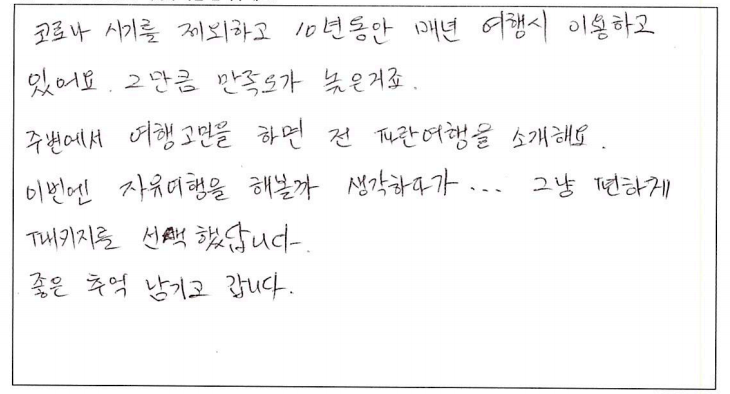 ![]() 파란여행 두번째 여행이에요. 첫번째 퀘벡여행에 대한 만족도가 높아서 한번 더 오게되었네요. 시간낭비 없이 꽉 차고 알찬 워싱턴+뉴욕 3박4일 이었습니다. 놓치는것 없이 너무너무 꼼꼼하게 역사설명까지 들을 수 있어서 무엇보다 알찬 여행이었습니다. 특히나 가이드님의 정말 친절하시고 사진도 모두 챙겨서 찍어주시니 더할나위 없었습니다. 더운날씨에 정말 고생하셨고 덕분에 길고 긴 시간이 하나도 지루하지 않았어요. 누군가 캐나다여행, 미국여행을 고민한다면 강추!!! ![]() 처음 와 본 미국 뉴욕&워싱턴 3박4일은 꿈같은 시간이었다. 캐나다에서 버스로 미국에 올 수 있다는 것만으로도 놀라운 일이었는데 3박4일 동안 뉴욕과 워싱턴 투어는 더 신기하고 놀라웠다. 긴 버스이동 시간이 지루할 것 같았지만 가이드님의 역사이야기와 틈틈히 보여주시는 영화나 DVD는 버스 이동시간의 지루함을 줄여주었다, 우리가 방문하는 뉴욕과 워싱턴을 배경으로 한 영화여서 더 흥미롭고 즐거웠던 시청 시간이었다. 짧은시간이지만 뉴욕에서 가봐야 할 곳을 다 가보고 꼭 봐야하는 것도 다 본듯한 알찬 시간이었던것 같다. 가이드님의 시간계산과 일정 조율은 탁월한 것 같다. 관광객들이 몰리지 않고 시간대에 맞게 일찍 방문하고 관광하게 해준 루레이동굴과 뉴욕의 야경을 보러갔던 록펠러 전망대 시간대 조율에 감사를 전한다. 브로드웨이 라이언킹 뮤지컬 관람 또한 잊지못할 추억이다. 다시 방문한다면 파란여행을 통해 오고 싶다. 긴 시간 안전운전을 해준 기사님, 오랜시간 잘 인도해준 가이드님께 감사인사를 전하고 싶다. ![]() 3박4일 미국 동부 뉴욕, 워싱턴 여행. 짧은 시간에 알차게 여행한것 같아요. 친절한 가이드님 귀에 쏙 들어오는 설명도 좋았습니다. 가이드님덕에 더 편한 여행이었습니다. 감사합니다. ![]() 코로나 시기를 제외하고 10년동안 매번 여행시 이용하고 있어요. 그만큼 만족도가 높은거죠. 주변에서 여행고민을 하면 전 파란여행을 소개해요. 이번엔 자유여행을 해볼까 생각하다가... 그냥 편하게 패키지를 선택했답니다. 좋은 추억 남기고 갑니다. ![]() 한국에서 캐나다 토론토 언니네 집에 와서 파란여행을 통해 미국 3박4일 동안 혼자 뉴욕, 워싱턴을 여행하게 되었는데, 알찬 일정과 친절한 가이드님 덕분으로 혼자서도 전혀 불편함 없이 재미있고 행복하게 여행을 하게 되어 감사드리며, 숙소도 힐튼호텔 & 쉐라톤 호텔이라 좋았고 음식들도 맛있고 아주 만족한 평생 잊지못할 즐겁고 행복한 여행이었습니다. 다음기회에도 파란여행을 통해서 여행을 가는 그날을 기다리며 함께 여행한 모든 분들과 기사님, 가이드님께 감사함을 전합니다. ![]() 뉴욕, 워싱턴 3박4일 여행. 즐겁고 행복하게 잘 했습니다. 가이드님의 해박한 지식으로 상세한 설명과 미국의 역사 많이 배우고 특히, 포인트 장소에서 사진 촬영도 감사드립니다. 잊지못할 여행이었습니다. 파란여행의 무궁한 발전을 빕니다. ![]() 부모님 모시고 함께 참여했는데 부모님도 저도 만족스러웠습니다. 일정이 알차고 하나라도 더 보여주고 알려주시려고 애써주시는 가이드님의 노력이 돋보이는 여행이었습니다. 어린 아이들도 여러명 함께 했던데 다들 잘 따라다니는 것 보니 저도 다음에는 저희 아이들과 함께 파란여행 통해서 여행가도 좋을 것 같아요. 어린이부터 젋은 친구들, 부모님까지 여러세대가 모두 만족할만한 여행 프로그램이라고 생각합니다. ![]() 4일만에 뉴욕과 워싱턴을 다 관광할 수 있을까 걱정이 많았는데 다녀온 지금은 정말 만족한 여행이었다고 말할 수 있답니다!! 노련한 가이드님의 일정조율로 워싱턴도 뉴욕도 하루에 관광할 수 있는 최대치를 보고 온것 같아 기쁩니다~ 무엇보다도 2만보 넘게 거닐며 곳곳을 돌아본 뉴욕에서의 시간은 잊지 못할 것 같아요! 게다가 매번 멋진 장소에서 전문 사진 작가처럼 사진 찍어주신 것도 너무 감사합니다. "추억 + 멋진사진" 얻게 된 이번 여행. 다시 한번 감사드리요!! ![]() 호텔환경이 좋았으며 식사메뉴가 좋았다. 가이드님의 안내가 방문지의 역사 문화적 배경 설명이 훌륭하여 관광의 깊이가 있었다. 북미 대륙의 여러 국가들의 탄생배경에 대해 많은 것들을 알게 되었다. 특히 쇼핑관광의 최소화로 관광시 피로감이 적었다. 파란여행의 무궁한 발전과 더불어 더 나은 관광 상품을 기대해 본다. ![]() 가족과 함께한 즐거운 여행이었어요. 미국 여행이 좋았다고 한 친지의 말만 들었을 때는 그냥 그랬는데 캐나다에 왔다가 파란여행을 통해 미국의 주요 도시를 짧고 임팩트있게 둘러볼 수 있어서 좋았습니다. 인상깊은것은 여행사가 고객배려에 신경을 많이 쓰고 있는 듯 합니다. 식당 선택이나, 현지에서 디테일한 안내 등 여행사와 더불어 가이드님 수고에 만족합니다. 파란여행 번창하세요! ![]() 미국 첫 여행을 파란여행과 함께 가게 되었는데 매우 알찬 여행이 된것 같습니다. 3박4일 이고 미국으로 이동하는 시간이 있다보니 이곳을 즐기기에는 짤은 시간이겠구나 걱정했는데 워싱턴 뿐만 아니라 특히 뉴욕에서 보낸 시간 하나하나가 너무 알찼습니다. 워싱턴에서는 아