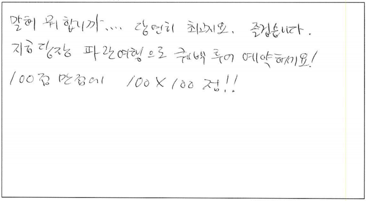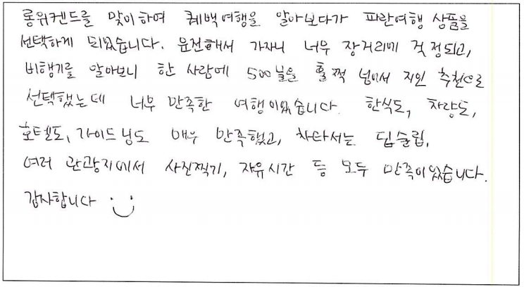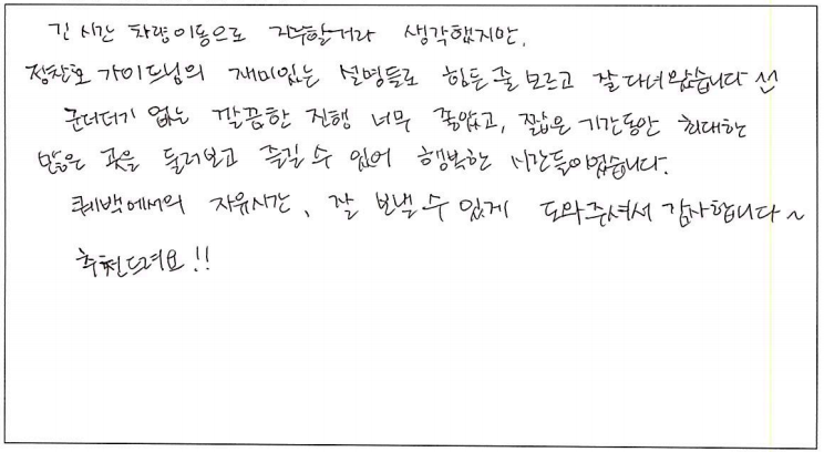 ![]() 캐나다 와서 제일 행복하고 좋은 시간이었습니다. 한 장소를 갈때마다 자세히 가이드님이 설명해주셔서 그 장소를 보며 이해할 수 있었습니다. 어떻게든 잘 알려주겠다는 마음을 저희도 느낄 정도 입니다. 그리고 성격도 좋으셔서 여행이 더 재밌었습니다. 식사는 2박3일만 있었는데도 한식, 양식 골고루 다 나와서 좋았고 특히 한식이 한국에서 먹는 것보다 맛있었습니다. 호텔은 최고였습니다. 5성급 호텔을 가는데 뷰도 좋고 넓고 쾌적하고 주변에 볼 것, 놀 것도 많고 조식도 맛있었습니다. 그리고 제가 이 여행에서 가장 중요하게 생각했던 게 차량, 버스인데 제가 탄 버스 중 최고였습니다. 첫날은 하루에 거의 반나절을 버스에 있었는데 자리도 크고 의자도 편안하고 창문도 커서 안 답답하고 TV도 영화도 틀어주셔서 (+화장실) 정말 좋았습니다! 그리고 전체적인 여행 일정도 너무 빡빡하지 않고 적당히 재밌게 놀 수 있어서 좋았습니다. 파란여행 덕분에 2박3일 동안 즐거운 추억 만들고 갑니다. 감사합니다. 앞으로 자주 이용할 것 같습니다! :) ![]() 날씨도 좋았고 여행코스, 호텔, 식사, 가이드님 설명까지 너무 좋았습니다. 가을 단풍 때 또 오고 싶어요! ![]() 퀘벡 너무 가고 싶었는데 개인적으로 가기에는 너무 멀고 시간도 없어서 포기했는데 파란여행 덕분에 여러가지로 좋았어요. 호텔도 너무 좋고 가이드님이 설명해 주시는 것도 좋았어요. ![]() 가이드님 너무 친절하시고 다양한 설명도 많이 해주셔서 이동할때도 여행할때도 지루하지 않게 재밌게 할 수 있었던것 같아요. 예쁜 캐나다 여행 함께 해주셔서 감사합니다. ![]() 말해 뭐합니까...당연히 최고지요. 즐겁습니다. 지금당장 파란여행으로 퀘벡투어 예약하세요! 100점 만점에 100X100점!! ![]() 2박3일 날씨도 좋고 동행하신 분들도 좋았습니다. 특히 좋은 가이드는 정말 도움이 되었습니다. 즐겁고 행복한 여행 추억을 만들었습니다. ![]() 퀘벡, 몬트리올, 오타와, 킹스턴 2박3일로 다녀왔는데 대만족입니다! 호텔이 메리어트이고 몬트리올 다운타운에 있어서 잘 잤고 스케쥳도 알찼습니다. 퀘벡 너무 예뻤는데 가이드님의 자세한 설명과 역사 문화 배경이 많은 도움이 되었습니다! 버스기사님도 운전 잘 하시고 식사도 제공되어서 많은 곳 갈 때 편안하게 갔어요. :) ![]() 불편함 없는 여행이었습니다. 잘 짜여진 여행일정과 숙소, 맛집 등 저 같은 캐나다 초보 여행자들에게 너무나도 좋은 여행입니다. 파란여행과 또 함께 하고 싶어요. 감사합니다! ^^ ![]() 파란여행을 통하여 2박3일 가족여행을 왔습니다. 오랜시간 버스를 타는 동안 쉬지 않고 스토리를(지역의 역사이야기) 말씀해 주신 가이드님께 감사합니다. 패키지 여행이라는 고정관념을 깨고 자유시간도 많아서 가족들끼리 자유롭게 다니며 즐거운 추억을 많이 쌓아갑니다. 특히나 오타와, 몬트리올, 퀘벡으로 옮길 때 마다 꼭 찍어야 하는 사진명소들을 알려주셔서 도움이 많이 되었습니다. 2박3일 동안 즐거웠습니다.^^ (주변 맛집 추천 안내문은 최고였습니다.) ![]() 두번째로 이용하는 파란여행이었는데 역시 너무 좋았습니다. 2박3일 동안 재밌게 여러가지 소개, 설명해 주시는 가이드님 진짜 감사했습니다. 올드퀘벡은 정말 잊지 못할 것 같아요. 선물로 주신 아이스와인 너무 좋았구요~ 캐나다에서 지내는 동안 파란여행 자주 만나요~ ![]() ![]() ![]() 퀘벡 2박3일 가이드님과 너무 잘 갔다왔습니다. 편안한 버스에서 가이드님이 준비해주신 자료를 보며 여행지에 대한 역사와 재미난 에피소드 등 감동이었습니다. 캐나다에 2년째 살고 있지만, 퀘벡 같은 곳은 운전하기 힘들어 막상 가기 쉽지 않은데, 파란여행 투어 선택을 참 잘했습니다. 버스에서 푹 쉬면서 여행을 제대로 즐길 수 있는 파란여행! 추천드립니다. 감사합니다. ^^ ![]() 롱위켄드를 맞이하여 퀘벡여행을 알아보다가 파란여행 상품을 선택하게 되었습니다. 운전해서 가자니 너무 장거리에 걱정되고, 비행기로 알아보니 한 사람에 500불을 훌쩍 넘어서 지인 추천으로 선택했는데 너무 만족한 여행이었습니다. 한식도, 차량도, 호텔도, 가이드님도 매우 만족했고 차타서는 딥슬립. 여러 관광지에서 사진찍기, 자유시간 등 모두 만족이었습니다. 감사합니다. :) ![]() 긴 시간 차량이동으로 지루할거라 생각했지만 가이드님의 재미있는 설명들로 힘든 줄 모르고 잘 다녀왔습니다. ^^ 군더더기 없는 깔끔한 진행 너무 좋았고, 짧은 시간동안 최대한 많은 곳을 둘러보고 즐길 수 있어 행복한 시간들이었습니다. 퀘벡에서의 자유시간, 잘 보낼 수 있게 도와주셔서 감사합니다~ 추천드려요!! ![]() 한국에서 너무나 멀고 먼, 넓고 넓은 캐나다 여행이 막막했는데 파란여행을 만나 꼭 여행하고 싶었던 여행지에서 즐겁고 행복한 기억을 만들게 되었습니다. 똑 부러지게 설명하시는 가이드님 만나 알차게 여행하게 된점, 이번 여행의 행운이라 생각합니다. 먼길 재미나고 유익한 이야기를 채우시느라 고생많으셨습니다. 여행의 시작이 좋다보니 남은 여행일정도 즐겁게 보낼것 같습니다. ![]() 서부 벤쿠버 자유여행 후 동부로 이동하게 되면서 캐나다 현지 여행사