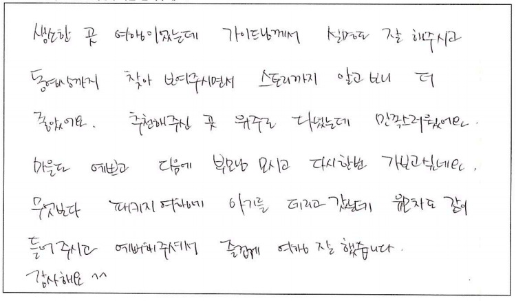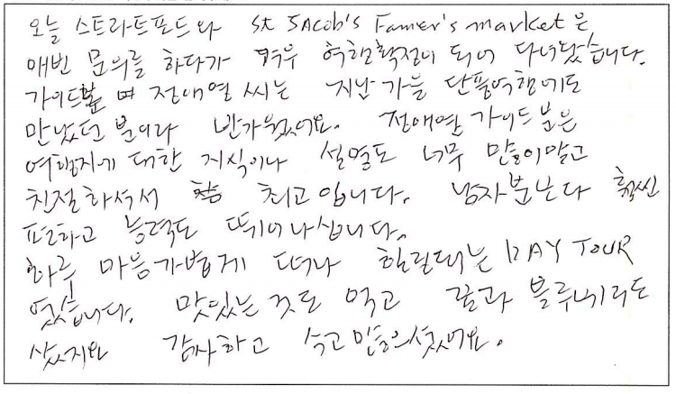 ![]() 스트라트포드와 메노나이트의 파머스 마켓을 가기전 까지는 사실 어떤 풍경일지 기대하기 어려웠습니다. 퀘벡을 다녀오면서 예쁜 거리와 건물에 대한 느낌을 스트라트포드에서 똑같이 느꼈습니다. 특히 시청건물도 너무 예뻤고, 사진찍는 모든 장면이 그림처럼 예뻤습니다. 세인트 제이콥의 파머스 마켓은 무척 많은 사람들로 붐비긴 했지만, 시골 마켓처럼 적당한 흥정으로 좋은 물건들을 구매하는 재미도 쏠쏠했습니다. 하루밖에 안되는 일정이지만 가이드님의 꼼꼼한 일정과 스케쥴 관리 덕분에 굉장히 알찬 하루를 보냈습니다. 누구보다 친절하고 상냥하게 아이들을 위해 배려해 주셔서 참 감사했습니다. 주변 지인들에게도 너무 추천하고 싶은 여행이었습니다. 역시 파란여행이었습니다~ ![]() 메노나이트 집성촌 세인트 제이콥스를 갔다왔는데 정말 매력적인 장소였어요. 토론토 다운타운에서 세인트 제이곱스를 가면 무언가 영화촬영 장소 또는 70-80년대 북미를 방문한 느낌이었어요. 가이드님께서 이야기를 참 재밌게 잘하시고 사진을 정말 잘 찍어주셔서 감사해요. 중형버스도 완전 편하게 이용했습니다. 꿀잠 잤어요~ 메노나이트 당일 투어는 정말 다른 사람들에게 추천하기 좋은 것 같습니다. ![]() 생소한 곳 여행이었는데 가이드님께서 설명도 잘 해주시고 동영상까지 찾아 보여주시면서 스토리까지 알고 보니 더 좋았어요. 추천해주신 곳 위주로 다녔는데 만족스러웠어요. 마을도 예쁘고 다음에 부모님 모시고 다시한번 가보고 싶네요. 무엇보다 패키지여행에 아기를 데리고 갔는데 유모차를 같이 들어주시고 예뻐해 주셔서 즐겁게 여행 잘 했습니다. 감사해요. ^^ ![]() 상황에 따라 적절한 추천이 좋았습니다. 맛집 추천과 명소추천이 가장 만족스러웠어요. 하루의 짧은 여행이었지만 의미 있었어요. 파란여행 가이드님 감사합니다. ![]() 오늘 스트라트포드 와 St. Jacob's Farmer's market은 매번 문의를 하다가 겨우 여행 확정이 되어 다녀왔습니다. 가이드분은 지난 가을 단풍여행에도 만났던 분이라 반가웠어요. 가이드님은 여행지에 대한 지식이나 설명도 너무 많이 알고 친절하셔서 최고입니다. 남자분보다 훨씬 편하고 능력도 뛰어나십니다. 하루 마음가볍게 떠나 힐링되는 Day Tour였습니다. 맜있는 것도 먹고 꿀과 블루베리도 샀지요. 감사하고 수고 많으셨어요. |