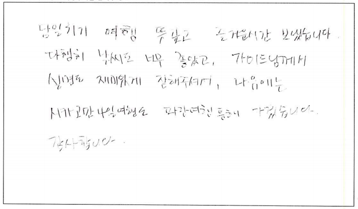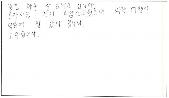 ![]() 캐나다에 온 뒤로 5개월이 넘는 시간동안 도시 쪽에만 있다가 자연을 느낄 수 있는 곳에 와서 너무 좋았습니다. 기사님의 편안한 운전과 가이드님의 친절한 설명, 배려가 너무 감사했어요. 좋은 추억 만들어 주셔서 감사합니다. 잊지 못 할 것 같아요. ![]() 당일치기 여행 뜻깊고 즐거운 시간 보냈습니다. 다행히 날씨도 너무 좋았고, 가이드님께서 설명도 재미있게 잘해주셔서, 다음에는 시카고만4일 여행도 파란여행 통해 가겠습니다. 감사합니다. ![]() 날씨가 흐려서 처음엔 걱정이 좀 됐는데 점심이 지나니까 걱정이 무색할 정도로 해도 쩅쨍하고 날씨가 좋아져서 기분이 좋았다. 중간에 길을 잃을 뻔 했지만 지나고 보면 이 또한 좋은 추억이 될 거 같다. 좋은 추억 만들어 주셔서 감사합니다. ![]() 자연이 너무 좋고 안정감을 알려주셔서 행복했습니다. 감사합니다. ![]() 급하게 결정된 여행에 걱정이 많았지만 서비스와 좋은 퀄리티에 만족하고 갑니다. 기대 이상으로 재미있고 즐거웠던 여행이었습니다. ![]() ![]() 차량 이동 중에 이런저런 얘기 해주시는 게 재밌었습니다. 감사합니다. ![]() 알찬 하루 잘 보내고 갑니다. 혼자서는 가기 부담스러웠는데 파란여행 덕분에 잘 갔다 옵니다. 고압습니다. |