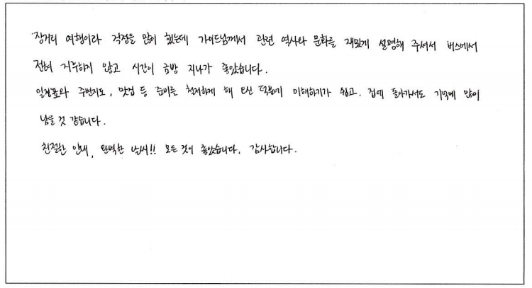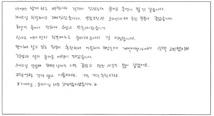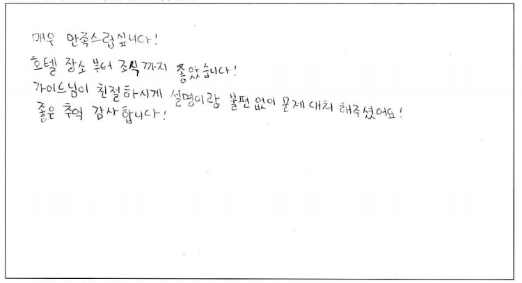 ![]() 버스에 탑승하는 첫 순간부터 파란여행의 배려와 친절함 덕분에 좋은 기억만 가지고 여행을 마무리 할 수 있었습니다. 한식과 양식이 적절히 배치되어 있는 식사 덕분에 음식에 관한 불만이 조금도 생기지 않았고, 더 즐거운 여행이 된 것 같습니다. 다운타운 한복판에 위치한 호텔의 서비스, 위치, 식사, 수영장과 같은 혜택을 충분히 이용하기에 적절히, 철저하게 계획된 일정과 시스템이었습니다. 선택에 후회가 남지 않도록 즐겁고 친절하게 관광 도와주신 파란여행과 가이드님께 무한 감사드립니다. 나중에 다른 여행을 계획할때도 제일 먼저 고려해 선택하고 싶습니다. 감사합니다! 화이팅! ![]() 1.강제쇼핑이 없어서 좋아요. 2.호텔위치가 좋았는데 퀘벡에서 최고 호텔 "힐튼"에서 잤는데 야경이 너무 좋았습니다. 아이들도 수영까지 하고, 가족모두 좋아하더라구요. 3. 가이드 분께서 퀘벡 현지 맛집리스트를 주셔서 점심. 저녁 식사도 수월하게 해결했습니다. 여행 많이 다녀봤는데 파란여행 가이드분 정말 최고!! 패키지 여행중 가장 시간이 어떻게 흘러가는지 모르게 장거리 이동 했네요~ 4.캐나다 현지 여행사 이용 많이 해봐야 겠어요. 파란여행으로 PEI 관광 꼭 파란여행으로 해보렵니다. ![]() 파란여행사~ 전화하는 첫날 친절한 상담부터 신뢰감을 느끼며 아~ 이곳으로 예약해야겠다 라는 생각을 했는데 끝나는 날까지 나의 느낌은 틀리지 않았다. 첫째느낌~ 준비를 아주 철저히 하는 회사구나 둘째느낌~ 서비스를 통하여 손님에게 즐거움과 나를 반기는구나 하는 안정감과 소소한 기쁨을 주는구나 셋째느낌~ 강력추천-Quebec에서의 나의 호텔룸은 한폭의 그림속에 있는 느낌이어서 신혼부부에게 추천하고 싶을 정도로 예쁨을 떠나 아름다운 그 자체의 뷰 였다. 다시한번 와보고 싶은 곳. ![]() 4박5일 여행중에 제일 메인 이벤트였던 퀘벡 2박3일 일정 너무 좋았습니다. 차안에서 지루하기 마련인데 그 시간을 알차고 재미있게 채워주신 가이드님 감사드리며 다른 분들도 꼭 이분과 함께 하시면 역사, 상식 캐나다의 많은 지식을 얻어가실 수 있으신 것 같아요. 호텔도 몬트리올, 퀘벡 모두 다운타운 위치며 시설이며 좋고 접근성 Good!! 하루만 묶고 가는것이 넘 아쉬웠습니다. 식사도 불고기 도시락의 세심함, 한식당 모두 만족! 다음에 꼭 한번 가족과 함께 또 오고 싶은 여행이었습니다. 강추!!! ![]() 캘리포니아에서 직접 인터넷 검색하여 찾은 캐나다 토론토 여행. 생각보다 알찬 스캐쥴로 좋은 가족여행 보냈습니다. 몇년 전 왔을 때와 다른 경험 많이 했어요. 자상하신 가이드님 덕분에 곳곳 명소 저희가 원하는 투어를 즐길 수 있었습니다. 다시한번 가이드님께 감사말씀 드립니다. 여행상품 많이 다녔지만 이번만큼 만족하는 여행 처음입니다. ![]() 가족끼리 여행이라 아무 생각없이 따라왔는데 생각보다 더 편하고 좋았다. 패키지 여행의 좋은 점만 모아놓은 것 같다. 가이드님이 이 일에 너무 만족하고 계신듯 하다. 정말 아시는 것도 많고 레크레이션 강사처럼 진심으로 해주시고 차에서 졸려도 설명해 주시는 걸 듣고 여행을 하니 더 좋았다. 호텔들이 굉장히 쾌적하고 조식이 정말 잘 나왔다. 버스 기사님도 운전을 정말 잘 해주셨다. ![]() 담당 가이드님의 해학적인 유머와 풍부한 지식, 경험에서 우러나오는 노련함으로 여행내내 지루하지 않고 책에서 배울 수 없는 지식을 덤으로 배울 수 있어서 너무 좋았습니다. 특히 퀘벡에서의 가이드님의 퍼포먼스는 이번여행의 하이라이트, The best 였습니다. ![]() 꼭 필요한 명소, 스케쥴로 알차게 짜여진 몬트리올, 퀘벡 여행 너무 좋았습니다. 꼼꼼한 가이드님, 사소한 조그마한 것 까지 챙겨주시는 가이드님 덕분에 정말 감동적인 여행 즐길 수 있었습니다. 감사합니다. ![]() 아이와 함께 하는 여행이라 걱정이 있었는데 즐거운 추억이 될 것 같습니다. 가이드님 친절하시고 재미있었습니다. 맛집추천과 코스안내 해 주신 부분이 좋았습니다. 호텔이 좋아서 편하게 쉬었고 만족스러웠습니다. 식사도 여러번의 한식메뉴로 준비해주셔서 잘 먹었습니다. 현지에 살고 있는 동생이 추천해서 이용하게 되었는데 지역 여행사여서 살짝 고민했지만 걱정과 달리 즐거운 여행이 되었습니다. 가이드님 덕분에 퀘벡날씨도 너무 좋았고 멋진 사진도 많이 남겼어요. 파란여행 걱정말고 이용하세요. 저는 적극추천드려요. *가이드님, 운전자님 너무 고생 많으셨습니다.* ![]() 장거리 여행이라 걱정을 많이 했는데 가이드님께서 관련 역사와 문화를 재밌게 설명해 주셔서 버스에서 전혀 지루하지 않고 시간이 금방 지나가 좋았습니다. 일정표와 주변지도, 맛집 등 준비를 철저하게 해 오신 덕분에 이해하기가 쉽고 집에 돌아가서도 기억에 많이 남을 것 같습니다. 친절한 안내, 완벽한 날씨!! 모든 것이 좋았습니다. 감사합니다. ![]() 매우 만족스럽습니다! 호텔 장소 부터 조식까지 좋았습니다! 가이드님이 친절하시게 설명이랑 불편없이 문제 대처 해 주셨어요! 좋은 추억 감사합니다. ![]() 여행 코스 너무 좋았고, 한식으로 준비해주셔서 맛있게 잘 먹었습니다. 가이드님이 설명도 잘해주
