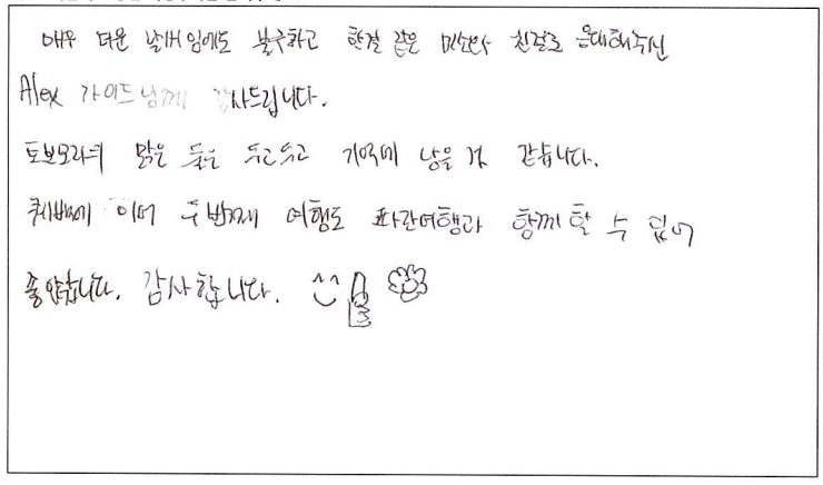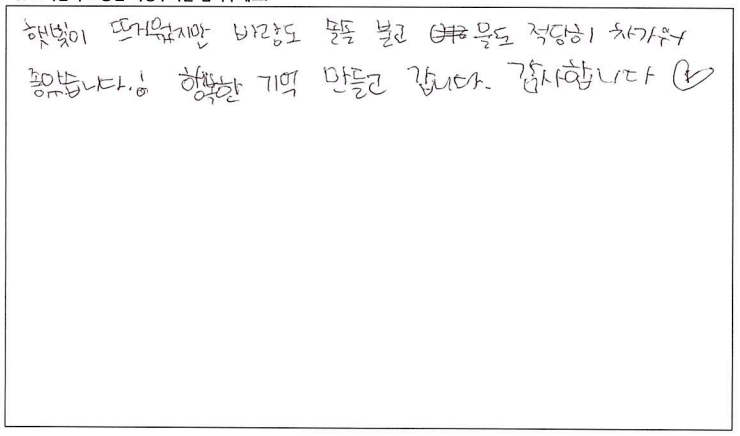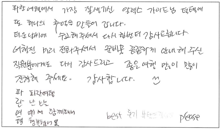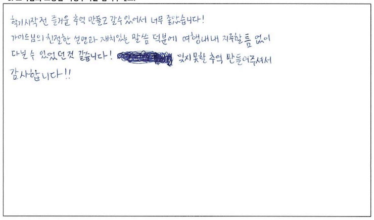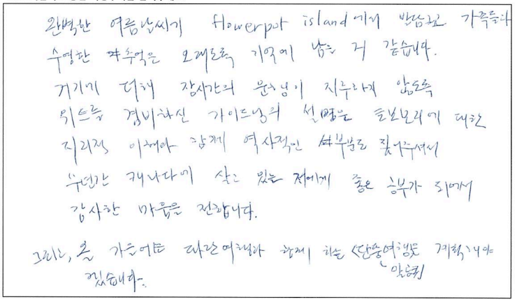 ![]() 토버모리 여행 강추드립니다. 너무 예쁘고 힐링이에요. 꼭 한번 더 와보고 싶네요. 힐링이 필요할 때 혼자 즉흥적으로 갔다오기 좋은 상품입니다. ![]() 매우 더운 날씨임에도 불구하고 한결같은 미소와 친절로 응대해주신 가이드님께 감사드립니다. 토버모리의 맑은 물은 두고두고 기억에 남을 것 같습니다. 퀘벡에 이어 두번째 여행도 파란여행과 함께 할 수 있어 좋았습니다. 감사합니다. ![]() 여러 번 다녀 같지만 올때 마다 늘 편안한 마음 안고 갑니다. 건강하세요. 다음에 또 뵙겠습니다. ![]() 이번 토버모리 여행을 갔다 온 어린이입니다 요즘 제 삶에 큰 변화들이 생기면서 다양한 일들이 있었는데요. 이번 여행을 통해 행복한 추억을 만들며 새로운 사람들도 만나고, 생각을 정리할 수 있어 저에게는 뜻깊은 시간이었습니다. 특히 유람선을 타면서 파도소리도 듣고 바람도 느끼면서 엄청 릴렉스를 했어요 맑은 물도 너무 예뻤고 자연과 함께 있을 수 있어서 재밌고 행복했어요, 하나 아쉬운점은 마지막에 돌아다닐때 시간이 조금 적어서 제대로 못돌아다녔어요. 꼭 다시 오고 싶고 다른 사람들께도 추천해 드리고 싶어요. ^^ ![]() 온타리오주의 숨겨진 보물같은 장소 "토버모리" 토론토에서 4시간을 달려 도착한 "토버모리"는 버스에서의 피곤함을 한번에 날려주었다, 초록색도 파란색도 아닌, 깨끗하고 맑다라는 표현으로는 부족한 뭐라 형언할 수 없는 물의 빛깔부터 가족끼리 친구끼리 연인끼리 자유롭게 수영하고 즐기는 모습을 보는 것만으로도 저절로 입가에 미소가 지어졌다. 왕복 8시간의 버스길을 달려 하루만에 소화하기에는 엄청 빡빡한 일정이었지만 가이드님의 노련하고 여행객을 배력하는 마음이 느껴져서 일정을 편안하게 마무리 할 수 있었다. 앞으로도 캐나다에 숨겨진 아름다움을 볼 수 있는 여행상품을 많이 개발해 주세요. ![]() 완벽한 여름날씨에 Flowerpot island에서 발 담그고 가족들과 수영한 추억은 오래도록 기억에 남을 거 같습니다. 거기에 더해 장시간의 운행이 지루하지 않도록 위트를 겸비하신 가이드님의 설명은 토버모리에 대한 지리적 이해와 함께 역사적인 부분도 짚어주셔서 수년간 캐나다에 살고 있는 저에게 좋은 공부가 되어서 감사한 마음을 전합니다. 그리고 올 가을에는 파란여행과 함께 하는 단풍여행 계획해야 겠습니다. ![]() 파란여행에서 가장 잘생기신 가이드님 덕분에 또 하나의 추억을 만들어 갑니다. 더운날씨에 수고해주셔서 다시 한번 더 감사드립니다. 여행 전 미리 전화주셔서 준비물 꼼꼼하게 안내해 주신 직원분에게도 다시 감사드리고 좋은 여행 많이 많이 진행해 주세요. 감사합니다. 파 파란여행 란 난 오늘 여 여행 함께헤서 행 행복했어요 ![]() 학기 시작전 즐거운 추억 만들고 갈 수 있어서 너무 좋았습니다! 가이드님의 친절한 설명과 재치있는 말씀덕분에 여행 내내 지루할 틈 없이 다닐 수 있었던 것 같습니다! 잊지못할 추억 만들어 주셔서 감사합니다!! ![]() 먼 여행길 편하게 다녀올 수 있도록 배려해 주셔서 감사합니다. 번창하시길 바랍니다. ![]() 날씨는 더웠지만, 재밌었습니다. 다른 1일 관광도 가고 싶어요! ![]() 햇빛이 뜨거웠지만 바람도 솔솔 불고 물도 적당히 차가워 좋았습니다. 행복한 기억 만들고 갑니다. 감사합니다. |