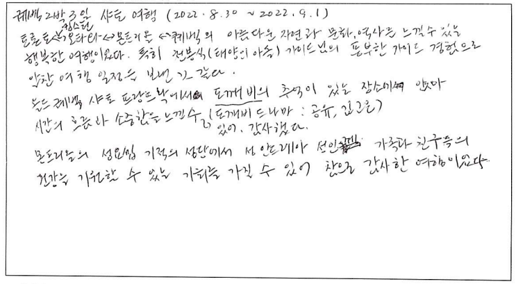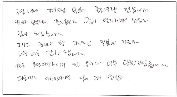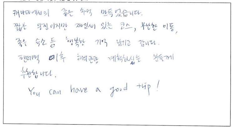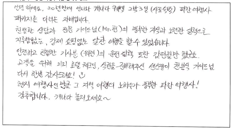 제목 | 2022년08월30일 출발 퀘벡 자필후기 | ||