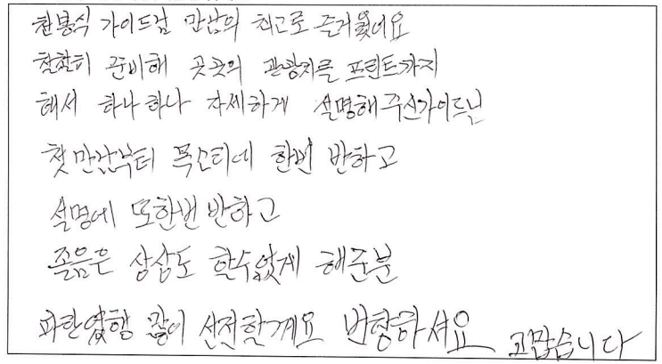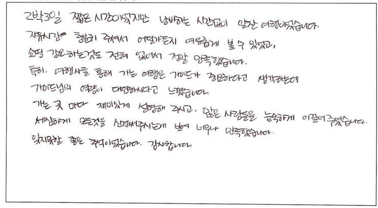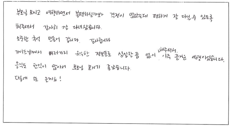 ![]() 개인적으로 운전하기에는 먼 거리라 여행사를 알아보던 중에 주변 지인의 소개로 파란여행을 알게 되었습니다. 주변인들의 추천대로 식사, 차량, 호텔, 안내, 모든 면에서 만족한 여행이었습니다. 기사님께서 운전도 잘 해주셔서 긴 시간 버스안에서의 시간이 편안했고 호텔의 위치는 일정이 끝난 후 개인시간에도 최적의 위치였고, 편안한 잠자리와 식사 덕분에 더 즐거운 여행이었습니다. 긴 시간동안 여러가지 가이드님의 이야기 덕분에 즐겁게 시간가는 줄 모르고 온 것 같습니다. 많은 자료들을 준비해 주셔서 편안하고 알차게 여행했습니다. 또한 기다림 없이 잘 이끌어 주셔서 감사하고, 수고 많으셨어요. 앞으로 또 여행하게 된다면 파란여행과 함께 할것입니다. 덕분에 엄마, 아이들과 즐거운 여행 할 수 있었습니다. ![]() 3일 내내 가이드님 덕분에 좋은 여행 했습니다. 캐나다 관련해서 좋은 정보도 많이 알려주셔서 도움도 많이 되었습니다. 그리고 준비의 왕 가이드님 덕분에 자료도 너무너무 감사합니다. 코스도 파란여행에서 한 투어라 너무 만족스러웠습니다. 다음에도 여행 한다면 이용 다시 할께요. ![]() 2박3일 짧은 시간이었지만 낭비하는 시간 없이 알찬 여행이었습니다. 자유시간, 충분히 주셔서 어딜가든지 여유롭게 볼 수 있었고, 쇼핑 강요하는 것도 전혀 없어서 정말 만족했습니다. 특히, 여행사를 통해 가는 여행은 가이드가 중요하다고 생각하는데 가이드님의 역량이 대단하시다고 느꼈습니다. 가는 곳 마다 재미있게 설명해 주시고 많은 사람들을 능숙하게 이끌어 주셨습니다. 잊지못할 좋은 추억이었습니다. 감사합니다. ![]() 부모님 모시고 여행하면서 불편하실 까봐 걱정이 많았는데 편하게 잘 다닐 수 있도록 해주셔서 감사히 잘 다녀왔습니다. 소중한 추억 만들어 갑니다. 감사합니다. 가이드님께서 여러가지 유익한 정보들로 심심할 틈 없이 해주셔서 아주 즐거운 여행이었습니다. 음식도 한식이 많아서 부모님 모시기 좋았습니다. 다음에 또 올께요! ![]() 이번 4박5일 캐나다 동부여행 정말 즐거웠어요. 가이드님의 철저한 준비와 꼼꼼하신 세심함에 감동했습니다. 차량도 쾌적하고 Driver분도 친절하시구요. 캐나다 여행 계획하시는 분들께 적극 추천합니다. ![]() 예전의 패키지 여행을 생각했었는데 감동이었습니다. 쇼핑 일절 없고 꼼꼼한 설명을 위한 준비들이 참 많았습니다. 식사도 정말 맛있어서 만족스러웠습니다. 기존의 패키지 여행이 아니라 너무 좋았습니다. 숙소도 만족스럽고 버스며 모든 일정이 좋아서 다음에도 기회가 되면 이용하고 싶습니다. 수고해 주셔서 감사합니다. ^^ ![]() 캐나다에서의 좋은 추억 만들었습니다. 짧은 일정이지만 짜임새 있는 코스, 무난한 이동, 좋은 숙소 등 행복한 기억 남기고 갑니다. 팬데믹 이후 해외관광 계획 하시는 분들께 추천합니다. You can have a good trip! ![]() 가이드님 만남이 최고로 즐거웠어요. 철저히 준비해 곳곳의 관광지를 프린트까지 해서 하나하나 자세하게 설명해 주신 가이드님, 첫 만남부터 목소리에 한번 반하고 설명에 또 한번 반하고 졸음은 상상도 할수없게 해준 분. 파란여행 많이 선전할께요. 번창하세요. 고맙습니다. ![]() 가이드님과 함께 한 3일간 토론토에서 출발 퀘벡, 몬트리올 다시 토론토 까지 버스로 이동하면서 관광지마다 자세하게 설명을 너무 잘해주시고 한말씀 한말씀 귀에 쏙쏙 들어오게 해서 지명이 기억에 남습니다. 점심도 미쳐 못드시면서 여행객들의 시간을 챙겨주시는 모습이 너무 감동이었습니다. 오랫동안 살아 가면서 생각이 나겠지요. 아름다운 캐나다 여행 잘하고 갑니다. 고맙습니다. ![]() 안녕하세요. 20년 만에 언니와 퀘벡 2박3일 (샤토숙박) 파란여행 패키지를 다녀온 자매입니다. 친절한 상담과 전문 가이드님의 풍부한 지식과 노련한 실력으로 지루함 없는, 강제 쇼핑없는 알찬 여행을 할 수 있었습니다. 안전하고 친절한 기사분의 운전실력 또한 감탄 할 만 했구요. 고객을 위해 미리 호텔 체크인, 식권을 준비해 주신 센스쟁이 가이드님. 다시 한번 감사드리요! 현지 여행사인 만큼 그 지역 여행의 노하우가 풍부한 파란여행! 강추합니다 캐나다 놀러오세요~ ![]() 퀘벡 2박3일 샤토여행(2022.8.30~2022.9.1) 토론토, 킹스턴, 오타와, 몬트리올, 퀘벡의 아름다운 자연과 문화, 역사를 느낄 수 있는 행복한 여행이었다. 특히 태양의 아들 가이드님의 풍부한 가이드 경험으로 알찬 여행일정을 보낸 것 같다. 올드퀘벡 샤토 프랑트낙에서의 도깨비의 추억이 있는 장소에 앉아 시간의 흐름과 소중함을 느낄 수 있어 감사했다. 몬트리올의 성요셉 기적의 성당에서 성 안드레아 성인께 가족과 친구들의 건강을 기원할 수 있는 기회를 가질 수 있어 참으로 감사한 여행이었다. ![]() 패키지 여행도 이렇게 만족스러울 수가 있구나! 하는 생각이 든 여행이었습니다. 긴 이동시간, 지루하지 않게 캐나다 역사를 정말 재미있게 설명해 주신 가이드님 덕분에 아이들이 아주 즐거웠다고 합니다. 또 정성스러운 여행 맛집, 지도를 준비해 주셔서 자유시간도 잘 활용할 수 있었습니다. 시내호텔, 안전한 운전으로 더 편안했