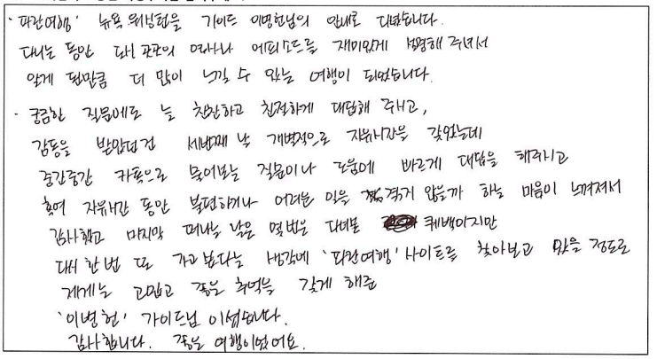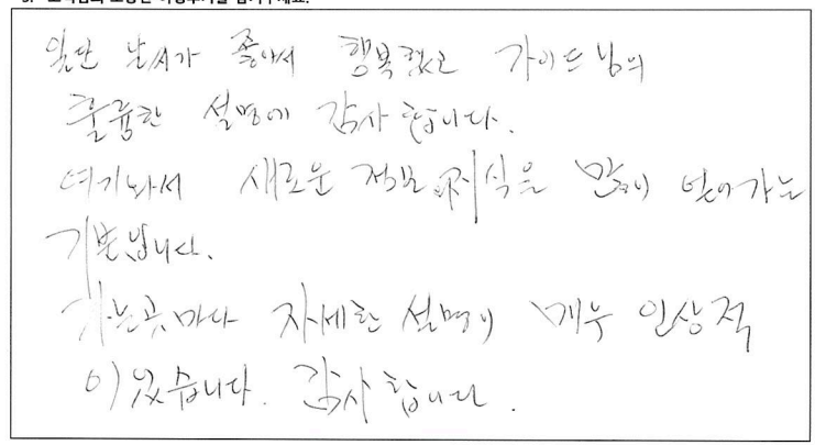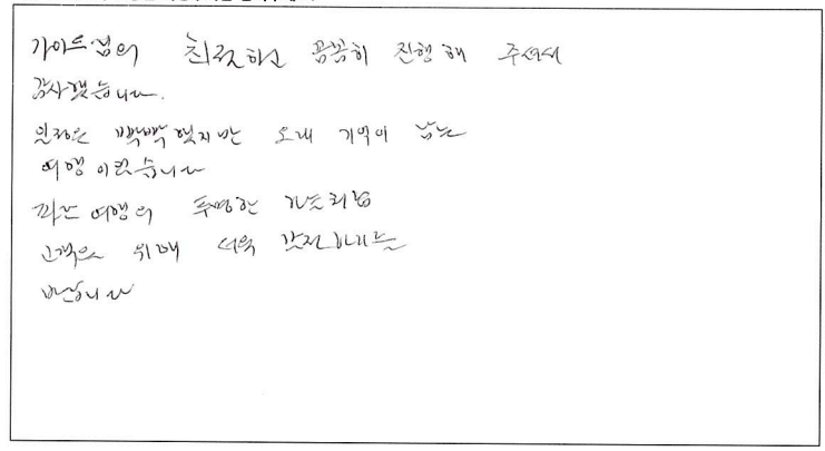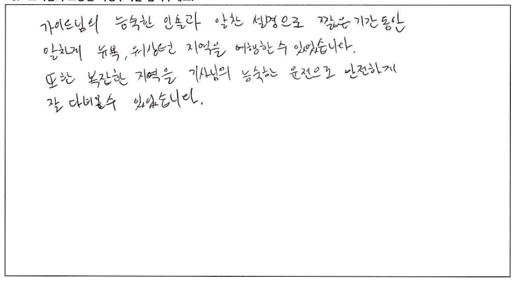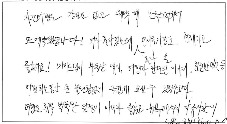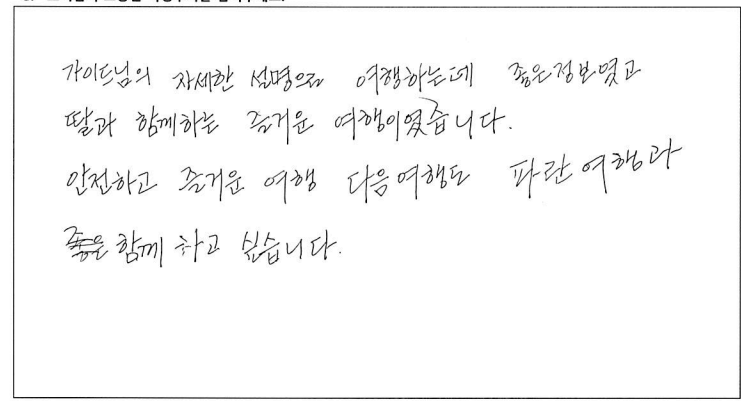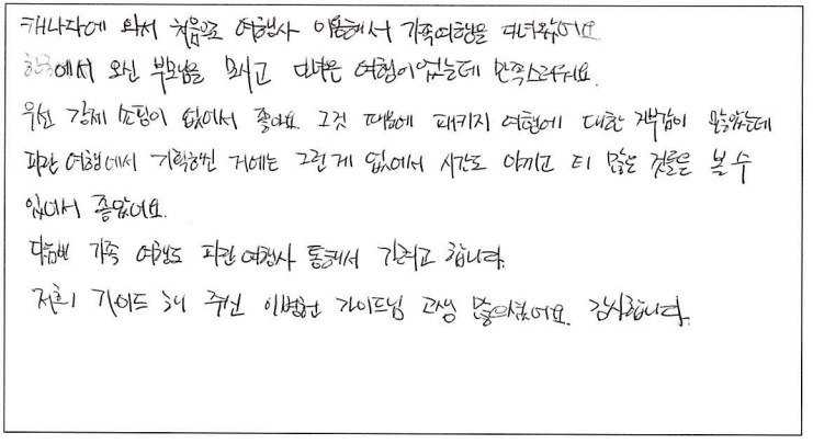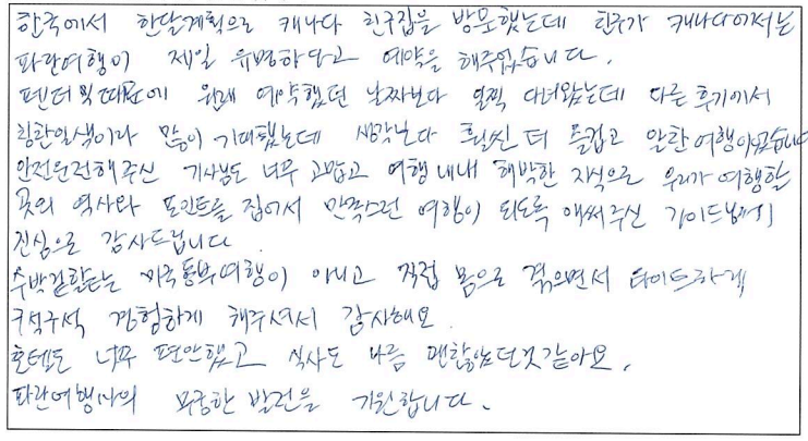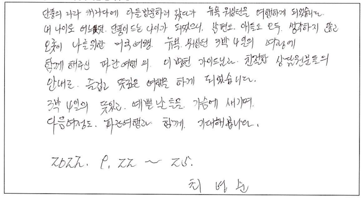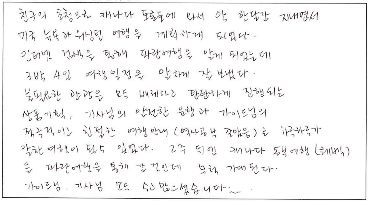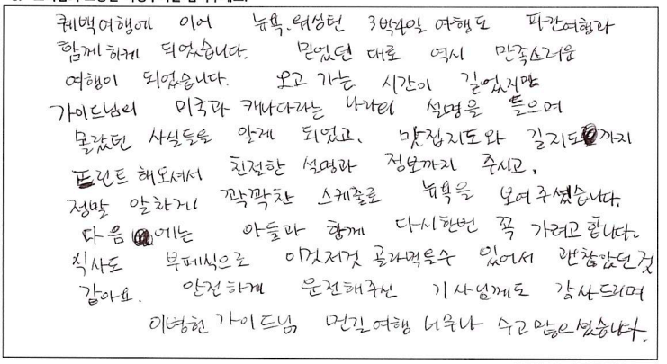 ![]() 일단 결론부터 적자면, 파란여행으로 패키지여행 떠나시는 분들께 적!극! 추천합니다! 해외여행이 처음이어서 어떻게 계획을 세워야 할지 몰라서 어려워 할 때, 캐나다에 사시는 이모의 추천으로 '파란여행'을 알게 되었습니다. 캐나다 온김에 미국도 가보고는 싶었는데 숙소, 교통편을 예약하려니 막막했는데, 여행다니는 3박4일 동안 불편한 것 하나 없이 너무 즐거운 시간 보내고 추억많이 쌓을 수 있어서 좋았습니다. 제일 좋았던 점은 가이드님의 배려, 친절함과 적절한 가이드였습니다. 미국에 대해 역사적으로 하나도 몰랐는데 첫날 미국가는 길에서, 관광한 곳에서 미국의 배경과 역사적인 지식들을 설명해 줘서 더 이해하며 관광할 수 있었습니다. ![]() 퀘벡여행에 이어 뉴욕, 워싱턴 3박4일 여행도 파란여행과 함께 하게 되었습니다. 믿었던 대로 역시 만족스러운 여행이 되었습니다. 오고 가는 시간이 길었지만 가이드님의 미국과 캐나다라는 나라의 설명을 들으며 몰랐던 사실들을 알게 되었고, 맛집 지도와 길 지도까지 프린트 해오셔서 친절한 설명과 정보까지 주시고 정말 알차게 꽉꽉한 스케쥴로 뉴욕을 보여주셨습니다. 다음에는 아들과 함께 다시한번 꼭 가려고 합니다. 식사도 부페식으로 이것저것 골라먹을 수 있어서 괜찮았던 것 같아요. 안전하게 운전해주신 기사님께도 감사드리며 가이드님 먼길 여행 너무나 수고 많으셨습니다. ![]() 뉴욕+워싱턴 여행의 3박4일은 나에게 힐링의 시간이었다. 워싱턴의 자유로움과 박물관 전시물을 관람하면서 세계인의 발길을 잡을 수 있다는 놀라움과 부러움을 느꼈다. 뉴욕 맨하탄의 자유의 여신상, 마담투소 박물관, 첼시 마켓 맛집을 투어 했다는 즐거움을 함께 했다. 보편적으로 3박4일의 여행은 만족도가 높은 시간들이라 나의 친구들에게도 꼭 추천해주고 싶다는 생각이다. ![]() 캐나다에 와서 처음으로 여행사 이용해서 가족여행을 다녀왔어요. 한국에서 오신 부모님을 모시고 다녀온 여행이었는데 만족스러워요. 우선 강제 쇼핑이 없어서 좋아요. 그것 때문애 패키지 여행에 대한 거부감이 많았는데 파란여행에서 기획하신 것에는 그런게 없어서 시간도 아끼고 더 많은 것들을 볼 수 있어서 좋았어요. 다음번 가족 여행도 파란여행 통해서 가려고 합니다. 저희 가이드 해주신 가이드님 고생 많으셨어요. 감사합니다. ![]() 여행이 재미있었어요. 할아버지, 할머니랑 다녀왔는데 편하게 다녔어요. 동굴가는 것도 좋았고 museum of natural history도 좋았어요. 자유의 여신상을 가까이 볼 수 있었고 멸종된 동물들을 봐서 또 좋았어요. 호텔에서 자는 것도 편했고, 밥도 맛있었어요. 감사합니다. -7살 어린이 후기- ![]() '파란여행' 뉴욕+워싱턴을 가이드님의 안내로 다녔습니다. 다니는 동안 도시 곳곳의 역사나 에피소드를 재미있게 설명해 주셔서 알게 된만큼 더 많이 느낄 수 있는 여행이 되었습니다. 궁금한 질문에도 늘 친절하게 대답해 주시고 감동을 받았던 건 세번째 날, 개별적으로 자유시간을 가졌는데 중간중간 카톡으로 물어보는 질문이나 도움에 빠르게 대답을 해주시고 혹여 자유시간 동안 불편하거나 어려운 일을 겪지 않을까 하는 마음이 느껴져서 감사했고 마지막 떠나는 날은 몇번을 다녀 본 퀘벡이지만 다시한번 또 가고 싶다는 생각에 '파란여행' 사이트를 찾아보고 있을 정도로 제게는 고맙고 좋은 추억을 갖게 해준 가이드님 이셨습니다. 감사합니다. 좋은 여행이었어요. ![]() 단풍의 나라 캐나다에 아들 방문하러 왔다가 뉴욕 워싱턴을 여행하게 되었습니다. 내 나이도 어느 덧 단풍이 드는 나이가 되었으니 남편도, 애들도 모두 생각하지 않고 오롯이 나를 위한 미국여행, 뉴욕, 워싱턴 3박4일의 여정에 함께 해주신 파란여행의 가이드님과 친절한 상담원분들의 안내로 즐겁고 뜻깊은 여행을 하게 되었습니다. 3박4일의 뜻깊고 예쁜 날들을 가슴에 새기며 다음여정도 파란여행과 함께 기대해 봅니다. ![]() 친구의 초청으로 캐나다 토론토에 와서 약 한달간 지내면서 미국, 뉴욕과 워싱턴 여행을 계획하게 되었다. 인터넷 검색을 통해 파란여행을 알게 되었는데 3박4일 여행일정을 알차게 잘 보냈다. 불필요한 관광은 모두 배제하고 탄탄하게 진행되는 상품기획, 기사님의 안전한 운행과 가이드님의 적극적이고 칠절한 여행안내( 역사공부 좋았음)로 하루하루가 알찬 여행이 될 수 있었다. 2주 뒤엔 캐나다 동부여행(퀘벡)을 파란여행을 통해 갈것인데 무척 기대된다. 가이드님, 기사님 모두 수고 많으셨습니다~ ![]() 한국에서 한달 계획으로 캐나다 친구집을 방문했는데 친구가 캐나다에서는 파란여행이 제일 유명하다고 예약을 해주었습니다. 팬데믹 때문에 원래 예약했던 날짜보다 일찍 다녀왔는데 다른 후기에서 칭찬일색이라 많이 기대했는데 생각보다 훨씬 더 즐겁고 알찬 여행이었습니다. 안전운전 해주신 기사님도 너무 고맙고 여행 내내 해박한 지식으로 우리가 여행한 곳의 역사와 포인트를 집어서 만족스런 여행이 되도록 애써주신 가이드님께 진심으로 감사드립니다. 수박 겉 핥기인 미국 동부여행이 아니고 직접 몸으로 겪으면서 타이트하