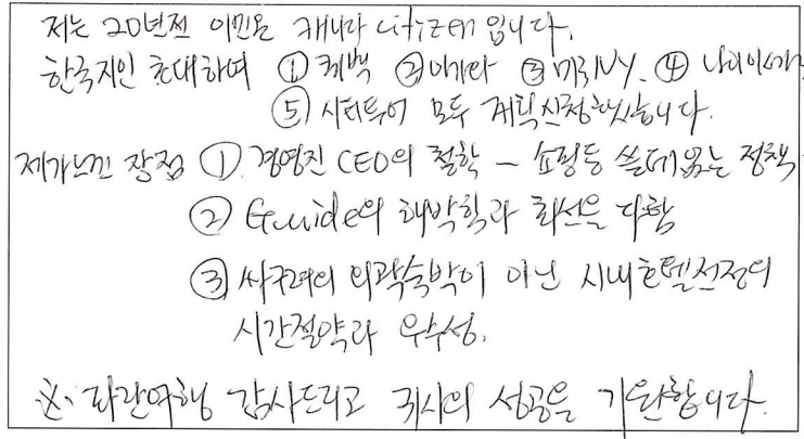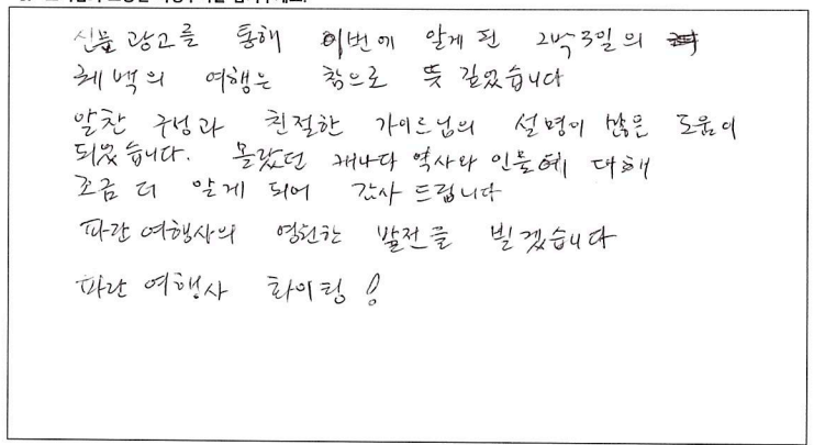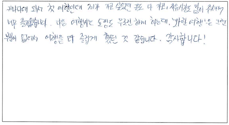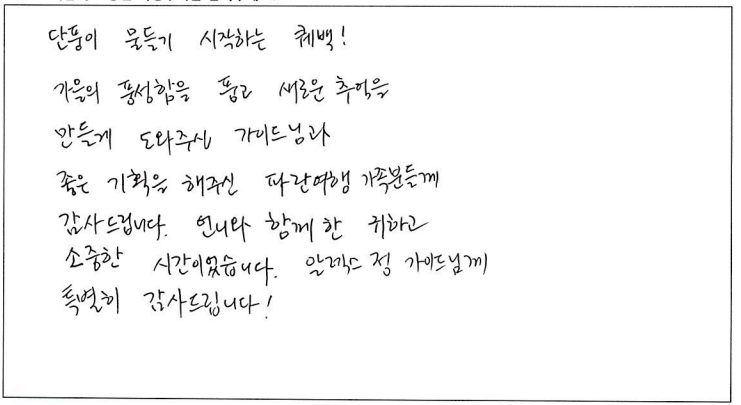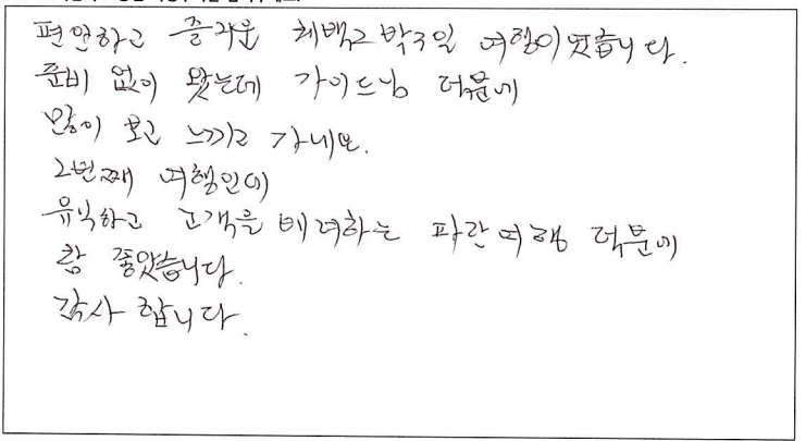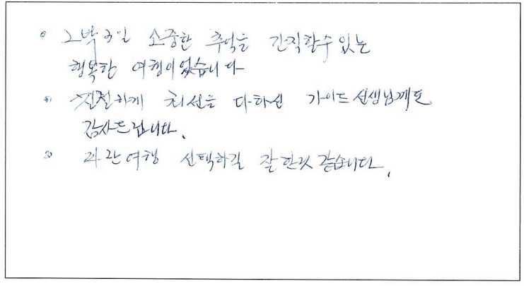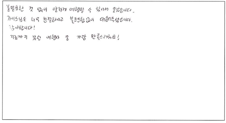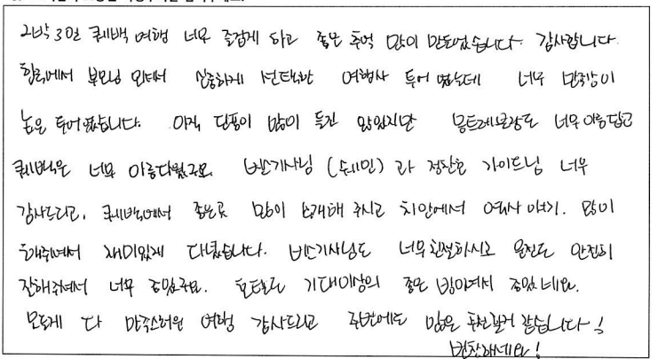 ![]() 시어머님 칠순 기념으로 다녀온 2박3일 퀘벡 여행을 알차고 편하게 다녀오게 되어 너무 감사드립니다. 여행 일정마다 정성껏 준비하신 것을 느낄 수 있었습니다. 맛있는 식사와 깨끗하고 편안한 호텔에서 바쁜 일정 중에도 쉬었다 간다는 느낌을 가질 수 있었습니다. 무엇보다 충분한 자유시간 주시고 그 자유시간 동안 무엇을 즐겨야 하는지도 자세하고 쉽게 안내해 주신 가이드님께도 정말 감사드리고 특히 바쁘신 중에도 항상 너무 친절하시게 응답해 주신 가이드님 감사드립니다. ![]() 좋은 여행이었습니다. 한식을 먹을 수 있어서 좋았어요. 호텔도 다운타운에 위치해 있어서 저녁 자유시간에 시내 관광하기에 아주 좋았어요. ![]() 여러 여행사를 검색하고 왔었는데 가장 친절하고 자세하게 알려주셨습니다. 차량과 호텔 모두 좋고 특히 숙소가 좋습니다. 식사 또한 아주 맛있고 관광지의 맛집, 필수 장소 리스트 등을 주셔서 여행이 편안합니다. 특히 퀘벡에서의 자유시간이 길어 20-30대 모두 만족할 것이라 예상합니다. ![]() 불필요한것 없이 알차게 여행할 수 있어서 좋았습니다. 가이드님도 너무 친절하시고 불편함 없이 대해주셨습니다. 감사합니다! 지금까지 갔던 여행사 중 가장 만족스러워요! ![]() 캐나다에 와서 첫 여행인데 제가 가고 싶었던 곳도 다 가고, 자유시간도 많이 주셔서 너무 즐거웠습니다. 다른 여행사는 쇼핑도 무조건 하게 하는데 '파란여행'은 그런 부분이 없어서 여행을 더 즐겁게 했던 것 같습니다. 감사합니다! ![]() 캐나다로 어학연수 와서 퀘벡, 몬트리올, 오타와 다녀오고 힐링되었습니다. 한국가기 전에 뉴욕, 벤쿠버도 파란여행을 이용할 예정인데 기대가 됩니다. 감사합니다. ![]() 가이드님의 차 이동시 해주신 이야기 재미있고 좋았습니다. 퀘벡에서 많은 자유시간 좋았습니다. 좋은 추억 갖고 갑니다. 감사하고 가이드님 수고 하셨습니다. ![]() 2박3일 소중한 추억을 간직할 수 있는 행복한 여행이었습니다. 친절하게 최선을 다하신 가이드 선생님께도 감사드립니다. 파란여행 선택하길 잘 한것 같습니다. ![]() 저는 20년전 이민온 캐나다 citizen입니다. 한국지인 초대하여 퀘벡, 아가와, 미국 NY, 나이아가라, 시티투어 모두 신청했습니다. 제가 느낀 장점. 1. 경영진 CEO의 철학 쇼핑등 쓸데없는 정책이 없는 점 2.Guide의 해박함과 최선을 다한 점 3. 싸구려의 외곽 숙박이 아닌 시내 호텔 선정으로 시간절약과 우수성 파란여행 감사드리고 귀사의 성공을 기원합니다. ![]() 2박3일 동안 몬트리올, 퀘벡의 핵심 스팟들 모두 다녀올 수 있어서 좋았어요. 무엇보다 패키지여행하면 강요 쇼핑이 제일 싫었는데 파란여행 패키지에는 쇼핑을 강요하지 않아서 마음에 들었어요. 가이드님도 사소한 것 하나하나 꼼꼼히 챙겨주시고 해박한 자식을 가지셔서 재미있게 풀어주셔서 이동시간이 지루하지 않았아요. 2박3일 동안 고생 많으셨어요. 감사합니다.^^ ![]() 8살 아이 생일기념 여행을 고민하다가 주변분들 추천으로 파란여행 통한 퀘벡여행을 선택했습니다. 오타와, 몬트리얼, 퀘벡, 천섬 등 주요 관광지를 알차게 다니고 무엇보다 좋았던건 중간중간 가이드님의 해당지역에 대한 역사, 유래 등과 같은 주옥같은 설명이었습니다. 짧은시간, 많은것을 보고 듣고 느끼고 알게된 여행이었습니다. 저도 아이도 오랫동안 기억에 남을 추억을 만들어 주셔서 감사합니다. ^^ ![]() 신문광고를 통해 이번에 알게 된 2박3일의 퀘벡여행은 참으로 뜻 깊었습니다. 알찬 구성과 친절한 가이드님의 설명이 많은 도움이 되었습니다. 몰랐던 캐나다 역사와 인물에 대해 조금 더 알게 되어 감사드립니다. 파란여행의 영원한 발전을 빌겠습니다. 파란여행 화이팅! ![]() 단풍이 물들기 시작하는 퀘벡! 가을의 풍성함을 품고 새로운 추억을 만들게 도와주신 가이드님과 좋은 기획을 해주신 파란여행 가족분들께 감사드립니다. 언니와 함께 한 귀하고 소중한 시간이었습니다. 가이드님께 특별히 감사드립니다. ![]() 편안하고 즐거운 퀘벡2박3일 여행이었습니다. 준비 없이 왔는데 가이드님 덕분에 많이 보고 느끼고 가네요. 2번째 여행인데 유익하고 고객을 배려하는 파란여행 덕분에 참 좋았습니다. 감사합니다. ![]() 2박3일 퀘벡여행 너무 즐겁게 하고 좋은 추억 많이 만들었습니다. 감사합니다. 한국에서 부모님 오셔서 신중하게 선택한 여행사 투어였는데 너무 만족감이 높은 투어였습니다. 아직, 단풍이 많이 들진 않았지만 몽트랑블랑도 너무 아름답고 퀘벡은 너무 아름다웠구요. 버스기사님과 가이드님 너무 감사드리고 퀘벡에서 좋은 곳 많이 소개해 주시고 차안에서 역사 이야기, 많이 해주셔서 재미있게 다녔습니다. 기사님도 너무 친절하시고 운전도 안전히 잘해주셔서 너무 좋았구요. 호텔도 기대이상의 좋은 방이여서 좋았네요. 모든게 다 만족스러운 여행 감사드리고 주변에도 많이 추천할것 같습니다! 번창하세요! |