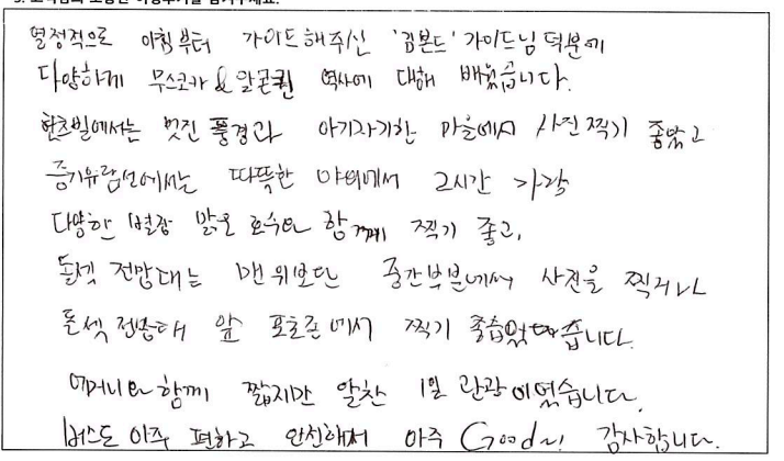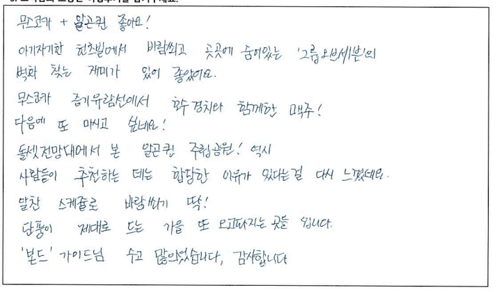 ![]() 무스코카 일일여행 무척 즐거웠으며 가이드님의 설명, 유머, 위트에 시간가는 줄 모르게 하루를 보냈습니다. 지인의 소개로 파란여행을 처음 이용해보았는데 서비스 최고, 가이드 최고, 차량운전 최고. 캐나다에서는 파란여행 최고입니다. 많은 지인들에게 추천하고 싶습니다. 고맙고 즐거운 하루였습니다. 파란여행의 무궁한 발전을 기도하겠습니다. ![]() 코비드 이후 첫 여행사를 통한 여행이었습니다. 오랜만에 패키지 여행을 하니 새롭네요. 제가 파란여행 상품 여행이 이번에 네번째인데요. 가이드님처럼 많은 정보를 주시는 분은 처음인것 같습니다. 덕분에 더 유익한 여행이 되었습니다. 감사합니다. ![]() 즐거운 하루였습니다. 캐나다의 새로운 역사 공부를 한것 같아 넘 좋았습니다. 보이는 것이 호수와 넓은 들판 참으로 많은 것을 가진나라 또 오고 싶습니다. 가이드에게 감사드립니다. ![]() 무스코카 + 알곤퀸 좋아요! 아기자기한 헌츠빌에서 바람쐬고 곳곳에 숨어있는 그룹오브세븐의 벽화 찾는 재미가 있어 좋았어요. 무스코카 증기 유람선에서 호수경치와 함께한 맥주! 돌셋전망대에서 본 알곤퀸 주립공원! 역시 사람들이 추천하는 데는 합당한 이유가 있다는걸 다시 느꼈네요. 알찬 스케줄로 바람쐬러 딱! 단풍이 제대로 드는 가을 또 오고 싶어지는 곳들 입니다. 가이드님 수고 많으셨습니다. 감사합니다. ![]() 맑고 화창한 날씨속에 그리고 개구장이 같은 가이드님과 함께한 가을 여행 힐링하고 돌아갑니다. 감사합니다. 즐거운 여행이었습니다! ![]() <헌츠빌-무스코카-증기유람선-돌셋전망대> 캐나다에 사는 큰언니 보러 왔다가 언니가 예약해준 '무스코카+알곤퀸 1일' 투어를 혼자 하게 됐어요. 가이드님의 유쾌한 소개를 시작으로 캐나다의 역사와 여행지 소개를 재밌게 들으며 여행을 했습니다. 헌츠빌은 아기자기한 마을에 호수가 있어서 너무 예뻣구요- 무스코카 증기유람선을 시원한 바람 맞으며 커피도 마시고 풍경을 보느라 시간가는 줄 몰랐어요. 갑자기 추워진 날씨 때문에 걱정했는데 햇빛이 나서 딱 좋은 날씨로 여행할 수 있었네요. 도시락을 미리 주문했었는데 제육볶음이 나와서 맛있게 먹었어요. 마지막 돌셋전망대는 끝까지 올라가는 건 무서워서 중간까지만 갔는데요 풍경이 너무 예뻤어요~ 이동하면서 힘드실텐데 가이드님께서 끝까지 유머러스하게 얘기해주셔서 너무 감사했습니다. 다음주 퀘벡 여행가서 못 만나 아쉽지만 다시 캐나다 놀러올 때 만나게 되면 너무 반가울거 같아요~ 오늘 하루 고생 많으셨습니다. ![]() 열정적으로 아침부터 가이드해주신 가이드님 덕분에 다양하게 무스코카+알곤퀸 역사에 대해 베웠습니다. 헌츠빌에서는 멋진 풍경과 아기자기한 마을에서 사진찍기 좋았고 증기유람선에서는 따뜻한 야외에서 2시간 가량 다양한 별장 맑은 호수와 함께 찍기 좋고, 돌셋 전망대는 맨 위보단 중간 부분에서 사진을 찍거나 돌셋 전망대 앞 포토존에서 찍기 좋았습니다. 어미나와 함께 짧지만 알찬 1일 관광이었습니다. 버스도 아주 편하고 안전해서 아주 Good~! 감사합니다. ![]() 좋은 날, 좋은 동승자, 좋은 가이드와 행복한 시간 보냈습니다. |