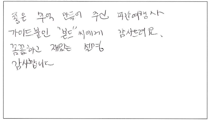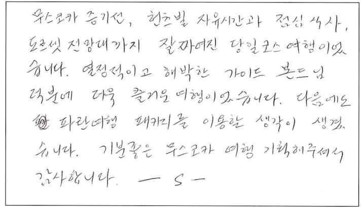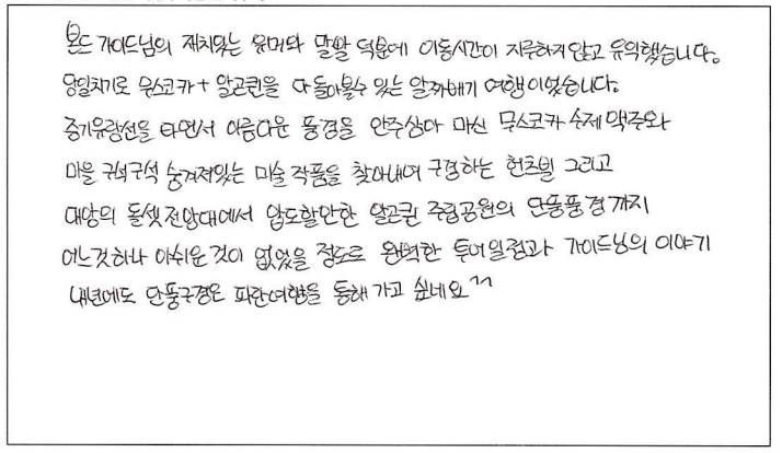 ![]() 가이드님의 재치있는 유머와 말빨 덕분에 이동시간이 지루하지 않고 유익했습니다. 당일치기로 무스코카+알곤퀸을 다 돌아볼 수 있는 알짜베기 여행이었습니다. 증기유람선을 타면서 아름다운 풍경을 안주삼아 마신 무스코카 수제맥주와 마을 구석구석 숨겨져 있는 미술 작품을 찾아내며 구경하는 헌츠빌 그리고 대망의 돌셋전망대에서 압도할 만한 알곤퀸 주립공원의 단풍풍경까지 어느것 하나 아쉬운것이 없었을 정도로 완벽한 투어일정과 가이드님의 이야기. 내년에도 단풍구경은 파란여행을 통해 가고 싶네요^^ ![]() 오랜만에 여행이라 기대와 설렘으로 시작해 만족스런 여행이 되었습니다. 가이드님의 열정넘치는 말씀이 활력을 준것 또한 좋았습니다. ![]() 좋은 추억 만들어 주신 파란여행사 가이드분께 감사드려요. 꼼꼼하고 재밌는 설명 감사합니다. ![]() 무스코카 증기선, 헌츠빌 자유시간과 점심식사, 돌셋 전망대까지 잘 짜여진 당일코스 여행이었습니다. 열정적이고 해박한 가이드님 덕분에 더욱 즐거운 여행이었습니다. 다음에도 파란여행 패키지를 이용할 생각이 생겼습니다. 기분좋은 무스코카 여행 기획해주셔서 감사합니다. ![]() 캐나다에서 첫 가을을 어떻게 보내면 좋을까 고민하다가 "무스코카+알곤퀸 투어"를 신청했습니다. 10월의 첫날, 아직 단풍을 보기엔 조금 이른감이 있어 아쉬웠는데 초록, 노랑, 빨강이 어우러저 친구들과 멋진 추억을 남길 수 있었습니다. 알곤퀸에서의 시간이 조금 짧았던것 빼고는 하루를 매우 알차게 보낼 수 있었던 여행이었습니다. 또한, 이동시간마다 캐나다의 역사, 도시이름의 유래, 원주민들과 얽힌 역사 이야기를 들려주셔서 눈도, 귀도 즐거운 시간이었습니다. ![]() 3곳의 관광지를 힘들이지 않고 쉽고 즐겁게 잘 보냈습니다. 시간 배분도 좋았고 Guide님 설명도 즐겁게 들었습니다. ![]() 아주 즐거운 여행이었습니다. 친절한 가이드님의 풍부한 설명으로 더욱 뜻깊은 시간이었습니다. 무스코카 유람선 여행과 아직 다 물들진 않았지만 단풍도 아름다웠습니다. 안전운전 해주신 기사님께도 감사드립니다. ![]() 캐나다에서 처음 하는 단체 패키지 여행인데 만족스럽게 잘 즐겼습니다. 가이드님 설명도 너무 유익하고 좋았어요. 이번에는 친구와 왔지만 다음번에는 가족들과도 함께 오고 싶습니다. |