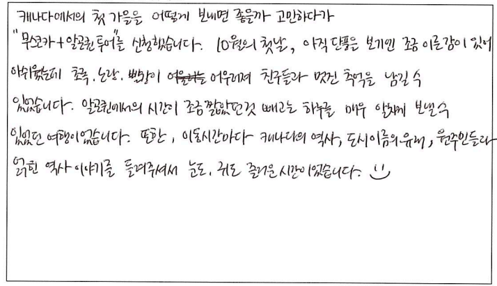 제목 | 2022년10월01일 출발 무스코카+알곤퀸1일 자필후기 | ||