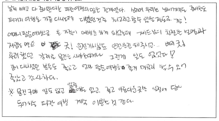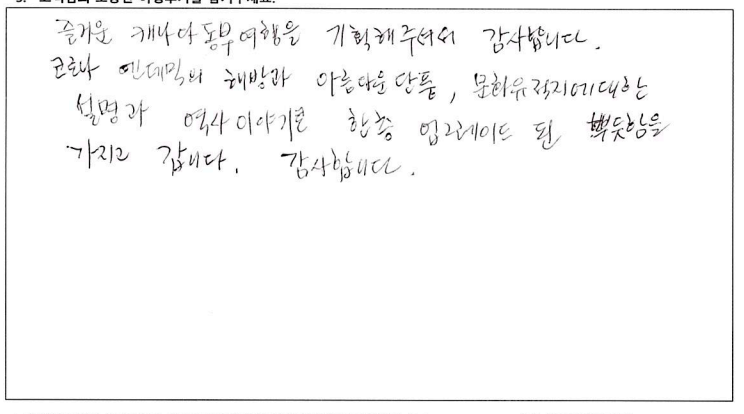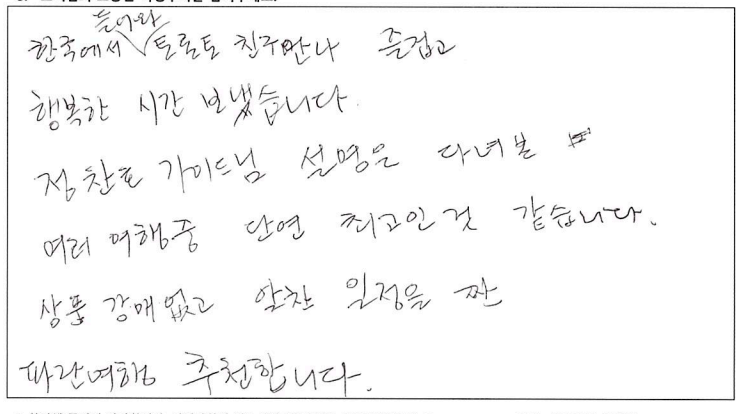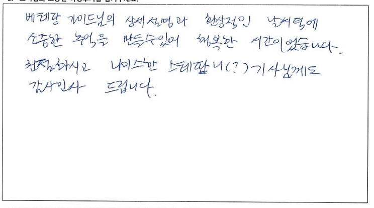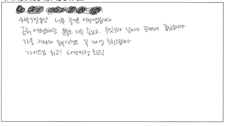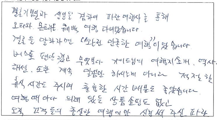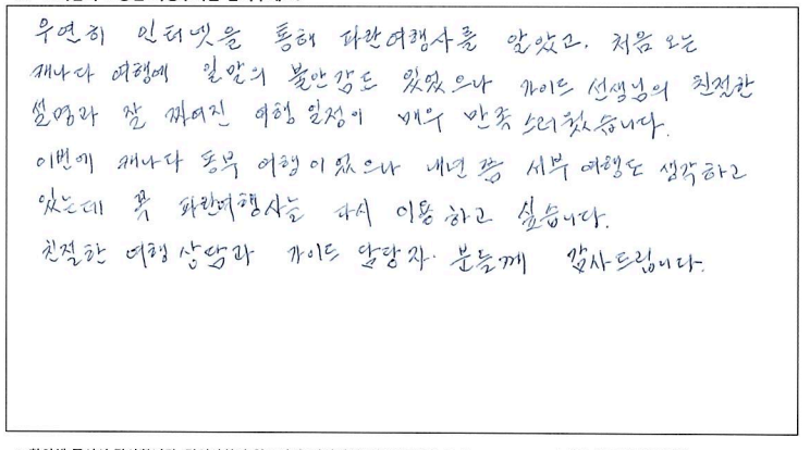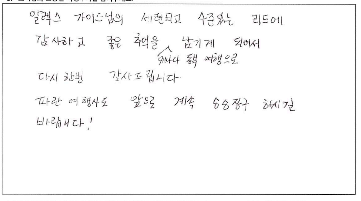 ![]() 날씨 빼고 다 준비한다는 파란여행의 말은 진짜였다. 심지어 우리는 날씨까지도 준비한듯. 패키지 여행을 가끔 다니는데 다녔던 것 중 최고라고 할 수 있을 정도로 짱! 어머니 팔순여행으로 온 가족이 여행을 하게 되었는데 가이드님의 친절한 설명과 재밌는 멘트 굿! 운전기사님도 안전운전 해주시고 베리 굿! 우려했던 강제로 물건을 사야한다거나 그런게 일도 없었다! 같이 다니셨던 분들도 좋았고 엄마 팔순여행을 좋게 마무리 할 수 있어 좋았고 감사하다. *물건 구매 1도 없고 일정에도 없고 좋고 아름다운 곳만 일정에 담아 투어하는 파란여행 계속 이용할 것 같다. ![]() 여행상품기획이 좋았어서 또 한번 왔어요. :D 2박3일 동안 또 좋은 추억 쌓고 갑니다. ![]() ![]() 4박5일 동안 너무 즐거운 여행이었습니다. 같이 여행하시는 분들도 너무 좋았고 무엇보다 날씨가 끝내주게 좋았습니다. 가을 캐나다 동부여행은 꼭 가시길 추천드립니다. 가이드님 최고! 파란여행 최고! ![]() 즐거운 캐나다 동부여행을 기획해주셔서 감사합니다. 코로나 펜데믹의 해방과 아름다운 단풍, 문화유적지에 대한 설명과 역사이야기들. 한층 업그레이드 된 뿌듯함을 가지고 합니다. 감사합니다. ![]() 베테랑 가이드님의 상세설명과 환상적인 날씨덕에 소중한 추억을 만들 수 있어 행복한 시간이었습니다. 친절하시고 나이스한 기사님께도 감사인사 드립니다. ![]() 소중한 추억이 될 기분 좋은 여행이 되었다. 가이드의 친절한 설명으로 캐나다의 정보를 이것저것 알게되어 기회되면 또 다시 캐나다에 와 봐야겠다는 생각이 든다. 그때 다시 파란여행을 만나게 될 것 같다. ![]() 여고 졸업반 친구와 수십년을 지나... 이제야 추억을 만들었네요. 좋은 곳, 좋은 날씨, 친절하신 가이드분의 도움으로 많은 기억 간직하고 갑니다. 감사합니다. ![]() 알렉스 가이드님의 세련되고 수준있는 리드에 감사하고 좋은 추억을 캐나다 동부 여행으로 남기게 되어서 다시한번 감사드립니다. 파란여행도 앞으로 계속 승승장구 하시길 바랍니다! ![]() 겸손한 자부심이라는 표현을 쓸 수 있다면 파란여행의 가이드님께 쓰고 싶다. 여행 시작부터 끝까지 너무나 겸손한 자세로 우리를 인도하면서 다른 어떤 여행사 보다도 최선을 다하고 있다는 소신을 보여주었기 때문이다. 광활한 캐나다를 여행하기 위해 파란여행을 선택했건 것도 옳은 선택이었음을 여행을 마치는 지금 자신있게 말할 수 있다. 덕분에 참 행복했다. 감사합니다. ![]() 한국에서 들어와 토론토 친구 만나 즐겁고 행복한 시간 보냈습니다. 가이드님 설명은 다녀본 여러 여행중 단연 최고인것 같습니다. 상품 강매 없고 알찬 일정을 짠 파란여행 추천합니다. ![]() 우연히 인터넷을 통해 파란여행사를 알았고 처음오는 캐나다 여행에 일말의 불안감도 있었으나 가이드 선생님의 친절한 설명과 잘 짜여진 여행일정이 매우 만족스러웠습니다. 이번에 캐나다 동부 여행이었으나 내년 쯤 서부 여행도 생각하고 있는데 꼭 파란여행을 다시 이용하고 싶습니다. 친절한 여행 상담과 가이드 담당자 분들께 감사드립니다. ![]() 결혼기념일과 생일을 겸하여 파란여행을 통해 오타와, 몬트리올, 퀘벡 여행 다녀왔습니다. 결론을 말하자면 "완전 만족한 여행:" 이었습니다. 버스도 편안했고 무엇보다 가이드님의 여행지 소개, 역사, 해설 또한 계속 말씀만 하시는게 아니라 적절한 휴식시간도 주시며 훌륭한 시간배분도 좋았습니다. 여행 때 마다 의례 있는 상품쇼필도 없고 오직 고객들의 충실한 여행에만 신경써 주신 파란여행에 감사드립니다. ![]() 3년전에 토론토의 친척이 여행상품 (토론토 시내 1일, 나이아가라 1일, 뉴욕 1박2일)을 예약해 주어 이용한 바가 있습니다. 팬데믹 이후 3년만에 제가 직접 파란여행에 연락하여 이번 여행을 신청했습니다. 왜냐하면 쇼핑일정 같은 것 없이, 간결하게 최대한 공을 들인 여행상품 이기 때문입니다. 이번 퀘벡여행도 대단히 밀도있는 여행이었습니다. 메이플로드 800km가 포함된 2400km의 여행에서 공유/ 김고은이 나오는 드라마 도깨비의 퀘벡에서의 촬영지도 다 가봤는데, 퀘벡 시티 여행에 앞서 퀘벡 현지로케의 장면만 간추린 영상을 보여주신 것도 이번 여행의 최고로 인상적인 부분입니다. |