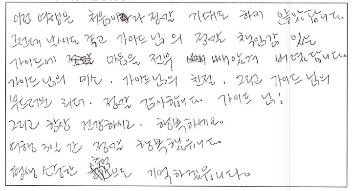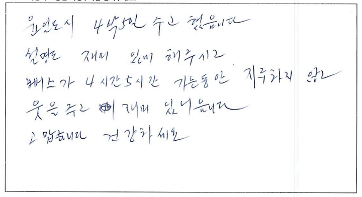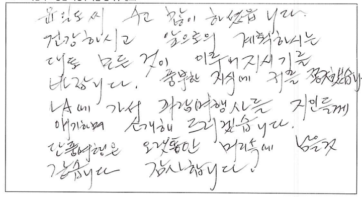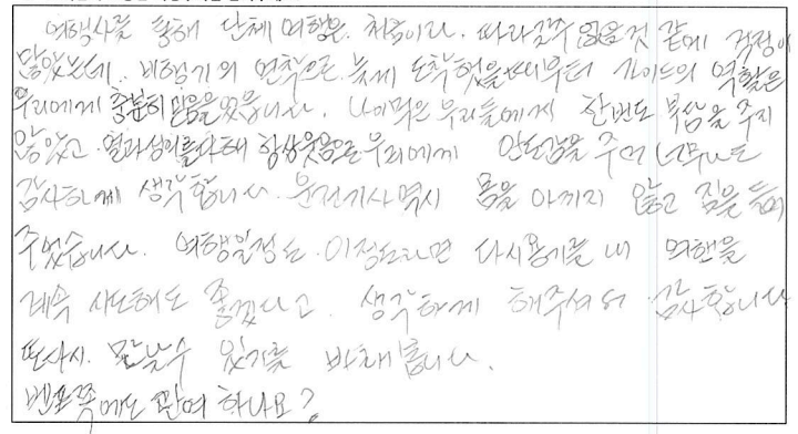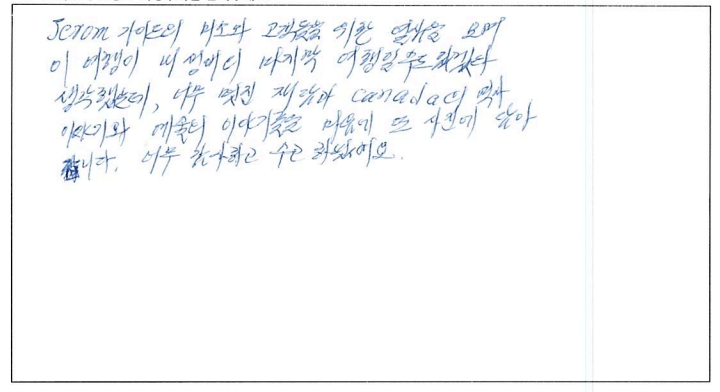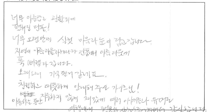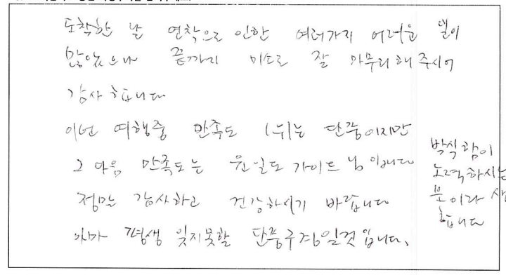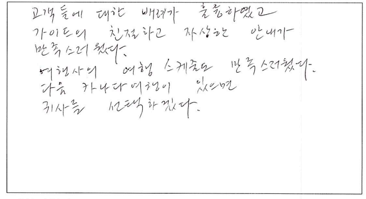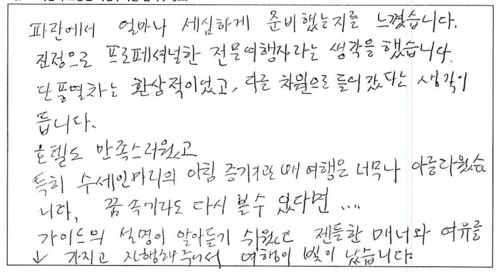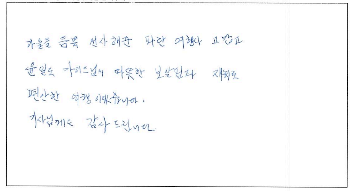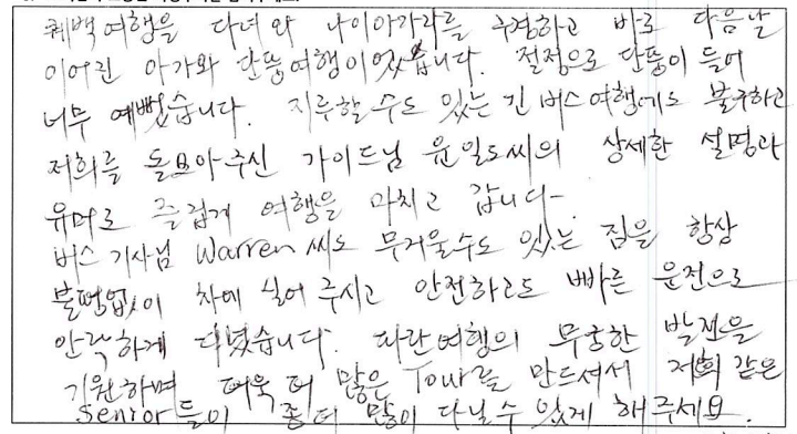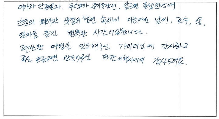 ![]() 감히 어떤 단어가 이렇게 아름다운 단풍을 표현할 수 있을까요. '아름답다'라는 말로는 부족한, 과연 이게 현실인가라는 생각이 들 정도의 단풍이었습니다. 너무 아름다워서 눈물이 날 정도였으니까요^^ 잔잔한 호수와 아름다운 단풍과 마을이 어우러진 '무스코카 호수'부터 8시간 기차여행 동안 창문에서 눈을 뗄수 없고 자연의 경이로움을 알려준 '아가와캐년'. 신이 화가였다면 색깔을 칠해놓았을까요 싶은 '알곤퀸 파크'까지,,, 제 평생 잊지 못할 단풍여행이었습니다. 2박3일 동안 "가이드는 이런 사람이다"를 직접 보여준 가이드님께 감사드립니다. 여행지식이면 지식, 유머면 유머, 재치면 재치, 뭐 하나 부족하지 않았습니다. 앞으로 전승하시길^^ 그리고 긴 거리 운전 뿐만 아니라 여행객들에게도 친절하고 다정하게 대해 준 기사님께도 감사드립니다. ![]() 퀘벡 여행을 다녀와 나이아가라를 구경하고 바로 다음날 이어진 아가와 단풍여행이었습니다. 절정으로 단풍이 들어 너무 예뻤습니다. 지루할 수도 있는 긴 버스여행에도 불구하고 저희를 돌보아주신 가이드님의 상세한 설명과 유머로 즐겁게 여행을 마치고 갑니다. 버스 기사님도 무거울수도 있는 짐을 항상 불편없이 차에 실어 주시고 안전하고고 빠른 운전으로 안락하게 다녔습니다. 파란여행의 무궁한 발전을 기원하며 더욱 더 많은 tour를 만드셔서 저희같은 Senior들이 좀 더 많이 다닐 수 있게 해주세요. ![]() 이런 여행은 처음이라 정말 기대도 하지 않았답니다. 그런데 날씨도 좋고 가이드님의 정말 책임감 있는 가이드에 마음을 전부 빼았겨 버렸답니다. 가이드님의 미소, 가이드님의 친절 그리고 가이드님의 부드러운 리드. 정말 감사합니다. 가이드님! 그리고 항상 건강하시고 행복하세요. 여행 3일간 정말 행복했습니다. 평생 소중한 추억으로 기억하겠습니다. ![]() 여행사를 통해 단체 여행은 처음이다. 따라갈수 없을 것 같아 걱정이 많았는데 비행기의 연착으로 늦게 도착했을 때 부터 가이드의 역할은 우리에게 충분히 믿음을 주었습니다. 나이먹은 우리들에게 한번도 부담을 주지 않았고 열과 성을 다해 항상 웃음으로 우리에게 안도감을 주어 너무나도 감사하게 생각합니다. 운전기사 역시 몸을 아끼지 않고 짐을 들어 주었습니다. 여행일정도 이정도라면 다시 용기를 내 여행을 계속 시도해도 좋겠다고 생각하게 해주셔서 감사합니다. 또 다시 만날 수 있기를 바래봅니다. ![]() 파란에서 얼마나 세심하게 준비했는지를 느꼈습니다. 진정으로 프로페셔녈한 전문 여행사라는 생각을 했습니다. 단풍열차는 환상적이었고 다른 차원으로 들어간다는 생각이 들었습니다. 호텔도 만족스러웠고 특히 수세인트마리의 아침 증기유람선 여행은 너무나 아름다웠습니다. 꿈속에라도 다시 볼 수 있다면... 가이드의 설명이 알아듣기 쉬웠고 젠틀한 매너와 여유를 가지고 진행해 주셔서 여행이 빛이 났습니다. ![]() 가이드의 미소와 고객들을 위한 열정을 보며 이 여행이 내 생애의 마지막 여행일 수도 있겠다 생각했는데 너무 멋진 재담과 캐나다의 역사이야기와 예술 이야기를 마음에, 또 사진에 담아 갑니다. 너무 감사하고 수고하셨어요. ![]() 캐나다 단풍기차 여행을 즐겁고 뜻깊게 장식하게 되어 기쁩니다. 알곤퀸 파크와 Agawa Train, 300계단. 오랜만에 어린시절 친구와 같이하며 감격스럽기까지 했습니다. 우리모두 단풍잎처럼 고운 색깔로 살아가기를 기원합니다. 감사합니다. ![]() 가이드님 4박5일 수고 했습니다. 설명도 재미있게 해주시고 버스가 4시간, 5시간 가는 동안 지루하지 않고 웃음 주고 재미있었습니다. 고맙습니다. 건강하세요. ![]() 좋은 계절에 좋은 곳을 안내해 주셔서 즐거운 여행을 했음을 감사하게 생각합니다. ![]() 도착한 날 연착으로 여러가지 어려운 일이 많았으나 끝까지 미소로 잘 마무리 해주셔서 감사합니다. 이번 여행 중 만족도 1위는 단풍이지만 그 다음 만족도는 가이드님 입니다. 정말 감사하고 건강하시길 바랍니다. 박식하시고 노력하시는 분이라 생각합니다. 아마 평생 잊지 못할 단풍구경일 것입니다. ![]() 가이드님 수고 많이 하셨습니다. 건강하시고 앞으로의 계획하시는 대로 모든 것이 이루어지시기를 바랍니다. 풍부한 지식에 귀를 쫑긋했습니다. LA에 가서 파란여행을 지인들께 얘기하며 소개해 드리겠습니다. 단풍여행은 오랫동안 머릿속에 남을 것 같습니다. 감사합니다. ![]() 가을을 듬뿍 선사해준 파란여행 고맙고 가이드님의 따뜻한 보살핌과 재치로 편안한 여행이었습니다. 기사님께도 감사드립니다. ![]() 아가와 단풍열차, 무스코카 증기유람선, 알곤퀸 돌셋전망대 단풍의 화려한 색깔의 향연 속에서 아름다운 날씨, 호수, 숲, 열차를 즐긴 행복한 시간이었습니다. 편안한 여행을 인도해주신 가이드님께 감사하고 좋은 프로그램 만들어주신 파란여행에 감사드려요. ![]() 너무 아름답고 광활하게 펼쳐진 단풍! 너무 오랜만에 실컷 마음과 눈에 담고 갑니다. 자연에 아름다움과 캐나다 단풍의 아름다움에 푹 빠졌다 갑니다. 오래오래 기억될것 같네요. 친절하고 따뜻하게 안내해주신 가이드님! 이동하는 동안 지루