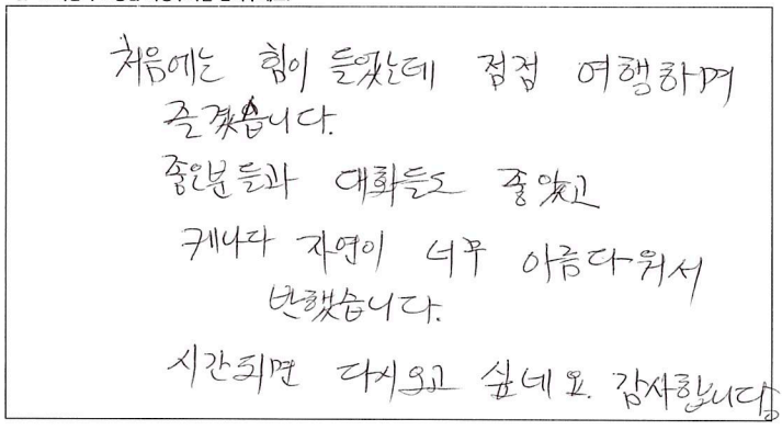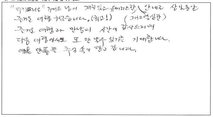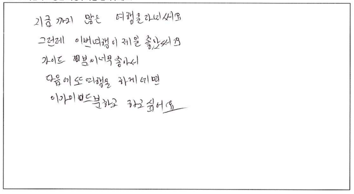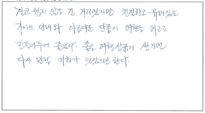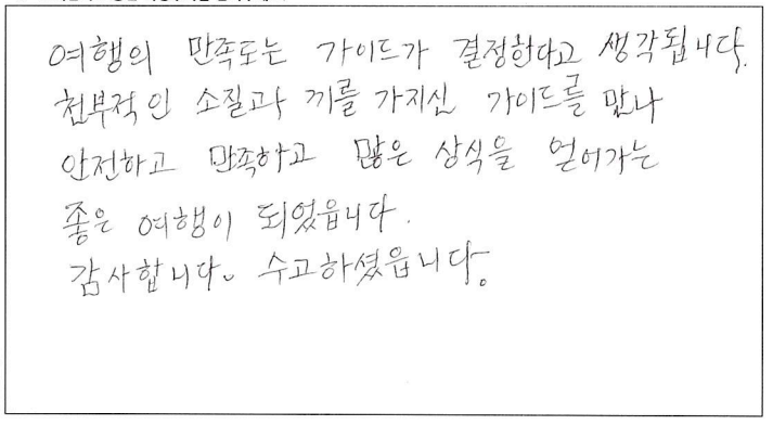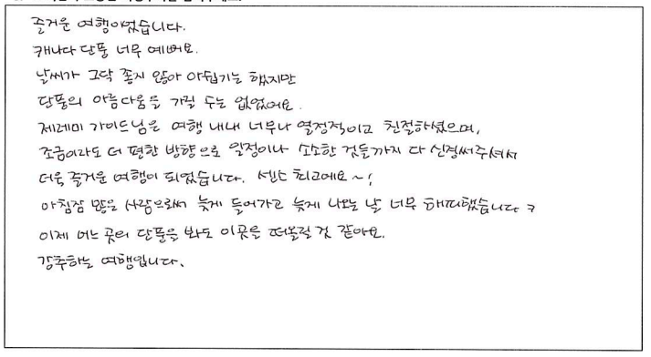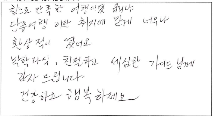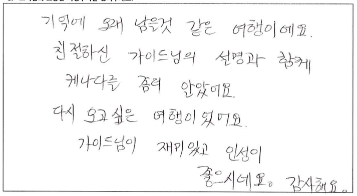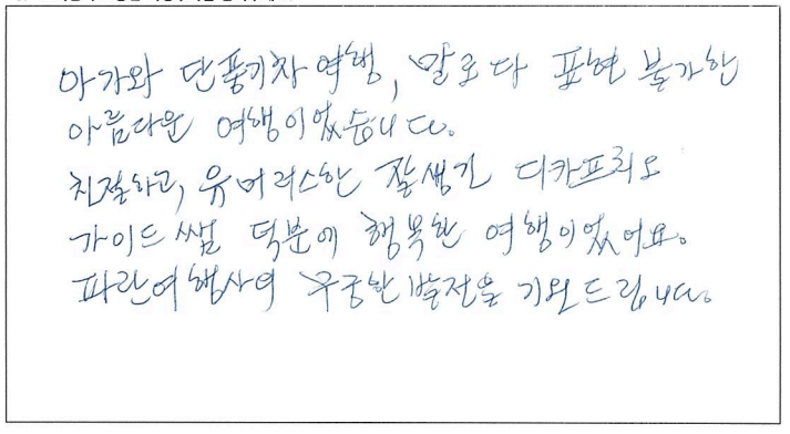 ![]() 무엇을 상상하던 그 이상인 여행! 가이드님과 함께한 투어는 10점 만점에 10점! 10월 7일, 8일, 9일. 서울에서 부터 걱정했던 우려를 다 날려버린 완벽한 여행. 완벽한 단풍! 완벽한 단풍! ![]() 지금까지 많은 여행을 다녔어요. 그런데 이번여행이 제일 좋았어요. 가이드분이 너무 좋아서 다음에 또 여행을 하게되면 이 가이드 분하고 하고 싶어요. ![]() 아가와 단풍기차여행, 말로 다 표현 불가한 아름다운 여행이었습니다. 친절하고, 유머러스한 잘생긴 가이드쌤 덕분에 행복한 여행이었어요. 파란여행의 무궁한 발전을 기원드립니다. ![]() 즐거운 여행이었습니다. 캐나다 단풍 너무 예뻐요. 날씨가 그닥 좋지 않아 아쉽기는 했지만 단풍의 아름다움을 가릴 수는 없었어요. 가이드님은 여행 내내 너무나 열정적이고 친절하셨으며 조금이라도 더 편한 방향으로 일정이나 소소한 것들까지 다 신경써주셔서 더욱 즐거운 여행이 되었습니다. 센스 최고에요~! 아침잠 많은 사람으로서 늦게 들어가고 늦게 나오는날 너무 해피했습니다. ㅋ 이제 어는 곳의 단풍을 봐도 이곳을 떠올릴 것 같아요. 강추하는 여행입니다. ![]() 기억에 오래 남을 것 같은 여행이에요. 친절하신 가이드님의 설명과 함께 캐나다를 좀 더 알았어요. 다시 오고 싶은 여행이었어요. 가이드님이 재미있고 인성이 좋으시네요. 감사합니다. ![]() 결코 쉽지 않은 긴 거리였지만 친절하고 유머있는 가이드 안내와 아름다운 단풍이 여행을 최고로 만들어 주어 좋았다. 좋은 여행상품이 생기면 다시 만날 기회가 있었으면 한다. ![]() 여행의 만족도는 가이드가 결정한다고 생각됩니다. 천부적인 소질과 끼를 가지신 가이드를 만나 안전하고 만족하고 많은 상식을 얻어가는 좋은 여행이 되었습니다. 감사합니다. 수고 하셨습니다. ![]() 너무 즐거웠습니다. 가슴에 담고 갑니다. 잊을 수가 없겠어용 ![]() 멋진 단풍여행이었어요. 오랫동안 기억에 남을 거 같아요. 가이드님, 자세한 설명과 친절한 안내 감사합니다. 건강하세요. ![]() 가이드님의 재치있고 유머러스한 그리고 열심이신 안내로 삼일동안 즐거운 여행이었습니다. 최고! 즐거운 여행과 만남의 시간에 감사드리며 다음 여행에서도 또 만날 수 있기를 기대합니다. 예쁜 단풍을 추억속에 담고 갑니다. ![]() 아름다운 캐나다 단풍이 저를 너무 행복하게 했습니다. 다시한번 오고싶은 여행이었습니다. 가이드께서 차분하게 설명도 잘해주시고 항상 웃는 모습이 보는 이들을 행복하게 해주셨어요. 수고 많으셨습니다. ![]() 아름다운 캐나다 단풍이 저를 너무 행복하게 했습니다. 다시한번 오고 싶은 여행이었습니다. 가이드님께서 차분하게 설명도 잘해주시고 항상 웃는 모습이 보는이들을 행복하게 해주셨어요. 수고 많으셨습니다. ![]() 소중한 시간이었습니다. 감사를 드립니다. 특별히 가이드님과 섬세한 기사님께 감사를 드립니다. 여행사의 발전을 기원합니다. 감사합니다. ![]() 처음에는 힘이 들었는데 점점 어행하며 즐거웠습니다. 좋은분들과 대화들도 좋았고 캐나다 자연이 너무 아름다워서 반했습니다. 시간되면 다시오고 싶네요. 감사합니다. ![]() 이번 단풍여행(기차)는 정말 좋은 추억으로 간직하고 가겠습니다. 모든 일정을 위해 수고해주신 가이드님께 감사하고 수고 많이 하셨습니다. 덕분에 여탸까지 체험하지 못한 아름다운 풍경에 흠뻑 젖었습니다. 눈과 가슴에 가득하고 넘치게 담아 갑니다. 감사합니다. 또 기사님의 안전한 운전으로 안전하게 즐길 수 있었습니다. 감사드립니다. ![]() 좋은 여행을 하게되어 감사했습니다. 시즌에 맞게 단풍을 너무 잘 보았습니다. 잊지못할 추억으로 남을 겁니다. 가이드가 너무 친절하시고 유머러스하셔서 즐거운 여행 하고 돌아갑니다. 가서 친지들에게 많이 애기 할께요. 다시한번 감사드립니다. ![]() 참으로 만족한 여행이었습니다. 단풍여행 이란 취지에 맞게 너무나 환상적이였어요. 박학다식, 친절하고 세심한 가이드님께 감사드립니다. 건강하고 행복하세요. ![]() 긴 여행길 힘들고 지칠만 한데 쉴새없이 즐겁게 해주신 우리의 가이드님. 감사합니다. 덕분에 즐거운 여행이였습니다. |