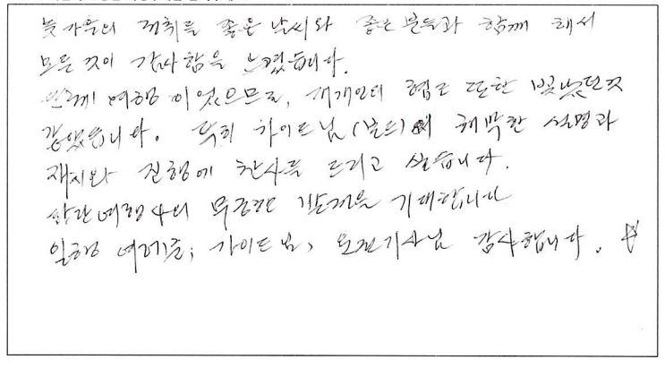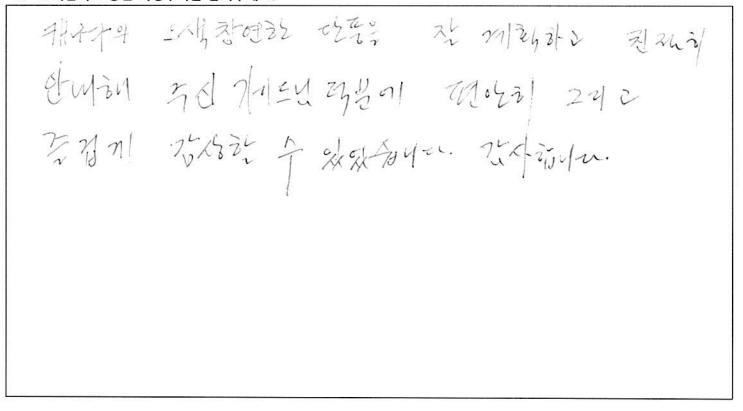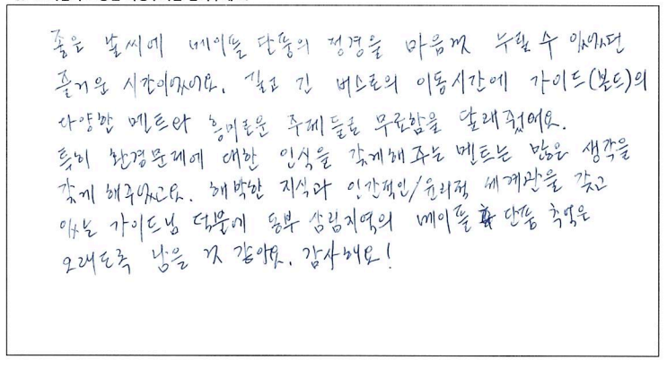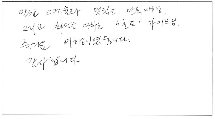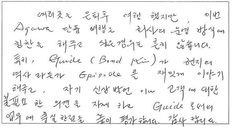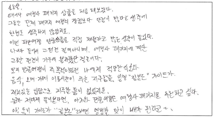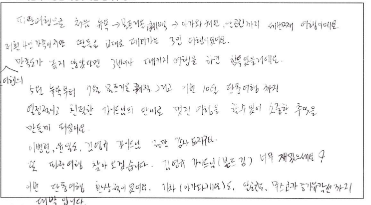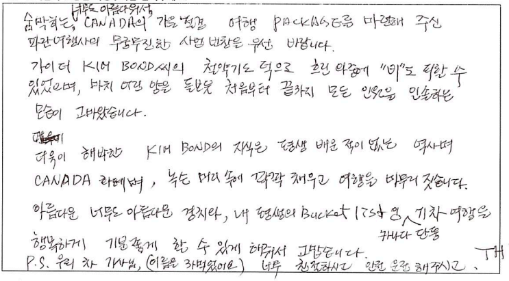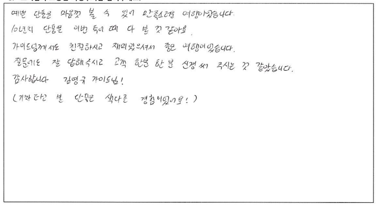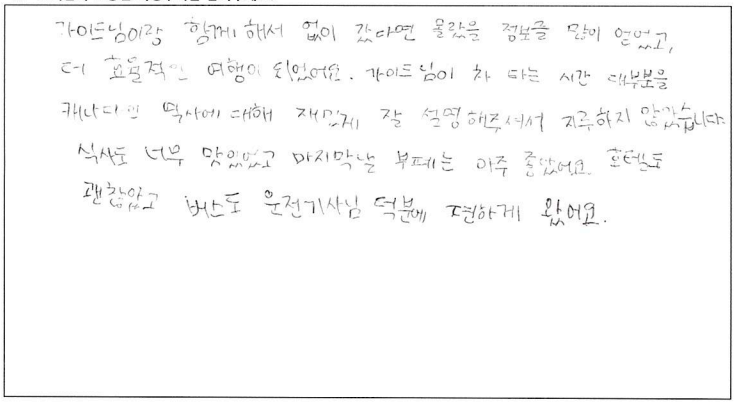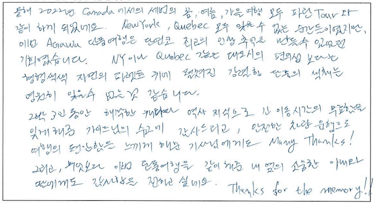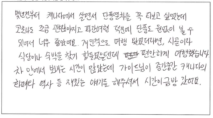![]() 태어나서 이런 단풍은 처음봅니다!! 이 정도일줄은 상상도 못했습니다. 무스코카 유람선은 날씨가 춥고 흐렸지만 선상에서 먹는 칵테일, 예쁜 별장들 그리고 단풍의 조화가 너무 좋아서 날씨 안좋은 것도 잊고 탔습니다!! 둘째날 아가와 캐년으로 가는 단풍열차는 정말정말 대박이었습니다. 왕복 8시간의 긴 여정이 하나도 지겹지 않고 매 순간순간 모든 풍경이 하이라이트였습니다!! 특히 몬트리올 다리 위에서의 풍경은 가을이 되면 매년 추억하고 그리워 할 것 같아요. 알곤퀸 파크도 너무 예쁜 수채화 같은 단풍이 너무 좋았습니다. 관광 스팟들도 아름다웠지만 이동시간에 창밖으로 펼쳐지는 풍경들이 정말 소름돋을 정도로 예뻤습니다. 기억에 아주 오래오래 남을 것 같아요. 가이드님 너무 재밌게 여러가지 이야기 해주셔서 이동 시간동안 지루할 틈 없이 시간이 순삭당했습니다. 여행객을 위한 소소한 배려로 감사드렸습니다. 최고의 가이드!! 그리고 기사님도 너무 친절하시고 안전운전 해주셔서 좋았습니다. 제 인생최고의 단풍여행이었어요. 감사합니다. ![]() 2박3일 아가와 단풍기차와 증기유람선 관광 내 생애 최고의 여행이었습니다. 날씨도 좋았고 가이드님의 풍부한 캐나다 역사, 문화, 정치 너무나도 훌륭한 가이드셨습니다. 단풍기차 안에서 잠시도 쉬지않고 뛰어다니며 일일이 상세한 설명을 해주셔서 오래도록 기억에 남을 것 같습니다. ![]() 아가와 캐년의 2박3일 여행이 역사속으로 사라지다니 못내 아쉬워 지는 시간이다. 정신없이 올라갔던 아가와 캐년에서의 단풍을 평생 잊지 못할 것 같다. 여행 내내 수고해주신 가이드님의 열정에 감사드리고 나를 포함한 49명의 다른 가족들의 건강을 기원하며 아쉬움을 달래본다. ![]() 48살, 태어나 여행사 패키지 상품을 처음 해보았다. 그동안 단체 패키지 여행의 장점보다 단점이 많다는 생각에 한번도 생각하지 않았지요. 이번 파란여행 단풍상품을 직접 체험하고 많은 생각이 들었다. 나이가 들어서 그런건 절대 아니며 여행사 패키지에 대한 그동안 편견이 기우에 불과했다는 결론이다. 오직 단풍여행이 주목적이었던 나에게 적당한 숙소와 음식, 오며 가며 이동시간이 주는 지루함을 가이드가 재치있는 입담으로 지루할 틈이 없었지요. 누군가 저에게 물어본다면 아가와 단풍 여행은 여행사 패키지로 추천하고 싶다. ![]() 가이드님이랑 함께해서, 없이 갔다면 몰랐을 정보를 많이 얻었고 더 효율적인 여행이 되었어요. 가이드님이 차 타는 시간 대부분을 캐나다 역사에 대해 재밌게 잘 설명해 주셔서 지루하지 않았습니다. 식사도 너무 맛있었고 마지막날 부페는 아주 좋았어요. 호텔도 괜찮았고 버스고 운전기사님 덕분에 편하게 왔어요. ![]() 좋은 날씨에 메이플 단풍의 절경을 마음껏 누릴 수 있었던 즐거운 시간이었어요. 길고 긴 버스로의 이동시간에 가이드님의 다양한 멘트와 흥미로운 주제로도 무료함을 달래줬어요. 특히 환경문제에 대한 인식을 갖게 해주는 멘트는 많은 생각을 갖게 해주었고요, 해박한 지식과 인간적이고 윤리적인 세계관을 갖고 있는 가이드님 덕분에 동부 삼림지역의 메이플 단풍 추억은 오래도록 남을 것 같아요. 감사해요! ![]() 몇년 전 부터 캐나다에서 살면서 단풍열차를 꼭 타보고 싶었는데 코로나도 조금 괜찮아지고 파란여행 덕분에 단풍도 원없이 볼 수 있어서 너무 좋았어요. 개인적으로 여행 왔었더라면 시골이라 식당이나 숙박을 찾기 힘들었을 텐데 편안하게 여행했습니다. 차안에서 보내는 시간이 많았는데 가이드님이 중간중간 캐나다의 화폐와 역사 등 재밌는 얘기를 해주셔서 시간이 금방 갔어요. ![]() 늦 가을의 정취를 좋은 날씨와 좋은 분들과 함께 해서 모든것이 감사함을 느꼈습니다. 단체 여행이었으므로 개개인의 협조 또한 빛났던 것 같습니다. 특히 가이드님의 해박한 설명과 재치와 진행에 찬사를 드리고 싶습니다. 파란여행의 무궁한 발전을 기대합니다. 일행 여러분, 가이드님, 기사님, 감사합니다. ![]() 알찬 스케쥴과 멋있는 단풍여행. 그리고 최선을 다하는 가이드님. 즐거운 여행이었습니다. 감사합니다. ![]() 캐나다의 오색창연한 단풍을 잘 계획하고 친절히 안내해 주신 가이드님 덕분에 편안히 그리고 즐겁게 감상할 수 있었습니다. 감사합니다. ![]() 아가와 단풍기차를 타고 캐나다 단풍을 감상할 수 있어서 좋았다. 특히 차량이동시간에 가이드님의 열정적인 설명으로 캐나다 역사와 화폐 인물에 대한 상식도 늘릴 수 있어서 매우 유익한 시간이었다. ![]() 은퇴 후 여러곳을 여행 했지만 이번 Agawa단풍 여행만큼 회사의 운영 방식에 칭찬을 해주고 싶은 경우는 흔치 않습니다. 특히 가이드가 현지의 역사라든가 에피소드를 재밌게 이야기 해주고 자기 신상발언이나 고객에 대한 불필요한 의견을 자제하고 가이드로써의 업무에 충실한점을 높이 평가합니다. 감사합니다. ![]() 너무도 아름다워서 숨막히는 캐나다의 가을 절경 여행 패키지를 마련해 주신 파란여행의 무궁무진한 사업번창을 우선 바랍니다. 가이드님의 철야기도 덕으로 흐린 와중에 비도 피할 수 있었으며 마치 어린 양을 돌보듯
