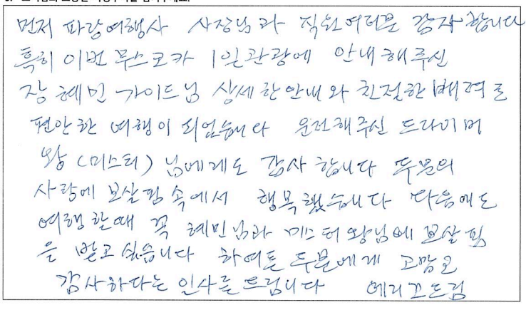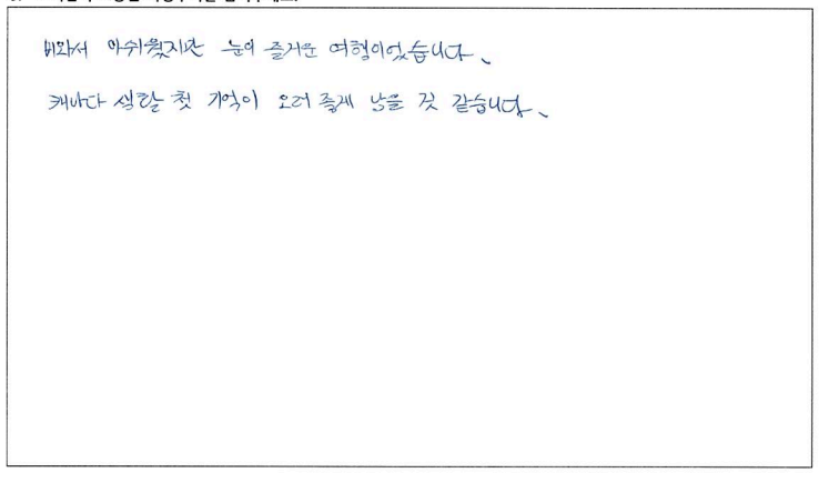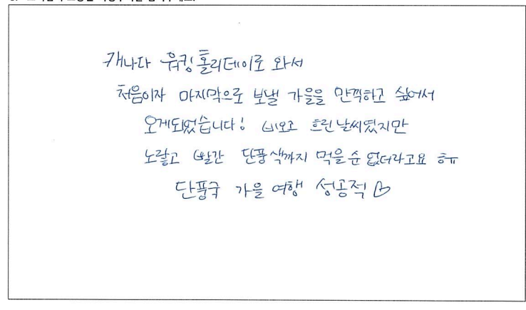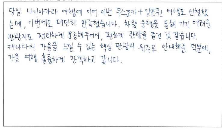 제목 | 2022년10월08일 출발 무스코카+알곤퀸1일 자필후기(2-2호차량) | ||