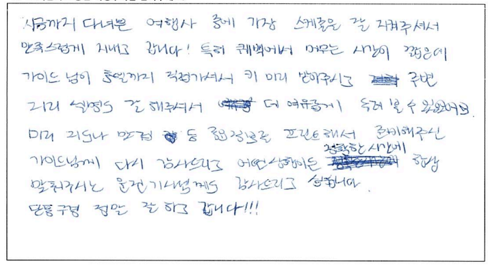 ![]() 부드러운 카리스마를 자랑하시는 파란의 비주얼 가이드님 덕분에 <2박3일 퀘벡 단풍일정> 즐겁게 보내고 갑니다. 패키지 여행이지만 몬트리올, 퀘벡에서 충분한 자유시간이 있어서 너무 좋았어요! 호텔 위치도 너무 좋고, 차량 기사님 다 만족스러웠습니다. 몽트랑블랑 또 가고 싶어용. 사실 파란이랑 4번째 오는 퀘벡 2박3일 이지만 단풍이 너~~무 예뻐서 새로운 기분이라 넘 좋았네욤.>_< 감사합니다. 멸치볶음~~~ ![]() 광고의 내용처럼 날씨 빼고 다 준비했다고 했느데 이번 여행에는 파란여행에서 날씨까지 준비해 주셔서 감사, 감사합니다. 단체 여행이 처음이라 궁금하기도 했는데 여행 첫날 가이드님게서 모두 잊고 힐링의 시간을 보내라고 하셨는데 여행이 감동 그 자체 였습니다. 맑은 미소와 차분한 목소리로 여행지 곳곳을 자세히 설명해 주시고 많은 자료 준비에 자세히 준비한 소개들 모두 여행에 도움이 되었고 잘 짜여신 스케쥴 자유시간 또한 여유롭게 준비하시느라 많은 신경을 쓰신것이 보였고 컴퓨터 처럼 정확한 시간을 지켜내는 것은 오랜 노하우에서 나오는 여유로움이 보였습니다. 기사님의 운전 솜씨, 한번도 후진하며 돌지 않았고 감탄을 자아냈습니다. 단풍여행이 평생 남을 것 같고 다시 한번 더 오고 싶고 가이드님과 함께 하고 싶습니다. 감사하고 사랑합니다. ![]() 첫 퀘벡, 몬트리올 여행이었는데 좋은 가이드 분을 만나 행복한 기억 가득 안고 갑니다! 빠쁜 일상 속 힐링여행으로 즐기게 해주셔서 감사해요! ![]() 지금까지 다녀온 여행사 중에 가장 스케쥴을 잘 지켜주셔서 만족스럽게 지내고 갑니다! 특히 퀘벡에서 머무는 시간이 짧은데 가이드님이 호텔까지 직접 가셔서 키 미리 받아주시고 주변지리 설명도 잘 해주셔서 더 여유롭게 둘러 볼 수 있었어요. 미리 지도나 맛집 등 중요 정보를 프린트해서 준비해주신 가이드님께 다시 감사드리고 어떤 상황이든 항상 맞춰주시는 운전기사님께도 감사드리고 싶습니다. 단풍구경 정말 잘 하고 갑니다!!! ![]() 가을 단풍이 예쁘다고 해서 퀘벡 투어 신청했는데 혼자여도 충분히 즐길 수 있고 좋은 분들도 많이 만나서 좋았습니다! 차량에서 충전도 할 수 있기도 하고 편안한 운행과 설명 덕분에 잘 즐기고 핵심만 집이서 보고 갈 수 있어서 좋았습니다. 다음에 또 가고 싶어요!!! 너무 예뻐요 풍경이! ![]() 가이드님께서 너무 설명도 잘해주시고 열심히 노력하셔서 좋은 여행이 될 수 있었어요, 식사도 만족스러웠고 차량도 신형이어서 매우 편리했습니다. 퀘벡 단풍 너무 예뻤고 즐거운 여행이 될 수 있게 최선을 다해주신 가이드님과 기사님 감사드려요! ![]() 파란여행의 얼굴을 담당하고 있는 가이드님! 3일 동안 감사하고 감동이었어요. 기사님 또한 안전한 운전으로 정말 감사드리고요. 5분, 10분 아껴 자유시간을 최대로 주시려고 하는 점 너무 좋았구요. 포인트 마다 설명도 너무 감사했어요. 잊지못할 퀘벡 여행이었습니다. 단풍 파란여행 가이드님, 기사님 최고^^~ ![]() 두 딸과 함께한 2박3일의 여행이 꿈만 같습니다. 깨끗하고 고급스러운 호텔 부터 맛있는 한식 식사 메뉴까지 뭐하나 불편하고 흠잡을 것은 없었구요. 더군다나 한시도 가만있지 않고 여기저기 쫓아다니며 우리들을 챙기는 가이드님 덕분에 더 풍요로운 여행이었습니다. 많은 자료와 시기적절한 설명과 좋은 풍경 놓칠까봐 두번 세번 왔다 갔다 하시는 모습에서 정말 전문가구나 하는 느낌을 받았습니다. 덕분에 50번째 생일여행. 잘 즐기다 갑니다. 감사합니다. ![]() 단풍이 제일 절정일 때 퀘벡 곳곳을 돌아볼 수 있어서 너무 좋았습니다! 개인 이동으로는 부담될 수 있는 장거리인데 한번에 볼 수 있어 좋고 다시 오고 싶은 곳들을 알게되었어요. 6곳 관광지, 식사, 쾌적한 숙소를 이 가격에 즐길 수 있었다는게 패키지 여행의 덕인지 상품을 잘 짜주셔서 인지는 모르지만 값어치 이상을 한것은 확실해요! 가이드님 덕에 재밌고 유익한 이야기도 많이 들었고 버스 팀 전체가 편안하게 즐기며 여행한 것 같아요. ![]() ![]() 2박3일 동안 혼자하는 여행은 이번이 처음이라 이것저것 걱정이 많았습니다. 하지만 파란여행 덕분에 좋은 사람들과 좋은 풍경을 만끽할 수 있었습니다. 저희 소중한 가이드님께서 여행지에 도착하지 전 항상 숨겨져 있는 이야기들, 꿀팁, 심지어 사진 잘 찍는 법까지 아낌없이 알려주셨습니다. 덕분에 어떤 관광지를 가도 너무 흥미로웠고 절대 잊을 수 없는 추억이 되었습니다. 출중한 외모와 유머러스한 말 솜씨를 겸비한 김태우 가이드님과 함께 보내면서 너무 즐겁고 행복했습니다. 받은 기운으로 열심히 다시 공부에 힘써 보겠습니다. 감사합니다. ![]() 단풍국을 보고 갑니다. 몽트랑블랑에서 본 끝없는 단풍들, 몬트리올 퀘벡에서 길가며 본 단풍도, 앞으로 간간히 기억할 수 있는 좋은 추억거리를 만들었고요! 이 많은 일정을 제대로 소화할 수 있을까 걱정했는데, 기대 그 이상으로 모든 곳을 잘 즐기고 갑니다. 좋은 가이드님, 기사님 함께한 동행분들 너무 즐거웠어요~! ![]() 처음 방문한 캐나다였는데 파란여행과 함께해서 하나도 해매지 않고 빠짐없이 모든