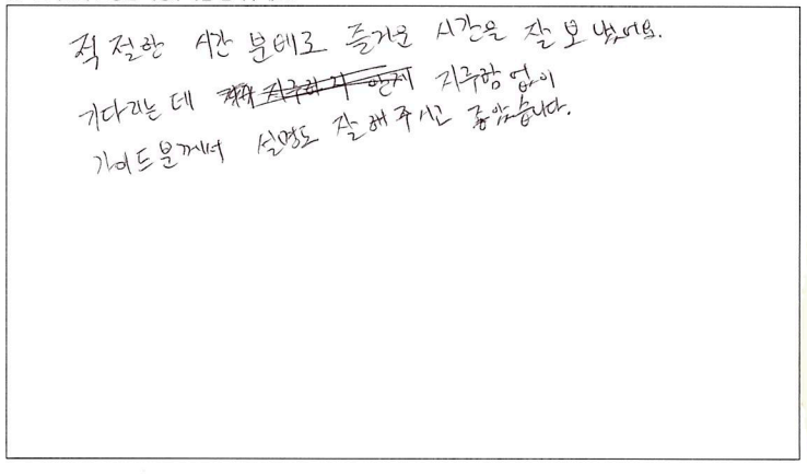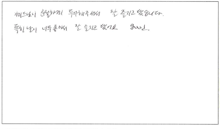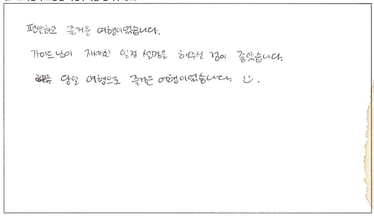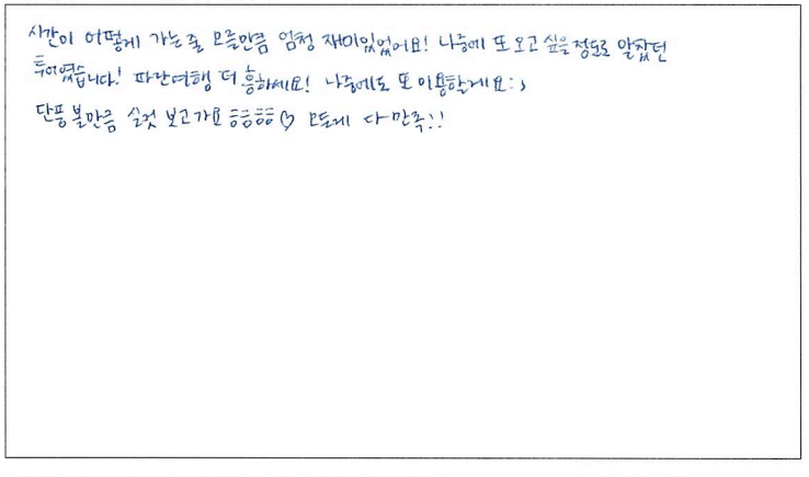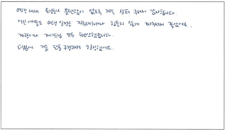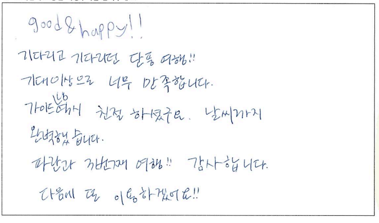 ![]() 하루라는 짧은 시간안에 알차게 여행한 것 같아 만족스러운 여행이었어요.^^ 여행코스도 좋았고 무엇보다 가이드님이 차량 온도 부터 이러저러한 안내까지 세세하게 신경써주셔서 여행 시작부터 마지막까지 불편합없이 여행할 수 있었습니다. 좋은 추억 만들고 갑니다. 감사합니다. ^^ ![]() 자유시간도 적당하고 좋았다!! 대중교통으로는 오기 어려운 곳이어서 패키지를 이용해 봤는데 너무 만족해서 추천하고 싶다. ![]() 파란여행을 총해 3번째 여행입니다. 최선을 다 하시는 가이드님께 감사드리고 귀 여행사를 통해 미국, 캐나다 곳곳을 여행하며 귀하고 행복한 추억 많이 만들어서 한국으로 돌아가겠습니다. ![]() 가이드분이 친절하게 불편함이 없도록 하기 위하여 무단히 노력하시는게 눈에 보일정도 입니다. 너무 친절하게 잘 대해 주셔서 불편함이 하나도 없었습니다. 고맙습니다. ![]() 적절한 시간 분배로 즐거운 시간을 잘 보냈어요. 기다리는데 지루함 없이 가이드분께서 설명도 잘 해주시고 좋았습니다. ![]() 세번째 파란여행 알곤퀸 여행이었어요. 올때마다 구성이 알차서 지인들에게 추천하게 되는 거 같아요. 가성비 갑이에요. 감사합니다. ![]() 편안하고 즐거운 여행이었습니다. 가이드님이 자세한 일정 설명을 해주신 점이 좋았습니다. 당일 여행으로 즐거운 여행이었습니다. ![]() ![]() 코스 및 가이드님 안내 모두 만족합니다. 수고하셨습니다~ ^^* ![]() 코스별로 여유있는 개인 시간을 넉넉히 배분하신 점에 매우 만족합니다. 무스코카에서 헌츠빌로 일정을 잡아주신것도 쉬어가는 편안함을 주신 것으로 만족하고 마지막 돌셋에서 단풍을 하이라이트로 즐기게 되어서 좋은 여행이었습니다. 감사합니다. ![]() 가이드님이 친절하게 투어해주셔서 잘 즐기고 왔습니다. 특히 날씨 너무 좋아서 잘 즐기고 왔어요.Good! ![]() Good & Happy!! 기다리고 기다리던 단풍여행!! 기대 이상으로 너무 만족합니다. 가이드님 역시 친절하셨구요. 날씨까지 완벽했습니다. 파란과 3번째 여행!! 감사합니다. 다음에 또 이용하겠어요!! ![]() 여행 내내 손님들의 불편함이 없도록 계속 살펴 주셔서 감사합니다. 어린 아이들도 여행 일정으로 지루해 하거나 힘들지 않게 짜주셔서 좋았어요. 차량이나 가이드님 모두 편안했습니다. 덕분에 가을 단풍 구경하며 힐링했어요. ![]() 시간이 어떻게 가는 줄 모를만큼 엄청 재미있었어요! 나중에 또 오고 싶을 정도로 알찼던 투어였습니다! 파란여행 더 흥하세요! 나중에도 또 이용할께요. :) 단풍 볼 만큼 실컷 보고가요. 모든게 다 만족!! ![]() 증기유람선 - 헌츠빌 -알곤퀸 공원까지 알차고 효율적인 1일 코스 였습니다. 감사합니다. ![]() ![]() ![]() ![]() ![]() |