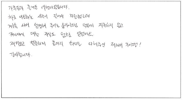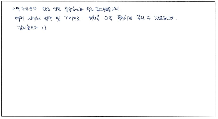 ![]() 최대한 편한 여행이 될 수 있도록 해주셨고 너무 좋았습니다. 식사도 맛있었고 자유식도 여러 곳 추천해 주셔서 인생맛집 찾았어요. :) 호텔도 너무 좋았고 두 곳의 분위기가 정 반대라 더 좋았어요! 비용이 절대 아깝지 않은 여행이었습니다. ![]() 남편과 소중한 추얷을 갖게 되어서 좋았습니다. 생각했던것 처럼 아름다운 퀘벡이었고요. 기회가 된다면 겨울여행도 하고 싶네요. 역사를 열심히 설명해주시는 가이드님 고맙습니다. ![]() 캐나다의 역사 등 이것저것들을 버스 안에서 설명해 주셔서 긴 여행동안 지루하지 않았습니다. 그리고 뭔가를 알고 보니까 새로운 것들을 많이 느낄 수 있었습니다. 즐거운 여행이었고 좋은 추억을 많이 쌓고 가네요! 감사합니다. ![]() 자유시간이 많아서 좋았어요. 호텔 위치가 좋아서 체크인 후에도 자유롭게 나갈 수 있어서 만족스러워요~!! 편하고 알찬 여행 감사드립니다. ![]() 딸이 토론토에 있어 다녀왔어요. 정말 한마디로 따뜻한 여행이었어요. 세계 곳곳을 다녀봤지만 이렇게 알뜰히 챙기는 가이드님 처음 봤습니다. 정말 좋았습니다. ![]() 저의 인생 두번째 투어로써 파란여행 투어를 통해 여행사 투어에 대한 저의 시선이 바뀔수 있었던 소중한 경험이 되었습니다. 투어는 여행 기획이나 숙박시설, 식사 등이 좋아야 하는 것은 당연하고, 무엇보다 가이드가 얼마나 좋으신 분인지에 따라 투어의 질이 달라진다고 생각합니다. 제가 경험한 가이드님은 항상 친절하고 포근하게 고객들을 대해주시며 배려심이 정말 깊으신 분이었습니다. 저의 첫 해외여행의 마무리를 좋은 기억으로 남게 해주셔서 감사합니다. ![]() 가족들과 즐거운 여행이었습니다. 차로 이동하는 시간이 길어서 걱정했는데 계속 서서 설명해 주시는 가이드님 덕분에 지루하지 않고 캐나다에 대한 지식도 덤으로 얻었어요. 재미있고 친절하게 끝까지 최선을 다해주신 가이드님! 감사합니다. ![]() 첫 캐나다 여행에 가이드님의 설명에 많은 도움이 되었습니다. 기회가 된다면 꼭 다시 찾고 싶은 여행사 입니다. 앞으로도 계속 좋은 여행사로 남기를 바랍니다. ![]() 모두 잠들어도 열심히 설명해 주시는 가이드님 수고하셨어요. 감사합니다. 한국에서 친척이 올때마다 나이아가라와 퀘벡을 다녀오는데 갈때마다 새롭네요. 앞으로도 착한 가격, 좋은 패키지 부탁합니다. ![]() 여행 일정도 좋고 숙소도 좋아서 만족했던 여행이었습니다! 다음에 또 기회가 된다면 파란여행 이용할 것 같아요. ![]() 2박3일 동안 많은 인원 통솔하느라 수고 많으셨습니다. 여러 자세한 설명 및 가이드로 여행을 더욱 풍족하게 즐길 수 있었습니다. 감사합니다. :) |