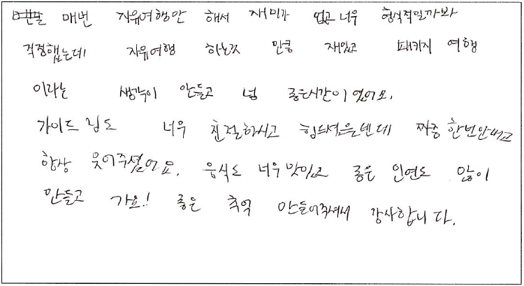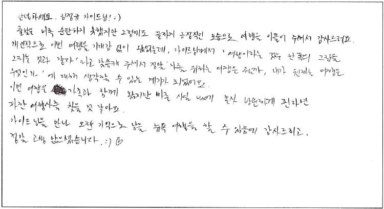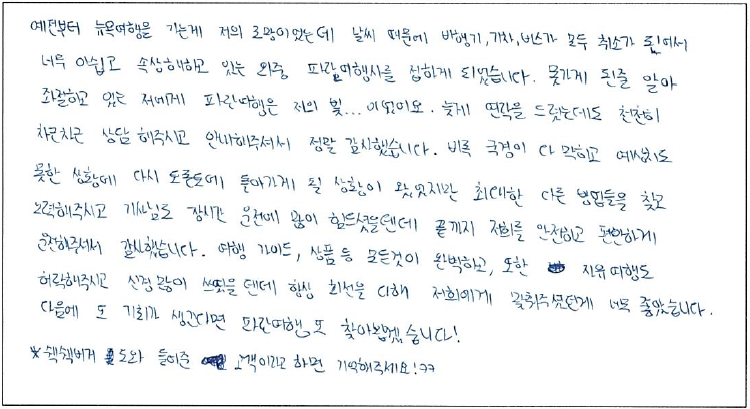 ![]() 여러가지 우여곡절이 있었지만, 여행자체 만으로 후기 작성하려 합니다. 우선 자유여행 계획했다 부득이하게 패키지 상품을 이용하게 되었지만, 원하던 일정들이 포함되어있었기에 선택할수 있었습니다. 짧은 시간 복잡하고 볼거 많은 뉴욕이란 도시를 알차고 안전하게 둘러볼수 있게 해주신건 가이드님의 배려와 실력인것 같습니다. 실제 와보니 가이드님의 가이드가 없었다면 뉴욕이란 도시를 어떻게 얼마만큼 볼수있었을지 실로 걱정되더군요. 많은 경험과 소소한 배려로 짧고 굵은 뉴욕 3박4일 여행을 잘 마친거 같습니다. 사실 버스로 긴시간 투어가 너무 힘들어 또 뉴욕을 버스로? 장담못하겠지만 상품이나 가이드님은 너무 좋았고, 다른 여행에서도 이런 가이드님을 또 뵙고싶어요. 감사합니다. ![]() 12월 24일 부터 뉴욕에서의 자유여행을 계획했었으나 날씨로 인해 모든 항공편과 버스, 기차편들이 취소되어 급하게 뉴욕으로 갈 방법을 찾아 보던중 지인으로 부터 파란여행 뉴욕 패키지를 소개받게 되었습니다. 뉴욕으로 가는길 버스 안에서 뉴욕에서의 일정을 자세하게 설명해 주셨는데 제가 자유여행때 계획했던 일정과 매우 흡사하다고 생각했습니다. 짧은 시간애세 많은 것들을 경험할수 있도록 계획이 되어있었고, 자유의여신상 페리, 브루크린 브릿지, 5번가, 타임스쿼어 등 뉴욕의 중요한 장소들을 모두 경험해 볼수 있었습니다. 자유시간도 충분히 보장되어 제가 하고싶었던 것들을 맘껏 누릴수 있었고, 식사제공은 여행 경비를 줄일수 있어서 너무 든든하였습니다. 또한 투어 중간에 자유일정을 소화하고 싶어서 기존에 있던 일정에 빠지겠다고 가이드분께 말씀드렸었는데 흔쾌히 허락해주시고 제가 다시 합류하기 위한 시간과 장소등을 친절히 자세하게 알려주셔서 전혀 문제없이 자유일정을 즐기고 합류할수 있었습니다. 4일동안 정말 알찬 일정을 보내고 돌아가는 것 같습니다. 뉴욕으로 가는 길에 국경이 막혀 토론토로 돌아올뻔한 상황이 있었지만 가이드분께서 침착하게 저희가 뉴욕에 갈수 있는 최선의 방법을 찾아주셨고 덕분에 뉴욕에 무사히 도착할수 있었습니다. 이번 여행을 최고로 만들어주신 가이드분께 넘 감사드리며 다음에도 파란여행을 통해 여행을 함께하고 싶습니다. ![]() 친한 지인이 파란여행을 통해 미국을 다녀왔다는 좋은후기를 듣고 크리스마스를 기념해 저와 남자친구도 미국여행을 계획하게 되었습니다. 날씨로 인해 출발이 하루 미뤄지면서 공휴일인 크리스마스에 떠나게 되다보니 여러가지 예상치 못한 일들이 많이 생겼으나 최선의 선택으로 마침내 미국에 도착할 수 있게되어 잊지못할 여정이 된것 같습니다 :) 다음 여행도 파란여행을 통해 가려고합니다. 좋은 재밌는 추억 만들어주셔서 감사하고 좋은 인연들을 만나게 되어 기쁜 여행이었습니다! ![]() 예전부터 뉴욕여행을 가는게 저희 로망이였는데 날씨 때문에 비행기,기차,버스가 모두 최소가 되어서 너무 아쉽고 속상해하고 있는 와중 파란여행을 접하게 되었습니다. 못가게 된줄 알아 좌절하고 있는 저에게 파란여행은 저의 빛...이었어요. 늦게 연락을 드렸는데도 천천히 차근차근 상담 해주시고 안내해주셔서 정말 감사했습니다. 비록 국경이 다 막히고 예상치도 못한 상황에 다시 토론토에 돌아가게 될 상황이 왔었지만 최대한 다른 방법들을 찾고 노력해주시고 기사님도 장시간 운전에 많이 힘드셨을텐데 끝까지 저희를 안전하고 편안하게 운전해주셔서 감사했습니다. 여행 가이드, 상품등 모든것이 완벽하고, 또한 자유여행도 허락해주시고 신경 많이 쓰였을텐데 항상 최선을 다하여 저희에게 맞춰주셨던게 너무 좋았습니다. 다음에 또 기회가 생긴다면 파란여행 또 찾아뵙겠습니다! *쉑쉑버거 도와 들어준 고객이라고 하면 기억해주세요!ㅋㅋ ![]() 안녕하세요 가이드님! :) 출발은 비록 순탄하지 못했지만 그럼에도 끝까지 긍정적인 모습으로 여행을 이끌어 주셔서 감사드려요. 개인적으로 이번 여행을 기대감 없이 왔었는데, 가이드님께서 '여행 이라는 것은 한 폭의 그림을 그리는 것과 같다' 라고 말씀해 주셔서 정말 '나는 위하는 여행은 뭘까, 내가 원하는 여행은 무엇인가' 에 대해 생각할 수 있는 계기가 되었어요. 이번 여행은 가족과 함께 왔지만 빠른 시일 내에 혼자 방문하게 된다면 파란여행을 찾을 것 같아요. 가이드님을 만나 오랜기억으로 남을 뉴욕 여행을 할 수 있음에 감사드리고, 정말 고생많으셨습니다!♥ ![]() 알찬 구성으로 4일동안 뉴욕을 즐기며 돌아볼수 있어서 좋았습니다. 다사다난한 여행이었지만 이또한 추억으로 남을 것 같아요,, 다음에 부모님 모시고 다시 한번 오고 싶어요 감사합니다~ ![]() 매번 자유여행만 해서 재미가 없고 너무 형식적일까봐 걱정했는데 자유여행 하는것 만큼 재밌고 패키지 여행이라는 생각이 안들고 넘 좋은시간이었어요. 가이드님도 너무 친절하시고 힘드셨을텐데 짜증 한번 안내고 항상 웃어주셨어요. 음식도 너무 맛있고 좋은 인연도 많이 만들고 가요! 좋은 추억 만들어주셔서 감사합니다. ![]() 가족과 함께 뉴욕에서 12월말을 보낼수 있어서 