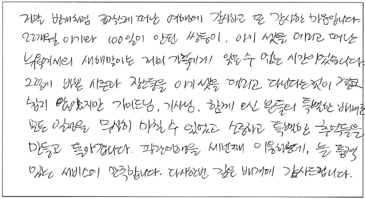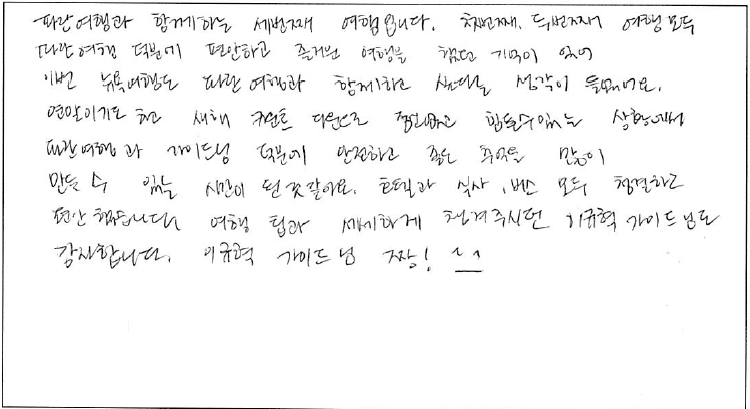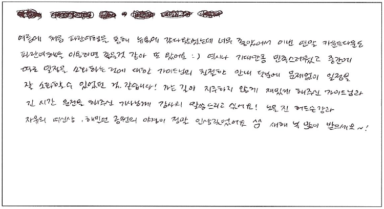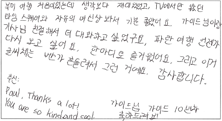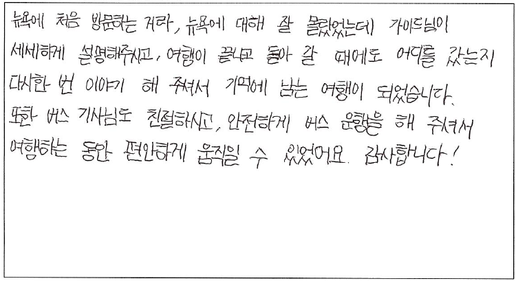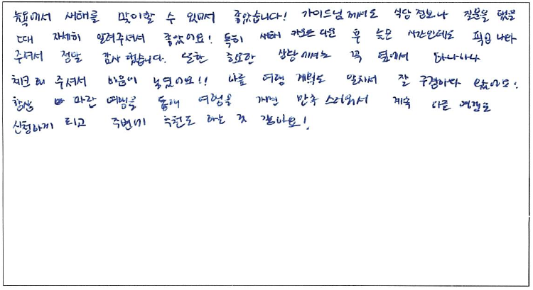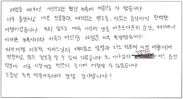 ![]() 파란여행과 함께하는 세번째 여행입니다. 첫번째, 두번째 여행모두 파란여행 덕분에 편안하고 즐거운 여행을 했던 기억이 있어 이번 뉴욕여행도 파란여행과 함께하고 싶다는 생각이 들었어요. 연말이기도 하고 새해 카운트 다운으로 정신없고 힘들수 있는 상황에서 파란여행과 가이드님 덕분에 안전하고 좋은 추억을 많이 만들 수 있는 시간이 된것 같아요. 호텔과 식사, 버스 모두 청결하고 편안했습니다. 여행 팁과 세세하게 챙겨주시던 가이드님도 감사합니다. 가이드님 짱! ^^ ![]() 2022의 마지막 날을 특별하게 보내고 싶어 고민하던 중 파란여행과 함께 갔던 뉴욕여행이 떠올라 다시 오게 되었습니다. 토론토에서 출발해 뉴욕까지 버스로 이동했지만 가이드님의 재미있고 알찬 뉴욕 배경지식들을 들으니 어느새 도착해 있었습니다. 첫날부터 마지막 날까지 효율적인 동선으로 뉴욕을 충분히 즐기고 온것 같습니다. 복잡하고 사람 많은 연말의 뉴욕에서 많은 사람들을 책임지고 신경쓰는 것이 쉬운일이 아닌데도 이규학 가이드님은 한명 한명 세삼하게 신경 써 주셨습니다. 낯선 곳인 뉴욕이지만 덕분에 마음편하게 백퍼센트 즐길 수 있었습니다. 뉴욕 여행을 고민하고 있으시다면 '파란여행'을 강추 드립니다. 3박4일간 감사했습니다! ![]() 어렸을 때부터 사진으로만 봤던 뉴욕에 처음으로 가 봤습니다. 너무 웅장하고 예쁜 건물들과, 매력있는 명소들, 맛있는 음식까지 완벽한 여행이었습니다. 특히 앞으로 계속 기억에 남을 카운트다운의 순간, 페리에서 바라본 뉴욕시티와 자유의 여신상 야경은 더욱 특별했습니다. 파란여행 가이드님의 재미있는 설명과 리드 덕분에 이번 여행에서 편안하고 많은 정보를 알 수 있게 되었습니다. 또, 기사님의 안정적인 버스 운전 덕분에 이동 시간에도 편안히 즐기며 여행할 수 있었습니다. 소중한 추억 만들어주셔서 정말 감사합니다! ![]() 정말 번개처럼 급작스럽게 떠난 여행에 감사하고 또 감사한 마음입니다. 22개월 아기와 100일이 안된 쌍둥이, 아기 셋을 데리고 떠난 뉴욕에서의 새해 맞이는 저희 가족에게 잊을 수 없는 시간이었습니다. 그렇게 바쁜 시즌과 장소들을 아기 셋을 데리고 다닌다는 것이 결코 쉽지 않았지만 가이드님,기사님 함께 오신 분들의 특별한 배려로 모든 일정을 무사히 마칠수 있었고 소중하고 특별한 추억들을 만들고 돌아갑니다. 파란여행을 세번째 이용하는데, 늘 품격있는 서비스에 만족합니다. 다시 한번 깊은 배려에 감사드립니다. ![]() 여름에 처음 파란여행을 통해 뉴욕에 갔다왔었는데 너무 좋았어서 이번 연말 카운트 다운도 파란여행을 이용하면 좋을 것 같아 또 왔어요 :) 역시나 기대만큼 만족스러웠고 중간에 따로 일정을 소화하는 것에 대한 가이드님의 친절한 안내 덕분에 문제없이 일정을 잘 소화할 수 있었던 것 같습니다! 가는 길이 지루하지 않게 재밌게 해주신 가이드님과 긴 시간 운전을 해주신 기사님께 감사의 말씀드리고 싶어요! 노을진 허드슨강과 자유의 여신상, 해밀턴 공원의 야경이 정말 인상깊었어요 ^^ 새해 복 많이 받으세요~! ![]() 북미 여행 처음이었는데 생각보다 재미있었고, TV에서만 봤던 타임 스퀘어와 자유의 여신상 봐서 기분 좋았어요. 가이드님이랑 기사님 친절해서 더 대화하고 싶었구요. 파란여행 언젠가 다시 오고 싶어요. 한마디로 즐거웠어요. 그리고 이거 글씨체는 버스가 흔들려서 그런거예요. 감사합니다. 가이드님 가이드 10년차 축하드려요! 추친 : Paul, Thanks a lot ! You are so kind and cool. ![]() 뉴욕에 처음 방문하는 거라, 뉴욕에 대해 잘 몰랐었는데 가이드님이 세세하게 설명해 주시고, 여행이 끝나고 돌아 갈 때에도 어디를 갔는지 다시 한번 이야기 해 주셔서 기억에 남는 여행이 되었습니다. 또한 버스 기사님도 친절하시고 안전하게 버스 운행을 해주셔서 여행하는 동안 편안하게 움질일 수 있었어요. 감사합니다! ![]() 가족과 함께하는 뉴욕여행을 생각하다가 지인의 소개로 파란여행상품을 알고 예약했다. 연말연시 일정이라 변수가 많았는데 적절하게 일정을 조절해서 뉴욕의 핵심 볼거리를 거의 다 보게 되어 뿌듯하다. 수영장이 있는 호텔이고 식사도 훌륭해서 아이들도 일정후에 즐겁게 물 놀이까지 할 수 있었다. 가이드님이 캐나다와 미국 문화 그리고 역사를 비교해서 설명한 부분도 즐겁게 들었습니다. ![]() 가이드분께 모르는 부분 물어보면 항상 유쾌하고 친절하게 답변해주셔서 처음 뉴욕 방문 아주 만족스러웠습니다. 뉴욕의 유명 지역을 3박4일 안에 다 볼 수 있어서, 다음 뉴욕에 올 때 큰 도움이 될 것 같습니다. 또한 가이드분께서 뉴욕의 지리나 정보를 정확하고, 이해하기 쉽게 설명해주셔서 중간중간 자유시간에도 어렵지 않게 뉴욕 여행할 수 있었습니다. 버스 운전도 안전하고, 편안하게 기사님께서 해주셔서 편하게 뉴욕 여러지역 여행할 수 있었습니다. 가이드님, 기사님 감사합니다!! ![]() 2022년 마지막날과 2023년 첫날에 뜻 깊은 추억 남길수 있게 해주셔서 감사합니다. 여행 오기전까지 문의사항도 많았는데 하나하나 상세하게 친절히 답변도 해주시고 첫 미국 여행도 안전하