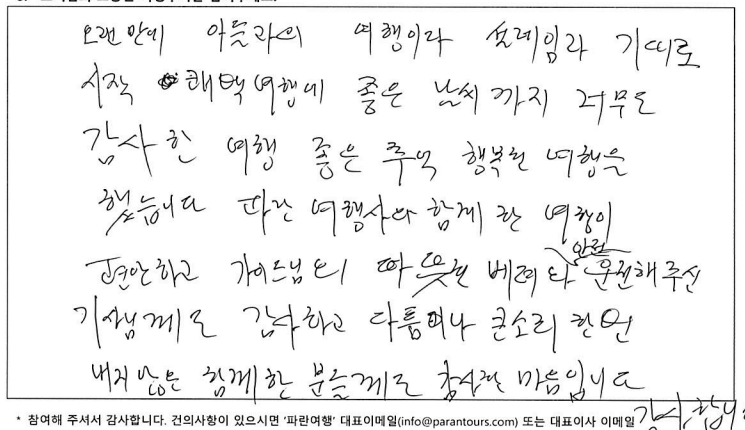 ![]() 여행사가 단체여행의 쇼핑을 포기하는게 쉽지 않을텐데 쇼핑없는 여행 참 좋았습니다. 정말 날씨빼고 다 준비하셨다고 말씀하신대로 알차게 짜여진 기획에 기대 이상이였습니다. 하나라도 더 알려주시려는 가이드님의 성실함과 풍부한 지식덕에 퀘벡과 캐나다에 대해 많이 배우고 갑니다. 만족한 여행하게 해주신 파란여행께 감사드립니다. ![]() 오랜만에 아들과 여행이라 설레임과 기대로 시작, 퀘벡여행에 좋은 날씨까지 너무도 감사한 여행 좋은 추억 행복한 여행을 했습니다. 파란여행과 함께한 여행이 편안하고 가이드님의 따뜻한 배려와 안전 운전해주신 기사님께 감사하고 다툼이나 큰소리 한번 내지 않은 함께한 분들께도 감사한 마음입니다. 감사합니다. ![]() 두번째 퀘벡여행입니다. 앞전에 다른여행사보다 훨씬 알찬프로그램입니다. 꼼꼼히 설명해주시는 가이드님, 너무너무 많은 정보이야기에 재미있었습니다. 세번째 퀘벡여행도 파란여행과 갈것같습니다. 수고하셨습니다. ![]() 5번째 오는 올드퀘벡 여행이였습니다. 어머니와 둘이 가는 첫 캐나다 여행이라 남다른 느낌이였어요. 저희 어머니도 여행하는 동안 불편함 없이 만족하셔서 저 또한 좋았습니다. 파란여행 파이팅! ![]() 캐나다에 오고 처음으로 여행사를 통해 간 여행이었는데, 대만족입니다! 가이드님께서 유익한 설명을 너무 잘 해주셔서 버스 타고 가는 동안 지루하지 않고 재밌었어요. 아무것도 모르고 간 여행이었는데 많이 알아갑니다ㅎㅎ 같이 여행 오신 분들도 다 너무 좋으신 분들이었어요. 이번 여행 너무 즐거웠고 다음에 또 이용하고 싶은 마음이 큽니다. ![]() 친구와 4년만에 알차게 시간 보내다가 갑니다. 혼자다녔으면 다 못 갔을것 같은데 다양한곳 가볼 수 있어서 좋았고 호텔들이 위치가 좋아서 추천해주신 맛집들 가기에도 편했습니다. |