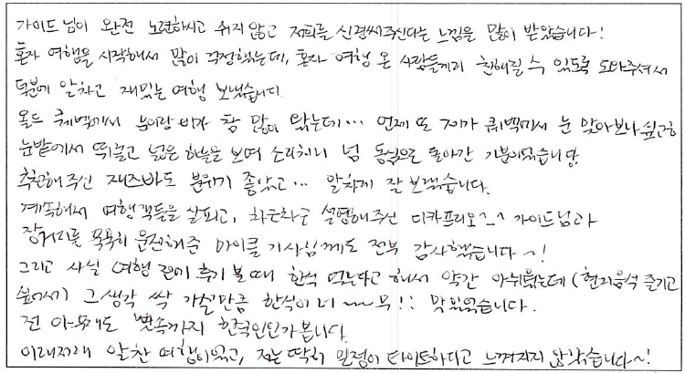![]() 저는 이번에 캐나다에 20년을 살면서 여행사여행을 처음해봤어요. 제가 생각한 기대 이상으로 대만족을 했습니다. 가이드님 버스에서 끊임없이 말씀하시는 모습보고 대단한 정성이시다라는 생각을 했고 지식도 많으시네요. 호텔은 제가 개인적으로 여행했다면 이정도의 quality를 가진곳으로 숙소로 잡을 수 있을까 할 정도로 좋았습니다. 좋은 여행할 수 있도록 애써주신 모든 것에 감사드립니다. ![]() 가이드님이 완전 노력하시고 쉬지않고 저희를 신경써주신다는 느낌을 많이 받았습니다! 혼자 여행을 시작해서 많이 걱정했는데, 혼자 여행 온 사람들끼리 친해질 수 있도록 도와주셔서 덕분에 알차고 재미있는 여행 보냈습니다. 올드 퀘벡에서 눈이랑 비가 참 많이 왔는데,,, 언제 또 제가 퀘벡에서 눈 맞아보나 싶고ㅎ 눈밭에서 뛰놀고 넓은 하늘을 보며 소리치니 넘 동심으로 돌아간 기분이었습니당 추천해주신 재즈바도 분위기 좋았고,,, 알차게 잘 보냈습니다. 계속해서 여행객들을 살피고 차근차근 설명해주신 가이드님과 장거리를 묵묵히 운전해준 기사님께도 전부 감사했습니다~! 그리고 사실 여행 전에 후기 볼때 한식 먹는다고 해서 약간 아쉬웠는데 (현지음식 즐기고 싶어서) 그 생각 싹 가실만큼 한식이 너~~무!! 맛있었습니다. 전 아무래도 뼛속까지 한국인인가 봅니다. 이래저래 알찬 여행이었고, 저는 딱히 일정이 타이트하다고 느껴지지 않았습니다~! ![]() 뉴욕자유여행중 퀘벡, 나이아가라를 장거리 운전하기 싫어 파란여행 캐나다 동부 4박 5일 상품을 이용했습니다. 패키지여행 많이 경험했지만, 파란여행은 옵션투어와 쇼핑부담이 1도 없는 놀라운 상품이라 편안한 마음으로 여행했습니다. 음식도 한식위주로 제공되어 오히려 저는 만족하고 좋았고 무엇보다 가이드님의 활기를 불어 넣어주는 재미있고 유익한 가이드가 최고였습니다. 날씨 빼고 다 준비했다는 파란여행의 캐나다투어 강추합니다. ![]() 긴 버스타고 가는 시간을 가이드께서 아주 재미있게 역사 얘기를 해 주셔서 지루하지 않게 여행을 즐겼습니다. 날씨가 좋았으면 더 좋은 퀘벡 여행이었겠지만 눈 내리는 퀘벡여행, 4월에 언덕에서 눈썰매, 딸 같은 룸메이트와 아름다운 추억이 될거예요. 다음에도 파란여행을 이용할거같습니다. ![]() 파란여행을 지인분께 소개받아서 처음으로 패키지 여행을 오게 됐는데 처음에는 걱정도 되고 큰 기대가 없었는데 여행이 끝난 지금은 오길 너무 잘했다고 생각해요. 쇼핑 강제도 없고 자유시간도 충분히 주시고 맛집리스트 부터 지도까지 프린트 해주신거 보고 진짜 많이 생각해주시는구나 생각이 들더라구요. 식사도 숙소도 다 괜찮았는데 가이드분이랑 장시간 운전해주신 기사분 너무 친절하게 대해주셔서 4박 5일 동안 믿고 편안하게 여행할 수 있었어요. 감사합니다. ![]() 소중한 친구들과의 소중하고 행복한 시간을 선물해 주셔서 감사합니다. 파란여행이 아니였다면 가질 수 없는 시간들이었겠지요. 모두를 행복하게 해주시는 가이드님과 뒷모습으로도 든든했던 멋진 버스 기사님께도 감사드립니다. 다음 기회가 있다면 조금 더 좋은 날씨의 축복을 받아 조금 더 따뜻하게 다시 오고 싶습니다. 그때 다시 만나요 파란여행!!! |