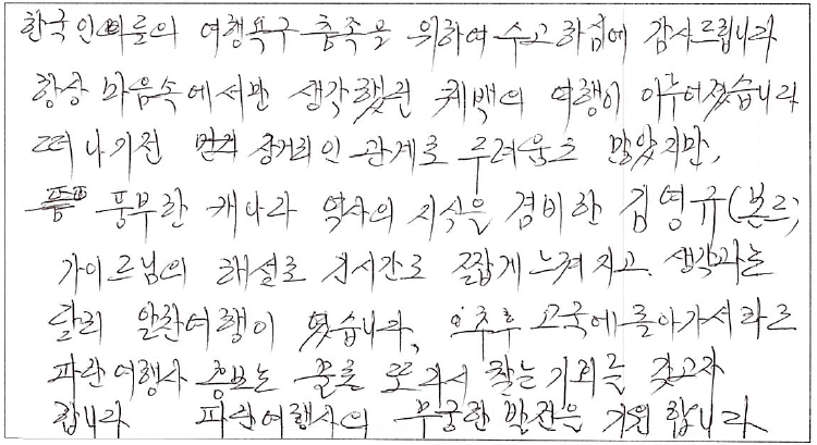 ![]() 코로나 이후로 해외여행이 너무 부담스러웠는데 막상 오니까 코로나 전혀 걱정할께 없어요. 아쉽게 천섬은 못봤지만 다음을 기약해야겠어요. 또 이용하고 싶은 여행사에요. 일단 좌석이 편해서 오래 앉아있기 편했고 화장실도 자주 가게 해주시고(깨끗한 화장실) 캐나다의 역사여행 이야기도 자세하게 알려주셨어요. 가족끼리 오면 공부도 되고 좋을 것 같아요. 호텔도 시내라 걸어다니기 좋고 일정이 빨리 마무리되면 어디 가기도 좋았어요. 사진찍은 포인트, 이 건물, 도시의 역사, 길, 마트 등 굉장히 자세하게 알려주시고 좋았어요. 또 여러번 하셔서 그런지 지금 계절에 맞게 설명을 잘해주셨어요. 진짜 물건 팔지 않아요 다른 여행사처럼 관광쇼핑 이런거 없습니다. 그만큼 자유시간으로 주셔서 좋았어요. 꿀팁도 많이 알려주셨고 사진도 잘 찍어주세요. 정말 감사했어요! 여행사 오래오래 해주세요. 다음에 또 오겠습니다.^^ ![]() 미국에서 학교 생활하면서 봄방학 때 급하게 기획한 캐나다여행이었는데 파란여행 덕분에 만족하며 잘 여행하다 갑니다. 처음 혼자 해외여행 하는거라 두렵기도 하고 생각이 많았는데 가이드님의 친절한 안내와 잘 짜여진 프로그램을 보면서 안심이 되며 여행을 오롯이 즐기기 시작했습니다. 차량이동, 호텔, 한식위주 식사, 가이드님의 친절한 설명까지.. 참 기억에 좋게 남을 것 같습니다. 앞으로 전승하시기 바라겠습니다. ![]() 캐나다 록키를 자스프, 벤프 등을 다녀왔습니다. 동부는 가을에 한 번 더 오고싶습니다. 여행은 전반적으로 무난했던것 같습니다. 가이드님의 친절함과 좋은 목소리는 좋았습니다. 파란여행의 무궁한 발전을 기원드립니다. ![]() 전반적으로 만족도가 높은 여행이었습니다. 저희 가이드님이 방문지들과 캐나다 뿐만 아니라 미국에 대한 역사에 관해 박식하셔서 차로 이동하는 시간내내 재미있게 잘 들으며 갈 수 있어서 참 좋았습니다. 퀘벡 여행중에 제공해 주신 지도와 맛집 리스트도 많은 도움이 됐습니다. ![]() 전체적으로 짜임새있게 여행계획이 수립시행되어 만족합니다. 가이드님의 입담에 시간가는줄 몰랐으며 캐나다 역사 문화 사회상에 대해 잘 알려주셔서 감사했습니다. ![]() 캐나다에 살고 있는 동생의 병문안을 오게 되어서 캐나다에 온 김에 파란여행의 4박5일 일정을 알게 되어서 함께 하게 되었습니다. 가이드님과의 일정도 2박 3일 퀘벡으로의 여정을 함께 하게 되었는데 캐나다의 역사, 문화, 정치, 각종 사회 시스템에 대하여 해박한 지식을 가지고 계셔서 매우 놀라웠습니다. 긍정적이고 나이스한 안내도 2박3일 동안 즐거운 여행이 되었으며 많은 사실을 알게 된 소중한 2박3일 이었습니다. 감사합니다. ![]() 한국인들의 여행욕구 충족을 위하여 수고하심에 감사드립니다. 항상 마음속에서만 생각했던 퀘벡의 여행이 이루어졌습니다. 떠나기전 장거리인 관계로 두려움은 많았지만, 풍부한 캐나다 역사의 지식을 겸비한 가이드님의 해설로 긴시간도 짧게 느껴지고, 생각과는 달리 알찬 여행이 였습니다. 추후 고국에 돌아가서라도 파란여행 홍보는 물론 또 다시 찾는 기회를 갖고자 합니다. 파란여행의 무궁한 발전을 기원합니다. |