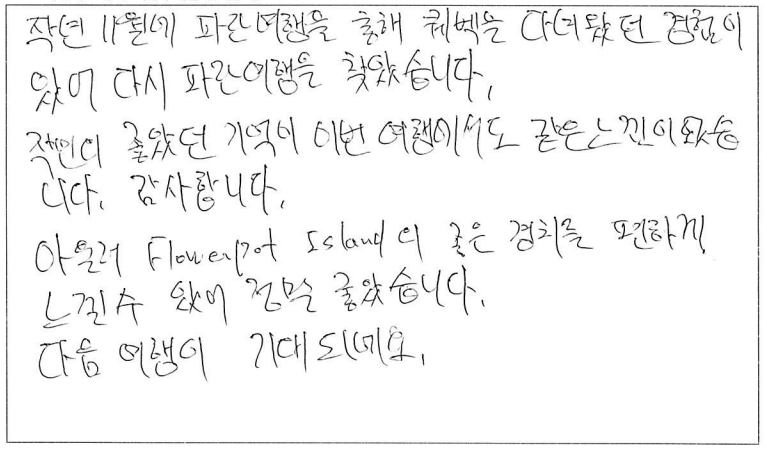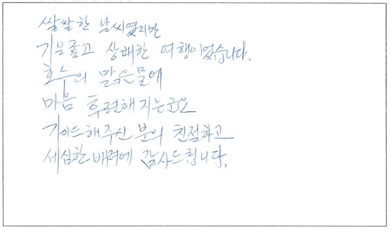 ![]() 오랜만에 가족 모두 함께한 여행이었습니다. 큰 기대없이 출발했던 토버모리 1일 여행이었지만 깨끗하고 투명한 물과 평화로운 해변(아니 호수였지만), 숲속 산책길 모두 좋았습니다. 열정적인 가이드님 설명도 즐거운 여행에 큰 몫을 담당했어요. 감사합니다. 망설이시는 분들이 있다면 추천합니다. 한번씩 가보시길~ ![]() 토요일에 만난 토버모리. 버릴게 하나 없는 풍광 모처럼 추억 가득한 여행, 가이드 혜안도 최고! ![]() 작년 11월에 파란여행을 통해 퀘벡을 다녀왔던 경험이 있어 다시 파란여행을 찾았습니다. 작년의 좋았던 기억이 이번 여행에서도 같은 느낌이었습니다. 감사합니다. 아울러 Flower Pot Island의 좋은 경치를 편하게 느낄 수 있어 정말 좋았습니다. 다음여행이 기대되네요. ![]() 쌀쌀한 날씨였지만 기분 좋고 상쾌한 여행이었습니다. 호수의 맑은 물에 마음 후련해지는군요, 가이드 해주신 분의 친절하고 세심한 배려에 감사드립니다. ![]() 토버모리 파란여행에서만 하는 여행상품이라고 들었습니다. Good Idea ![]() 가이드님의 설명도 좋았구요, 일행도 좋았습니다. 감사합니다. ![]() 간만에 하루 시간을 내어 바람쐬러 토버모리란 곳을 다녀왔습니다. 날씨도 좋아서 오가는 길 드라이브도 안전하고 즐겁게 다녀온것 같습니다. 가이드님도 상세하고 친절하게 설명해주시고 구석구석 알짜배기 팁 많이 알려주셨습니다. 아름다운 토버모리에서 그림같은 멋진 사진도 여러장 남겼습니다. 좋은시간, 일정 허락해주신 파란여행, 또 가이드님 감사합니다. 이 여름이 다 다기전에 한번 더 방문하고 싶은 생각이 듭니다. Thank you!!! |