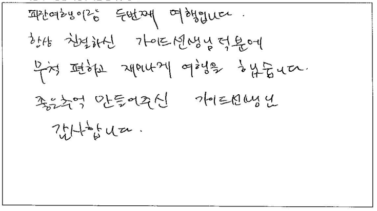 ![]() 가이드님의 해박한 지식과 유쾌한 언변으로 3박4일 여행이 꿈같이 지나갔습니다. 메트로폴리탄 미술관에서의 유명화가들의 수많은 작품들~ 비오는 날 브루클린 브릿지에서의 운치있는 워킹투어도 잊을 수 없습니다. 맨하탄 거리를 뉴요커처럼 걸어다니고 멋진 건축물들이 있는 빌딩 숲에서도~ 3박4일동안 뉴욕에서 또 하나의 멋진 추억을 남기게 되었습니다. 2박3일 퀘벡 여행도 기대해봅니다. 감사합니다. 가이드님 고생 많이 하셨습니다. ![]() 가이드님이 설명도 잘해주시고 친절하게 안내해 주셔서 감사하는 마음으로 즐거운 여행했습니다. 첫 뉴욕여행 평생 잊지 못할 것 같습니다. 도화지에 그림을 그리듯 눈으로 본것을(담아온 것을) 상상을 해 봅니다. 좋은 여행 감사합니다. 건강하십시오. 또 인연이 된다면 꼭 만날것을 약속합니다. ![]() 저는 한국에서 5월 17일에 와서 여행을 하게 되었습니다. 파란여행과 인연은 3번째 입니다. 항상 친절하신 가이드께서 즐겁고 만족스런 여행이 되도록 도와주셔서 행복했어요. 다음주 퀘벡도 다녀올 예정이고요. 한국에 돌아가면 지인들과 가족에게 많은 이야기를 할수 있어서 감사드립니다. 멋진여행 할 수 있게 해주셔서 늘 감사드리며 또 올 수있기를 간절히 바라며 파란여행 번창하시고 바랍니다. 가이드님 행복했어요. 감사드립니다! ![]() 예전에 주변소개로 파란여행을 통해서 퀘벡에 갔다 왔는데 좋았어서 한번 더 이용하게 되었어요. 여행상품은 뉴욕만 4일 이었는데 관광지 가는 곳도 좋았고 식사도 괜찮았어요. 담당 가이드분도 너무 재미있는 이야기도 많이 들려주시고 안내도 잘해주시고 장거리 이동을 할때는 영화도 틀어 주셔서 정말 편안하고 즐거운 여행이 되었어요. 호텔은 힐튼이었는데 생각보다 호텔이 깨끗해서 좋았어요. 나중에 어른이 돼서 아이들 생기면 데리고 오고 싶어요. 뉴욕(맨하튼)가실 생각이 있으신 분들에게 추천드려요! ![]() 파란여행과 두번째 여행입니다. 항상 친절하신 가이드님 덕분에 무척 편하고 재미나게 여행을 했습니다. 좋은 추억 만들어 주신 가이드선생님 감사합니다. ![]() 3박4일 짧은 여행이었지만 많은 경험과 기억을 갖게 되었다. 메트로폴리탄의 명작들을 그렇게 많이 편안하게 보게되어 행복했다. 9.11테러 추모공원의 눈물처럼 흐르는 물줄기가 가슴을 찡하게 하였으며 그렇게 오래오래 그것을 기억하고 추모하게 할 공간을 만들어 놓은 미국의 생각에 경의를 표한다. 비오는 날에도 일정은 순조롭게 이어가게 한것은 가이드님의 계획적인 진행이 아니면 불가능한 일. 비오는 날 브루클린 다리를 걷는 것은 낭만적인 기억으로 남을 듯 하다. 나의 여행의 열정이 가이드님의 열정에 힘입어 행복한 여행으로 마무리하게 되어 기쁘다. 가이드님 너무 수고하셨고 적절한 멘트들 유익하게 너무 잘 들었고 감사합니다. 건승하시길. ![]() 3박4일 뉴욕만4일 여행 많은 것들을 듣고 보고 추억으로 담아갑니다. 우드버리 쇼핑에서 득템도 하고 둘쨋날과 셋쨋날 뉴욕 곳곳을 가이드님의 꼼꼼한 설명으로 참 행복한 시간 보냈습니다. 이번 여행도 잘 즐기고 돌아갑니다. 그럼 다음 여행에서 또 봬요. 가이드님 화이팅! ^^ ![]() 이번 뉴욕여행은 참으로 즐겁고 행복한 여행이었습니다. |