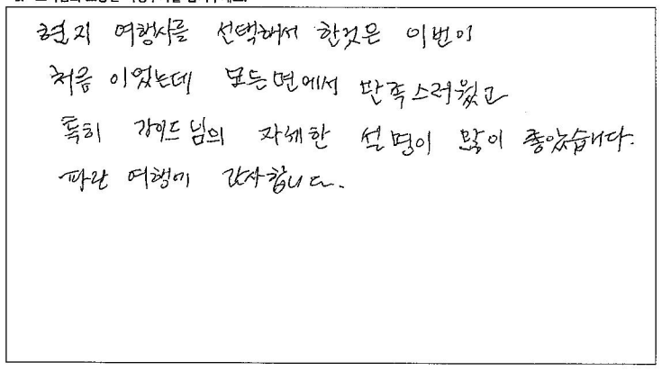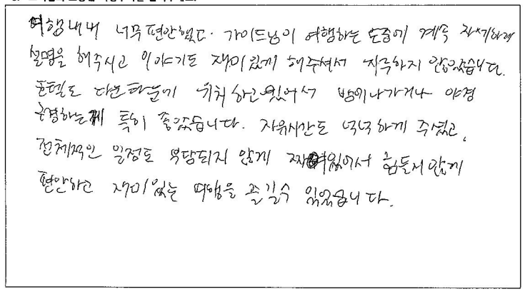 ![]() 다른 여행사의 패키지 여행과는 다르게 자유시간도 넉넉하고 스케줄도 너무 알차게 짜서 캐나다 동부를 정말 즐겁게 여행할 수 있었습니다. 그리고 가이드님도 버스안에서 즐거운 분위기를 조성해 주시면서 지루할 수도 있는 설명들을 재밌게 잘 해주셔서 해당 장소에 가서 관광할때 훨씬 즐겁게 관광 할 수 있었습니다. 가장 좋았던 점은 깨끗하고 좋은 숙소와 다운타운과 가까이에 위치한 숙소여서 저녁에 일정이 끝나고 자유롭게 도시관광을 할 수 있다는 점도 좋았습니다. 마지막으로 이벤트로 준비된 선물 또한 뜻깊은 여행이 될 수 있는 이유 중 한가지였습니다!! ![]() 혼자 왔는데도 너무 잘 여행했어요!! 사실 패키지 여행이라 보고 싶은 여행지를 못 볼까 걱정했는데 자유여행이었다면 방문하지 않았을 곳까지 너무 잘 여행했습니다. 특히 호텔이 다운타운 근처에 있어서 저녁 시간을 개인적으로도 이용할 수 있어 더욱 좋았던 것 같습니다. 그리고 가이드님이 여행지 소개는 물론이고 캐나다 역사 이야기도 곁들여 주신 덕에 캐나다에 대한 이해도가 한층 높아졌어요. 감사합니다. 후회없는 선택이었던 것 같습니다. 즐겁게 여행시켜주셔서 감사해요~ ![]() 적절한 자유시간과 재밌는 설명해주신 가이드님 덕분에 즐거운 여행이었습니다. 호텔과 여행코스 최고. 감사합니다. ![]() 현지 여행사를 선택해서 여행 한것은 이번이 처음이었는데 모든면에서 만족스러웠고 특히 가이드님의 자세한 설명이 많이 좋았습니다. 파란여행에 감사합니다. ![]() 파란여행과 함께한 4박5일 동부여행 아주 만족스러웠습니다. 캐나다에 대한 가이드님의 해박한 역사 지식과 맛집 정보까지 친절하고 세심한 안내로 즐겁고 편안한 여행이었습니다. 호텔이 여행 지역의 다운타운에 위치에 있어서 여행일정이 끝난 후 가족들과 자유시간을 안전하게 보낼 수 있었습니다. 감사합니다! ![]() 캐나다 자유여행을 진행하면서 동부쪽은 현지 여행사 검색하면서 파란여행을 알게 되었고 너무 만족하였습니다. 특히 가이드님의 박식한 설명과 힐튼 호텔 엄청 만족했으며, 쇼핑이 없었던 것도 인상적이었습니다. ![]() 잊지못할 캐나다 여행 만들어 주셔서 너무너무 감사합니다. 가이드분의 디테일한 설명, 자녀가 있는 가족분들 적극 추천합니다. 쾌적하고 안전한 버스, 고풍스럽고 깨끗한 호텔과 숙박도 함께요! ![]() 2박3일 캐나다 동부여행. 정말 알차게 보낸것 같습니다! 자유여행으로 오기에는 거리가 너무 멀어서 망설여졌는데 덕분에 편하게 올 수 있었습니다. 오타와, 몬트리올, 퀘벡에서 보고 느낄 수 있는 모든 경험을 할 수 있게 일정이 잘 짜여진 것 같습니다! 식사도 너무 만족스러웠어요! 퀘벡에서 두끼를 자유식으로 현지 레스토랑에서 먹는 만큼 나머지 식사는 맛있는 한식을 먹을 수 있어서 밸런스도 잘 맞았던 것 같아요! 휴게소도 중간중간 꼭 들리고 들리는 장소마다 제일 중요한 화장실도 꼼꼼히 안내해주셔서 편하게 걱정없이 보낼 수 있었습니다. 다음에도 또 이용하고 싶어요! 추천추천! ![]() 캐나다가 너무 넓어서 자유여행하기 힘들것 같아서 고민이 많았는데 인터넷으로 찾아보던 중 패키지로 여행 할 수 있다는 '파란여행'을 발견했습니다. 후기도 좋고 한인여행사라 영어로 스트레스 받을 일도 적을 것 같아 선택하게 되었는데 정말 잘 한것 같습니다. 퀘벡 2박3일 일정으로 진행하였는데 장시간 이동에도 불구하고 가는 내내 가이드님의 설명과 기사님의 편안한 운전적에 너무 편하게 이동해서 퀘벡에서도 정말 재미있게 놀 수 있었습니다. 호텔도 2박 다 힐튼호텔에 묵어서 정말 편안하고 좋았습니다. 여행일정도 자유시간이 있어서 맘껏 사진 찍을 수 있어서 좋았습니다. ![]() 여행 내내 너무 편안했고 가이드님이 여행하는 도중에 계속 자세하게 설명을 해주시고 이야기도 재미있게 해주셔서 지루하지 않았습니다. 호텔도 다운타운에 위치하고 있어서 밤에 나가거나 야경 구경하는게 특히 좋았습니다. 자유시간도 넉넉하게 주셨고 전체적인 일정도 부담되지 않게 짜여있어서 힘들지 않게 편안하고 재미있는 여행을 즐길 수 있었습니다. ![]() 단체여행에 대한 안좋은 선입견을 없애는데 충분한 여행이었습니다. 안전을 책임지는 기사님부터 내실을 채워주시는 가이드님의 열정적이고 해박한 지식을 바탕으로 한 설명에 지루할 틈이 없었습니다. 감동받은 여행이었습니다. 진심으로 감사드립니다. ![]() 가이드님의 세심한 배려와 가는 곳 마다의 디테일하고 재치있는 강의로 여행 중 지루할틈 없이 즐겁고 알찬 여행이었습니다.! 드라이버의 안전 운전으로 긴 버스여행이 편안했고 여행 중 선택해주신 음식은 더할나위 없이 맛있었습니다. 꼭 다시 여행하고 싶은 여행사와 가이드님! 감사했습니다. ^^ ![]() 중간중간 역사를 알려주셔서 더 유익한 여행이 된 것 같아요! 인솔해주셔서 감사했고 고생하셨습니다. 특히 제공되는 한식 너무 맛있어서 좋았어요. ^^ 추천합니다. 짱짱!! ![]() 최고의 여행이었어요. 가이드님 설명도 쏙쏙 들어와서 너무 기억에 남을것 같아요. 영원히 기억하며 또 만났으면 좋겠네요. 고생하셨어요.