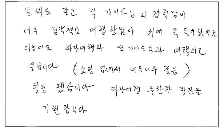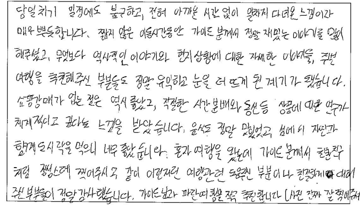![]() 출발전엔 넓은 호수만 보다 올거라 생각했는데 가이드님의 설명과 재미있는 이야기, 그리고 탄탄하고 군더더기 없는 파란여행의 관광일정이 이번 당일 여행을 더 풍요롭고 재미있고 뜻깊게 만들어 준거 같아요. 매번 파란여행을 이용하지만 매번 기대보다 더 크게 만족하고 갑니다~ 가이드님과 파란여행 Forever! 화이팅! ![]() 날씨도 좋고 가이드님의 경험담이 귀에 쏙쏙 들어왔어요. 다음에도 파란여행과 가이드님과 여행하고 싶습니다. (쇼핑이 없어서 너무 좋음) 힐링됐습니다. 파란여행 무한한 발전을 기원합니다. ![]() 힐링되고 재밌고 좋은 추억을 가질 수 있는 여행이었습니다. 처음 가져본 자연풍경만 즐기는 여행이었는데 새롭고 편안히 즐긴 여행이었습니다. 가는 길에 지루하지 않고 유익하게 재밌게 갈 수 있도록 해주신 가이드님 감사드립니다! 언제 기회되면 PEI나 서부 여행할때 파란여행 통해 가보도록 할께요!!! ![]() 지인들의 많은 소개로 파란여행 '토버모리'를 가족들과 함께 가게되었습니다. 버스타는 시간이 지루할까 염려되었는데 가이드님의 재미있는 입담에 시간가는 줄 몰랐습니다. 배경지식도 풍부하시고 설명도 잘 해주시고 유머러스하셨습니다. 짱! 일단 토버모리 모든 곳이 너무 예뻐서 저와 아이들 모두 힐링하며 좋은 시간을 가질 수 있었습니다. ![]() 토버모리는 물이 굉장히 맑고 아름다운 곳이였습니다. 섬에 있는 모든 곳이 우편엽서같이 아름다웠습니다. 섬에서 물에 발을 담그고 한참 앉아있었는데 기분이 굉장히 좋았고 아름다움에 매료 되었습니다. 주변 지인들에게 적극 추천합니다. ![]() 당일치기 일정에도 불구하고 전혀 아까운 시간 없이 알차게 다녀온 느낌이라 매우 뿌듯합니다. 짧지 않은 이동시간동안 가이드분께서 정말 재밌는 이야기를 많이 해주셨고 무엇보다 역사적인 이야기와 현지 상황에 대한 자세한 이야기들, 주변 여행을 추천해주신 부분들도 정말 유익하고 눈을 더 뜨게 된 계기가 되었습니다. 쇼핑 강매가 없는 점은 역시 좋았고 적절한 시간 분배와 동선 등 상품에 대한 연구가 체계적이고 깊다는 느낌을 받았습니다. 음식도 정말 맛있었고 섬에서 자연과 함께 도시락을 먹으니 너무 좋았습니다. 혼자 여행을 왔는데 가이드분께서 친구처럼 사진도 찍어주시고 같이 이런저런 여행관련 도움주신 부분이나 친절하게 대해주신 부분들 정말 감사했습니다. 가이드님과 파란여행을 적극 추천합니다! ![]() 토론토 근요 당일여행, 토버모리! 강추입니다! 파란여행 + 가이드님 + 최고의 날씨! 더할 나위 없이 힐링, 그 자체 였습니다. 당일 여행 경비로는 절대 싸지 않았지만 잘했다! 싶습니다. 선물 같은 하루! 돈으로 환산할 수 없을 정도 였습니다. 가이드님, 기사님, 함께 동행한 동기들 모두에게 감사드립니다. |