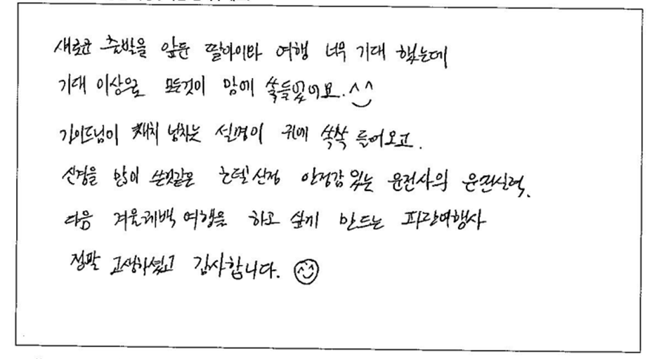 ![]() 이번 퀘벡 여행도 최고였습니다. 가이드님의 매끄러운 진행과 유머 가득한 이야기로 지루한 줄 모르고 2박3일을 보냈습니다. 호텔도 최고! 최고였습니다. 올드퀘벡의 야경이 호텔 방에서도 보여 잠자기 아까울 정도였습니다. 가이드님 최고! 파란여행 최고! 장시간 운전해주신 베스트 드라이버님도 최고! 수고하셨습니다. ![]() 매우 만족스러운 여행이었습니다. 애써주신 가이드님 감사합니다. 여행상품 일정이 군더더기 없이 너무 알차고 좋았습니다. 호텔과 식사도 최선의 노력으로 구성되어진 듯 했구요. 차량과 기사님도 최고였습니다. 가이드님 너무 성실하게 아시는 것도 많으시고 재미있으시고 친절하셔서 너무 감사해요. ![]() 캐나다 여행을 계획하면서 퀘벡여행 2박3일을 파란여행을 통해서 하게 됨. 가이드님의 재미있는 설명과 함께 좋았던 것은 숙소였다. 편안한 숙소는 힘든 여행일정을 잊게하는 마법같은 좋은 숙소였다. 또 쇼핑이 없는 것도 마음에 들었다. 페키지 여행을 하다보면 일정에 들어있는 쇼핑에서 엉뚱한 돈도 쓰기 때문이다. 쇼핑을 빼기는 힘든 결정이었겠지만 우리입장에서는 좋은 여행이었다. 다시 여행일정을 잡는 다면 파란여행을 통해서 하고 싶다! ![]() 여행사에서 계획한 모든 일정을 소화하기 힘들것이라도 생각했는데 함께 여행해주신 가이드님께서 각 지역에서 꼭 봐여할 곳들을 추려주시고 넉넉한 자유시간을 주셔서 덕분에 너무 좋은 추억 여행을 했다. 또한 버스로 이동하면서 우리가 여행할 지역에 관한 많은 역사적 이야기 덕분에 더 재미있었습니다! 지냈던 호텔 역시 편안하게 쉴 수 있도록 좋은 호텔과 근처에 많은 볼거리가 있는 좋은 위치를 고려하신것이 느껴져 감사했습니다. 기념품도 엄청 좋은것으로 주시고, 차량 이동 내내 힘들지 않도록 노력해주셔서 감사합니다. 다음에 또 여행사를 선택해야 한다면 파란여행으로 고를 거에요! ![]() 저의 첫 퀘벡여행을 파란여행을 통해서 하기를 정말 잘했다고 생각합니다. 잘 짜여진 시간과 여행지 모두 너무 만족스러웠습니다. 호텔도 역시 좋았고 특히 자유시간을 많이 주셔서 또 한번 가보고 싶었던 곳도 갈 수 있어서 좋았습니다. 잊지 못할 퀘벡 여행 만들어 주셔서 너무 감사드립니다!! ![]() 즐거운 여행이었어요. 버스도 너무 편하고 가이드분의 친절한 설명과 재미있게 해주셔서 오는 내내 즐거운 여행이었어요. 호텔도 너무 좋았어요. 담에 또 오고 싶어지는 여행입니다. ![]() 다운타운에 위치한 5성급 호텔이 아주 만족스러웠고 다른 여행사와는 달리 여유로운 자유시간이 있어서 편안한 여행이 되었습니다. ![]() 가이드님 설명이 매우 알차고 자세했어요. 섬세한 지도와 맛집소개 감사합니다. 캐나다 역사, 위인, 사회, 관광지 다 너무 잘 알게되어 유익했습니다. 호텔이 특히 훌륭했습니다. 몬트리올, 퀘벡 호텔 좋았어요. 한식당 좋았습니다. 아이스와인 감사합니다. ![]() 차량 최고! 호텔 최상! 식사 한국보다 맛나게, 가이드님 최고로 수고. 신경 많이 쓰시고 섬세함이 돋보임. ![]() 새로운 출발을 앞둔 딸아이와 여행 너무 기대 했는데 기대 이상으로 모든 것이 맘에 쏙 들었어요. 가이드님이 재치 넘치는 설명이 귀에 쏙쏙 들어오고 신경을 많이 쓴거 같은 호텔 선정, 안정감 있는 운전사의 운전실력. 다음 겨울 퀘벡 여행을 하고 싶게 만드는 파란여행. 정말 고생하셨고 감사합니다. |