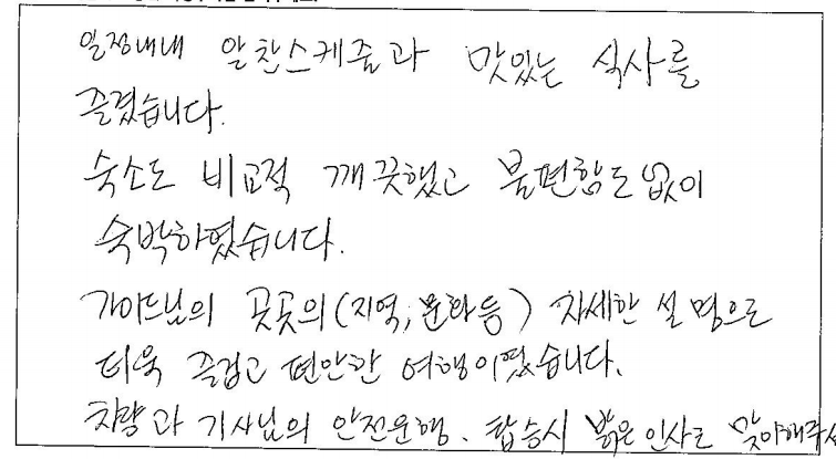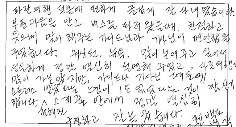 ![]() 파란여행 상품을 처음으로 이용했는데 여행기획을 잘 해서 볼거리가 많아 좋았습니다. 특히 가이드님의 안내와 소개가 너무 좋았습니다. 갈 곳에 대한 영화나 역사와 스토리를 소개해 주어 그 지역을 잘 구경할 수 있었습니다. 더 좋았던 것은 3박4일 동안의 식사였습니다. 너무 맛있고 불편이 없었고 너무 잘 먹어서 살이 쪘네요. 호텔도 깨끗하고 조용해서 좋았습니다. 운전하시는 기사님께서도 친절하시고 소통도 잘 되고 감사하고 고마웠습니다. ![]() 설레임과 기대감의 욕구를 200% 충족시켜 준 3박4일의 뉴욕+워싱턴 여행.. 가이드님이 친절하고도 이해하기 쉽게 여행지에 대해 설명을 해 주신 다음 여행지의 숨은 매력을 알게 해주셔서 유익한 여행을 할 수 있었습니다. 특히 저희 팀은 첫째날에 갑작스런 승차지 변경으로 매우 당황스러웠으나 나이아가라폭포 부근에서 친절하게 맞아주신 가이드님 덕분에 순조로운 여행이 시작될 수 있었습니다. 여행 중간마다 여행자들의 컨디션을 일일이 체크해주시고 여행의 불편함을 최소화하는데 노력해주신 가이드님께 너무 감사드립니다. 가장 중요한 것은 짧은 일정안에 많은 여행지를 구경하고 싶은 여행자의 마음을 반영한 꽉찬 일정이 매우 만족스러웠습니다. 미국의 주요 관광지를 아낌없이 여행할 수 있었던 소중한 시간이었고 여행자의 특성을 반영하여 프로그램 일정을 기획해 주신점이 인상 깊었습니다. ![]() 파란여행 덕분에 편하게 즐겁게 잘 다녀왔습니다. 부푼마음을 안고 버스를 타러왔을 때 친절하고 웃으며 맞이해주는 가이드님과 기사님이 편안함을 주었습니다. 워싱턴, 뉴욕, 많이 보여주고 싶어서 성실하게 정말 열심히 설명해 주었고 다른 여행도 많이 가보았지만 가이드나 기사님때문에 스트레스 받았다는 느낌이 1도 없었다는 것이 참 신기합니다. 정해진 스케쥴 안에서 정말 열심히 구경하고 잘 놀았습니다. ![]() 가이드님이 매우 친절히 대해 주셨습니다. 불편한 점을 즉시 해결해 주셨습니다. 여행 중 지루하지 않게 농담도 잘해주셨습니다. 운전기사님 매우 안정적으로 편안하게 운전해 주셨습니다. 투어버스가 새차여서 승차감이 매우 좋았습니다. ![]() 캐나다를 여행하고 미국을 여행했는데 정말 나라들이 크다는 것에 놀랍고 놀라웠다. 뉴욕의 빌딩들, 현대적인것과 옛건물들의 조화, 야경이 정말 환상적이었다. 가족들과 다시한번 오고 싶은 곳이다. 자연의 신비로움을 다시금 느낀다. 가이드님의 해박한 지식에 놀랍고 친절함에 감동이다. 친구들 건강하게 다시 한번 오기로 하자! 파이팅! ![]() 즐거운 여행, 웃음이 가득한 여행이었습니다. 미국의 역사, 경제, 두루두루 잘 말씀해 주셨고 귀에 쏙쏙 들어오게 안내해 주셨습니다. 차량도 안전하게 운전해 주셨고 가이드님 짱 멋지십니다. 안내 맨트나 주변환경, 지리적으로 이해 잘 가게 설명해 주셨습니다. 60년 만에 처음오는 미국, 뉴욕 모두 기억에 남을 것 같습니다. 입장시에도 척척 기다림없이 안내 짱! 한명 한명 모두 잘 세심하게 신경써 주시느라 애쓰셨습니다. 3박4일 동안 조금의 불편함 없고 음식도 신경써 주셨고 웃으며 잘 여행 마쳤어요. 가이드님 건강하시고 다음여행 기회가 있으면 또 뵙고 싶습니다. ![]() 뉴욕, 워싱턴 3박4일 여행을 무사히 잘 보냈습니다. 파란여행의 잘 짜여진 스케줄과 우리의 가이드님의 헌신적인 안내와 설명으로 그 기쁨이 두배 세배가 된듯합니다. 정말 많은 분들이 함께 했으면 좋겠습니다. 완전 강추합니다. ![]() 항상 파란여행을 통해 여행해서 이번에도 뉴욕+워싱천 여행을 했습니다. 일정이 길어서 걱정했는데 음식이며 호텔 다 좋았어요. 또한 가이드님이 너무 친절하고 꼼꼼히 설명도 잘해주시고 매 포인트마다 직접 사진을 다 찍어주셔서 너무 감사했습니다. 다음 여행도 망설임 없이 파란으로 다녀올거고 주변분들께도 파란여행을 적극 추천할께요. 가이드님 진심으로 감사했어요. 수고 많았습니다. ![]() 뉴욕, 워싱턴 3박4일. 동생과 함께 4인이 함께 여행했습니다. 이 상품을 선택하게 되었던 걸 참 잘했다고 저에게 칭찬하고 싶어요. 그런데 더 좋았던건 가이드님과 함께해서 정말 대박이었습니다. 숙소는 깨끗하고 식사는 입에 잘 맞아서 늘 허리띠를 풀어야 했답니다. 피로하실텐데 모든분들께 신경써 주셔서 함께 했던 분들이 편하게 좋은 시간 보내실 수 있었던 것 같아요. 모든 분들께 파란여행을 추천합니다. ![]() 일정 내내 알찬 스케줄과 맛있는 식사를 즐겼습니다. 숙소도 비교적 깨끗했고 불편함도 없이 숙박하였습니다. 가이드님의 곳곳의 (지역, 문화 등)자세한 설명으로 더욱 즐겁고 편안한 여행이었습니다. 차량과 기사님의 안전운행, 탑승시 밝은 인사로 맞이해 주셔서 감사합니다. |