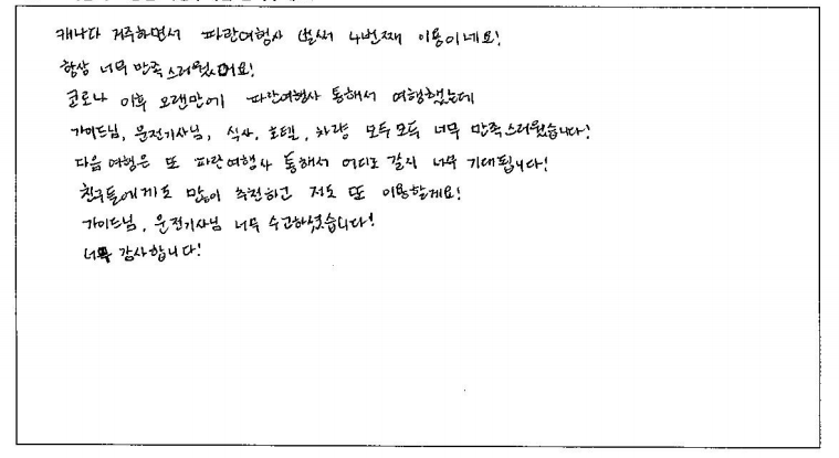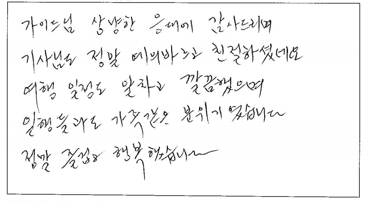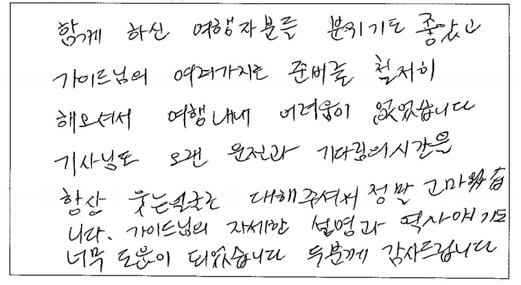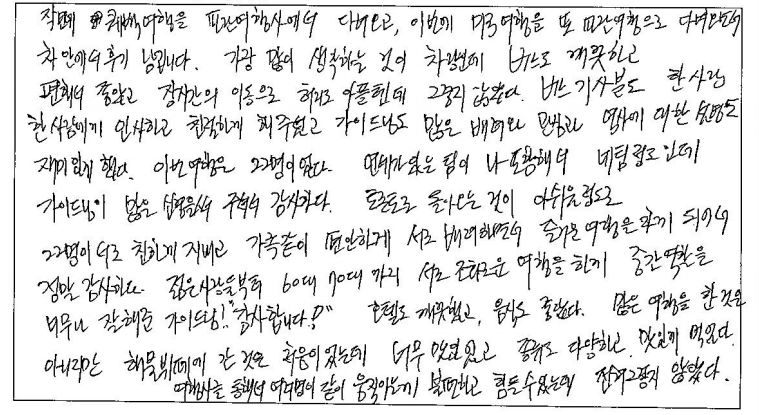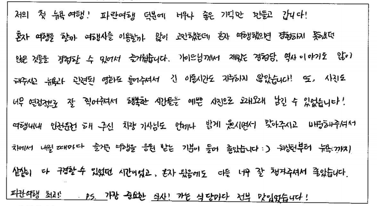 ![]() 캐나다 거주하면서 파란여행과 벌써 4번째 이용이네요! 항상 너무 만족스러웠어요. 코로나 이후 오랜만에 파란여행을 통해서 여행했는데 가이드님 운전기사님 너무 수고하셨습니다! 너무 감사합니다! ![]() 저의 첫 뉴욕 여행! 파란여행 덕분에 너무나 좋은 기억만 만들고 갑니다! 혼자 여행할까 여행사를 이용할까 많이 고민했는데 혼자 여행했으면 경험하지 못했던 많은 것들을 경험할 수 있어서 즐거웠습니다. 가이드님께서 재밌는 경험담, 역사 이야기도 많이 해주시고 뉴욕과 관련된 영화도 틀어주셔서 긴 이동시간도 지루하지 않았습니다! 또, 사진도 너무 열정적으로 잘 찍어주셔서 행복한 시간을 예쁜 사진으로 오래오래 남길 수 있었습니다! 여행 내내 안전운전 해 주신 차량 기사님도 언제나 밝게 웃으시면서 맞아주시고 배웅해 주셔서 차에서 내릴 때마다 즐거운 여행을 응원받는 기분이 들어 좋았습니다 :) 워싱턴부터 뉴욕까지 샅샅이 다 구경할 수 있었던 시간이었고, 혼자 왔음에도 다들 너무 잘 챙겨주셔서 좋았습니다. 파란여행 최고! P.S) 가장 중요한 식사는 가는 식당마다 전부 맛있었습니다! ![]() 좋은 여행을 하고 갑니다. 늘 가고 싶었던 뉴욕, 워싱턴, 뉴욕은 너무 좋았어요 늘 하는 이야기가 미국 수도는 가봐야 하는 마음의 소망을 이루었어요. 여행 중 좋은 소중한 분들의 만남에 감사드립니다. ![]() 뉴욕, 워싱턴 3박 4일 여행을 마치면서... 모든것이 좋았고 아쉬운 생각이 듭니다. 여행지 곳곳이 너무 아름답고 미국의 역사와 과정 뉴욕의 역사와 현재 상황 등을 너무나 재미있게 듣고 알아갑니다. 여행을 간다고 하면 늘 걱정이 호텔과 식사 가이드 등 이런 것들이 걱정됩니다. 지인을 통해 파란여행을 알았고 지금 여행을 마치면서 너무 잘 선택했다는 생각이 됩니다. 입담 좋으신 가이드님은 친절하시고 너무나 많은 관심과 신경을 써주시는 모습에 감사드립니다. 호텔과 식사도 만족이고요. 기사님 역시 최고였습니다. 여행을 다니면서 다시 한번 더 와 봤으면 하는 곳이 뉴욕인데 내년의 한국에서 지인들이 여행 계획이 있는데 꼭 파랑여행과 김정규 가이드님을 추천해 드리고 싶네요. 항상 늘 생각날 거 같고 기분 좋은 여행 만들어주셔서 너무 감사드립니다! ![]() 3박 4일 워싱턴+뉴욕 여행이었어요. 우선 차량이 너무 편하고 좋아 장거리 여행에 최적이었습니다. 또한 가이드님과 차량 기사님이 너무 친절하셔서 짧은 여행이 더 짧게 느껴졌어요. 기회가 된다면 뉴욕만 3박 4일, 가이드님 기사님과 다시 가보고 싶네요. 워싱턴, 뉴욕 명소만 컴팩트하게 잘 다녀왔습니다. ![]() 생각보다 시간이 빨리 가는 것 같아서 아쉽지만 즐거운 여행이었습니다. 항상 가고 싶고, 보고 싶던 나라여서 정말 기대가 많이 됐는데 기대 한 것보다 더 신나고 즐거웠습니다. 3박 4일 동안 알차고 예쁜 사진, 추억 얻어 갈 수 있어서 정말 만족합니다. 버스 기사님도 타고 내릴 때마다 밝게 인사해 주셔서 버스 타고 내릴 때도 기뻤습니다! 가이드님이 사진도 열심히 찍어셨는데 엄마랑 동생이랑 3명에서 같이 찍을 수 있어서 좋았어요! 밥도 맛있고 너무 좋았고 호텔 3곳 조식 모두 만족했어요! 다음에 따로 여행을 가게 되더라도 설명 들은 것 그때 왔던 것 생각하면서 즐거울 것 같아요. ![]() 안녕하세요~ 6년 만에 다시 찾은 파란여행 역시 감동입니다. 목소리도 좋으시고 가이드님의 친절한 설명으로 너무 만족했습니다. 그리고 차량도 시원하게 에어컨도 잘 틀어주시고 운전도 잘하시는 기사님 너무 인상 깊었습니다. 그리고 여행은 잠자리가 걱정인데요~ 이번 미국, 뉴욕, 워싱턴 여행은 호텔도 음식도 좋았습니다, 날씨 또한 좋아서 좋은 추억을 쌓고 갑니다. 다음에 또 기회가 된다면 파란여행을 이용하고 싶습니다. ![]() 함께 하신 여행자분들 분위기도 좋았고 가이드님의 여러 가지를 준비를 철저히 해오셔서 여행 내내 어려움이 없었습니다. 기사님도 오랜 운전과 기다림의 시간을 항상 웃는 얼굴로 대해주셔서 정말 고마웠습니다. 가이드님의 자세한 설명과 역사 이야기도 너무 도움이 되었습니다. 두 분께 감사드립니다. ![]() 가이드님의 상냥한 응대에 감사드리며 기사님도 정말 예의 바르고 친절하셨네요 여행 일정도 알차고 깔끔했으며 일행들과도 가족 같은 분위기였습니다~ 정말 즐겁고 행복했습니다. ![]() 가이드님이 들려준 이야기처럼 다양하게 볼 수 있는 즐거움이 있었고 각종 음식을 즐기고 경험할 기회가 주어졌고 각 연령층의 즐거운 사람들과 함께하면서 좋은 유쾌한 여행을 시간 가는 줄 모르고 즐겼습니다 특히, 가이드님의 해박한 설명과 친절한 안내는 지금까지 경험했던 여러 번의 패키지여행 중 최고였다고 생각됩니다. 다음 기회에도 동반 여행을 기대하며 3박 4일 짧은 기간이지만 긴 여운으로 가슴에 남아 나에게는 뜻깊은 일정이었으므로 기억될 것 같습니다. 다시 한번 수고에 감사합니다. 특히 기사님도 굉장히 친숙하고 친절하셨네요! ![]() 작년에 퀘벡 여행을 파란여행에서 다녀오고 이번에 미국 여행을 또 파란여행으로 다녀오면서 차 안에서 후기 남깁니다. 가장 많이 생각하는 것이
