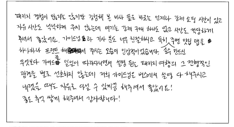 ![]() 토론토 천지에서 부킹했던 파란여행으로 다녀왔던 몬트리올, 퀘벡 여행, 너무나 편안하고 완벽했습니다. 시내에서 가까운 호텔, 편안한 새 버스. 특히 가이드님은 최고로 전문가다우셨습니다. 고객들을 생각해 주시는 마음이 바로 느껴졌습니다. 오래오래 건강하셔서 많은 분께 감동을 주세요. 감사했습니다. ![]() 지인이 추천해 주셔서 알게 되었는데 덕분에 좋은 추억을 남겼습니다. 가이드님께서 너무 열정 넘치게 알려주시고, 재미있게 설명도 잘해주셔서 좋았습니다. 아이스와인 선물과 호텔도 좋았습니다. 보통 패키지 여행하면 좋은 곳이 아닌데 파란여행은 호텔과 위치도 보통 패키지 여행하면 좋은 곳이 아닌데 파란여행은 호텔과 위치 자유시간까지 고려하여 세심하게 신경 써주셔서 너무 좋았습니다. 이때까지 간 패키지여행 중에 TOP 1입니다. 운전해 주시는 기사님도 너무 친절하시고 귀여우세요 좋은 추억 만들어주셔서 너무 감사합니다 ^^ ![]() 숙소가 너무 편안하고 좋았습니다. 가이드분의 친절한 안내와 기사분의 안전한 여행이 너무 감사했습니다. 식사도 여행도 만족스러운 기분 좋은 여행이었습니다. 수고에 감사드립니다. ![]() 패키지 경험이 많지는 않지만 경험해 본 패키지여행은 언제나 강제 쇼핑 시간이 있고 자유시간도 넉넉하게 주지 않는데 여기는 강제 구매 하나도 없고 시간도 적당하게 주셔서 좋았어요 가이드과 기사분도 너무 친절하시고 특히 손수 만드신 주변 맛집 리스트를 하나하나 프린트를 해서 주시는 모습이 인상적이었습니다. 가이드님 일일이 따라다니면서 설명 듣는 패키지여행의 그 전형적인 광경을 별로 선호하지 않는데 저희 가이드님을 버스에서 설명 다 해주시고 내렸을 때는 자유로 다닐 수 있게끔 해주셔서 좋았어요! 좋은 추억 쌓게 해주셔서 감사합니다! ![]() 부모님 모시고 하는 첫 해외여행이었는데, 정말 너무너무 만족입니다. 식사도 다 너무 맛있었고, 호텔 위치도 완벽하고 무엇보다 가이드님이 너무 재밌게 유익한 정보들을 잘 알려주셔서 아주 유익하고 좋았습니다. 앞으로도 캐나다 여행할 때 꼭꼭 이용할 것 같아요! 친구들과 자유여행으로 같은 곳들 다녀왔었는데, 저는 개인적으로 이번 여행이 훨씬 편했고 많이 얻어갑니다. 감사합니다.♥ ![]() 혼자 퀘벡 여행하는 것에 부담을 느껴 파란여행 투어를 이용하게 되었는데, 기대 이상으로 너무 좋았습니다. 2박 3일 동안 혼자라면 절대 하지 못했을 알찬 여행을 한 것 같아 행복해요♥ 새로운 사람들을 만나 서로 사진도 찍으며 재밌게 돌아다녔고, 자유시간도 많아 여유롭게 구경하면서 즐겁게 보낼 수 있었습니다 이런 특별한 경험을 할 수 있게 해주셔서 감사드립니다 다음에는 파란여행 뉴욕 투어 고고~~ ![]() 버스도 너무 편하고 가이드님이 자료 준비도 많이 해주셔서 너무 좋았어요. 아이스와인 주신 것도 맛있게 먹었고 이동시간에 여러 가지 설명해 주셔서 좋은 여행이 되었습니다. 친구한테 소개받았는데 너무 만족했어요! 지인이나 가족에게 추천하고 싶습니다. 호텔 컨디션도 좋았고, 한식, 호텔, 조식도 완전히 만족했어요! 파란여행 최고~!♥♥♥ ![]() 숙소가 다운타운에 있어서 일정이 끝난 이후에도 자유 관광을 할 수 있어서 좋았고 장거리 이동하는 내내 가이드님이 계속 설명 안내 재밌는 이야기 해주셔서 긴 시간이 지루하지 않았어요 하나하나 세심하게 신경 써주시는 것도 좋았습니다 덕분에 좋은 여행 했고 기사님 드라이빙도 친절하고 너무 안전하게 잘해주셨어요! 기사님 덕분에 안전하게 여행했습니다! 감사합니다! ![]() 여행을 안내하시는 분의 역량이 지배적이라는 생각을 했습니다 캐나다를 설명하는 이야기를 통해 조금 알고 가게 된다고 생각하니 여행이 더 의미 있고 행복했습니다 또 오고 싶은 여행사 파란여행 기억하겠습니다. ![]() 처음으로 여행하면서 가이드 통해서 여행하게 되었는데 가이드님께서 너무 재미있고 친절하게 설명해 주셔서 너무 감사했고 만족도 짱입니다! 친구들과 너무 재미있고 소중한 추억 만들 수 있게 해주셔서 감사했어요. 음식도 선택이 너무 좋았고 기사분께서도 운전 잘하시고 호텔도 위치가 너무 좋아 안전하게 잘 묵었습니다. 가이드님 인상이 너무 좋게 끝났습니다! 차 없이는 다니기 어려운 캐나다 여행, 4박 5일 동안 정말 알차게 돌아다니고 가이드님 설명을 통해서 캐나다에 대해 더 깊숙이 알게 되어서 보람차고 좋은 시간을 보냈습니다. 파란여행 완전 강력히 추천합니다. 최고! 가이드님 기사님 너무너무 감사드리고 감사드려요! 좋은 여행 감사합니다. |