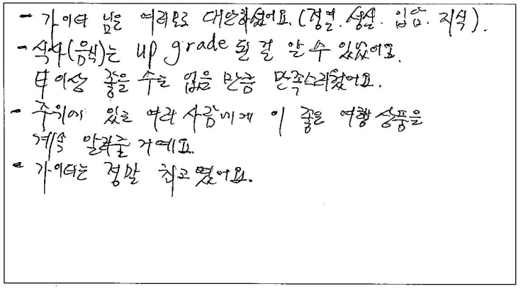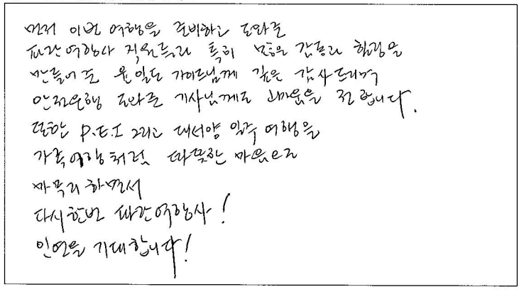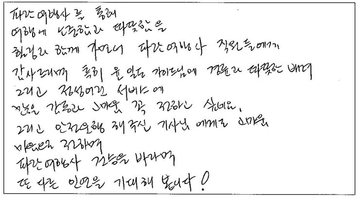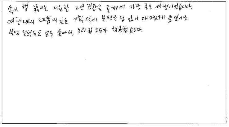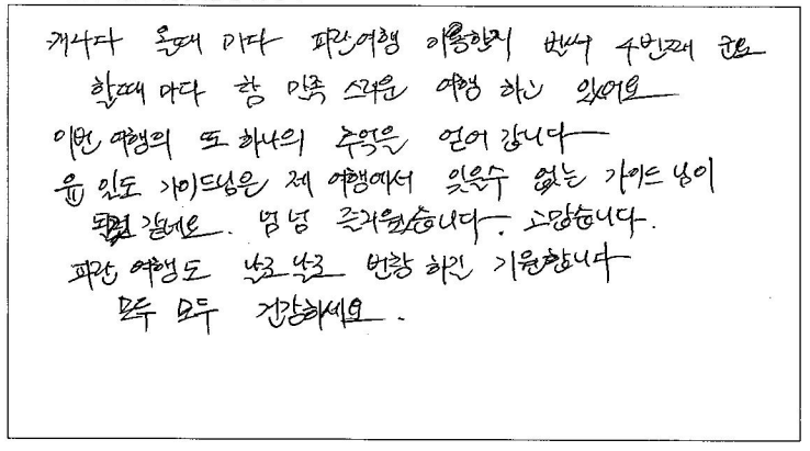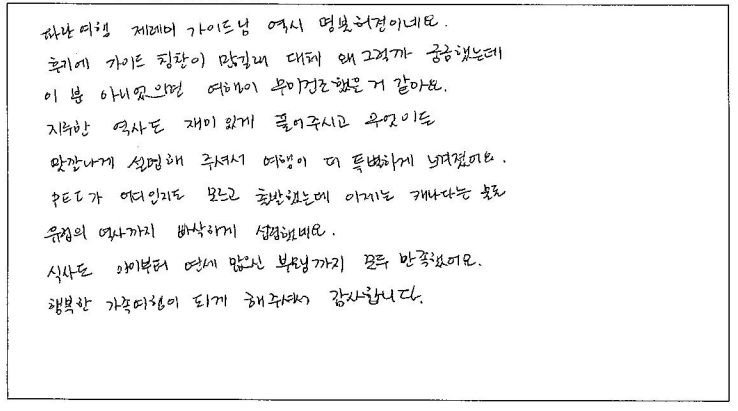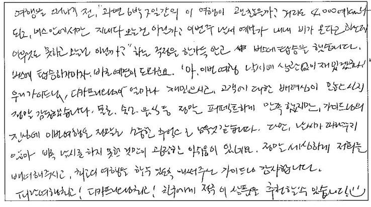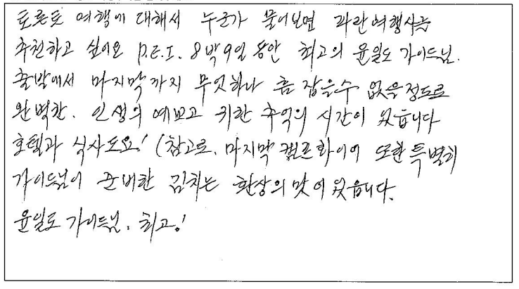 ![]() Best 가이드, Best 운전사, Best 버스! 지금까지 여행 중 가장 편안하고, 즐거운 여행이 되었습니다. 여행사의 표준을 경험하였습니다. 타 여행사도 본을 받기를! ![]() 6박 7일의 긴 여행이었지만 하루하루 즐겁고, 놀랍고, 재미있던 여행이었습니다. 꽉 찬 일정과 맛있는 식사, 가이드님의 유쾌한 설명과 안내도 더욱더 행복한 여행이었습니다. 언젠가 다시 한번 오고 싶은 P.E.I 많은 추억을 소중히 담아갑니다. ![]() 캐나다 올 때마다 파란여행 이용한 지 벌써 4번째군요. 할 때마다 참 만족스러운 여행 하고 있어요. 이번 여행의 또 하나의 추억을 얻어 갑니다. 가이드님은 제 여행에서 잊을 수 없는 가이드님이 될 것 같네요. 너무너무 즐거웠습니다. 고맙습니다. 파란여행도 날로 번창하길 기원합니다. 모두 모두 건강하세요. ![]() 파란여행을 통해 여행의 소중함과 따뜻함과 힐링과 함께 얻어서 파란여행 직원들에게 감사드립니다. 특히 가이드님에 경륜과 따뜻한 배려 그리고 정성 어린 서비스에 많은 감동과 고마움 꼭 전하고 싶네요. 그리고 안전 운행해 주신 기사님에게도 고마운 마음으로 전하고 파란여행의 건승을 바라며 또 다른 인연을 기대해 봅니다! ![]() 만화 빨간 머리 앤을 보고 루시모드 몽고메리 저자의 그린게이블즈의 앤을 읽으며 언젠가는 캐나다 캐빈디쉬를 가보겠다고 생각만 하다, 드디어 2023년 6월 23일 1차 P.E.I 대서양 6박7일 여행을 하게 되었다. 4,000km 와우~~~^^ 해박한 지식과 친절함과 유머 가득한 가이드님, 최고 드라이버, 새로 나온 지 4일 된 56인승 쾌적한 신차 덕분에 안전하게 멋진 여행을 다녀왔다. 모든 여정이 멋지고 즐거웠으며, 매번 새로운 메뉴인 점심, 저녁 식사를 맛있었다. 특히 6일 차점심 차이니즈 뷔페에서 가이드님의 서프라이즈 메뉴부터 아이스박스에 고이 모셔 온 김치는 너무 맛있어서 그 수고로움에 감격했다. 파란여행은 역시 1등 여행사였다! 우리 부부는 단풍 가득한 계절에 다시 파란여행을 만날 것이다. 친절한 가이드에 감사드립니다. 건강하시고 번창하시길 바랍니다. ![]() 파란여행 가이드님 역시 명불허전이네요. 후기에 가이드님 칭찬이 많길래 대체 왜 그럴까 궁금했는데 이분 아니었으면 여행이 무미건조했을 거 같아요. 지루한 역사도 재미있게 풀어주시고 무엇이든 맛깔나게 설명해 주셔서 여행이 더 특별하게 느껴졌어요. P.E.I가 어디인지도 모르고 출발했는데 이제는 캐나다는 물론 유럽의 역사까지 빠삭하게 알게 되었어요. 식사도 아이부터 연세 많으신 부모님까지 모두 만족했어요. 행복한 가족여행이 되게 해주셔서 감사합니다. ![]() 먼저 이번 여행을 준비하고 도와준 파란여행 직원들과 특히 많은 감동과 힐링을 만들어 준 가이드님께 깊이 감사드리며 안전 운행 도와준 기사님께도 고마움을 전합니다. 또한, P.E.I 그리고 대서양 일주 여행을 가족여행처럼 따뜻한 마음으로 마무리하면서 다시 한번 파란여행과 인연을 기대합니다! ![]() 토론토 여행에 대해서 누군가 물어보면 파란여행을 추천하고 싶어요 P.E.I 8박9일 동안 최고의 가이드님. 출발부터 마지막까지 무엇 하나 흠잡을 수 없을 정도로 완벽한 인생의 예쁘고 귀한 추억의 시간이었습니다. 호텔과 식사도요! (참고로 마지막 캠프파이어 또한 특별히 준비한 가이드님 김치는 환상의 맛이었습니다)가이드님 최고! ![]() 속이 뻥 뚫리는 시원한 자연경관을 즐기기에 가장 좋은 여행이었습니다. 여행 내내 짜임새 있는 기획 덕에 불편한 점 없이 재미있게 즐겼어요. 식당 선택들도 모두 좋아서 눈과 입 모두가 행복했습니다. ![]() 2023년 6월 24일, 첫 PEI 대서양 일주. 먼 거리 운전에 대한 단점을 가이드님의 훌륭한 언변과 세심한 배려로 더욱 좋은 일정을 마칠 수 있었습니다. 캐나다에서 여행사로부터 여행으로 계획하시는 분들께 강추! 감사합니다. 계속 발전하는 여행사로 남길 바라며... ![]() - 가이드님은 여러모로 대단하셨어요. (정열, 성실, 입담, 지식) - 식사(음식)는 upgrade 된 것을 알 수 있었어요. 더 이상 좋을 수도 없을 만큼 만족스러웠어요. - 주위에 있는 여러 사람에게 이 좋은 여행 상품을 계속 알려줄 거예요. - 가이드님은 정말 최고였어요. ![]() 여행을 떠나기 전, 과연 6박 7일간의 이 여행이 괜찮을까? 거리도 4,000여km나 되고, 버스 안에서만 지내다 오는 건 아닐까? 이번 주 날씨 예보가 내내 비가 온다고 하는데 아무것도 못 하고 오는 건 아닐까? 하는 걱정을 한가득 안고 버스에 탑승을 했습니다. 버스에 탑승하자마자 바로 예견이 되더군요. '아, 이번 여행 날씨에 상관없이 재미있겠구나!' 우리 가이드님이 얼마나 재미가 있으시고 고객에 대한 배려심이 많으신지 정말 감동했습니다. 물론, 숙소, 음식 등 정말 퍼펙트하게 만족했지만, 가이드님의 진심에 이번 여행을 정말 소중한 추억으로 남을 것 같습니다. 다만, 날씨가 따라주지 않아 비록 낚시를 하지 못한 것 만이 굉장히 아쉽네요. 정말 세심하게 저희를 배려해 주시고 최고의 여행을 할 수 있도록 애써주신 가이드님 감사합니다. 파란여행 최고! 가이드님 최고! 친구에게 적극 이 상품을 추천할 수 있습니다. |