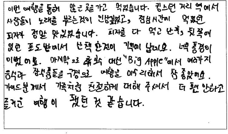 ![]() PEC과 킹스턴의 예쁜 마을들을 구경하며 힐링 되는 행복한 시간이었습니다. 캠프파이어는 독특한 이색적인 맛의 아이스크림이었습니다. 이번 여행은 맛집 탐방을 할 수 있었던 재밌는 여행이었습니다. 와인 농장과 함께 있던 애플사이다, 화덕피자가 맛있는 피자뿐만 아니라 좋은 경치도 볼 수 있어 아름다운 곳이었습니다. 가이드님의 친절한 설명과 안내 덕에 많이 배우고 힐링이 될 수 있었던 여행이었습니다. ![]() 이번 여행을 통해 많은 곳을 가고 먹었습니다. 킹스턴 거리 역에서 사람들이 노래를 부르는 것이 인상 깊었고, 점심시간에 먹었던 피자가 정말 맛있었습니다. 피자를 다 먹고 난 후, 뒤쪽에 있던 포도밭에서 산책한 것이 기억에 남네요. 너무 풍경이 이뻤어요. 마지막으로 호수 대신 'Big Apple'에서 여러 가지 음식과 장식품들의 구경으로 여행을 마무리해서 참 좋았어요. 가이드분께서 가족처럼 친절하게 대해 주셔서 더 편안하고 즐거운 여행이 되었던 것 같습니다. ![]() 직장의 휴가 시기에 맞는 상품을 찾아 여행 기간이 짧은 상품을 선택해서 여행을 갔습니다. 당일(하루) 여행이라 순식간에 끝난 게 아쉬울 정도로 정말 알차고 재미있었습니다. 가이드님이 매우 친절하시고 설명도 잘해주셨고, 운전도 안전하고 편안했습니다. 킹스턴 다운타운은 크진 않지만 아기자기하고 소담한 곳이었습니다. Canada Day여서 농민 시장이 완전히 열지 않은 게 아쉬웠지만 그래도 구경할 만한 것도 많았고 어떤 상품들은 구매하기도 했습니다. 진심으로 방문한 애플사이다. 농장은 너무 만족스러웠어요. 피자는 제 인생 피자라고 할 수 있을 정도로 정말 맛있었습니다. 애플 사이다도 너무 좋았어요;. 맛있어서 하나 사 갈 정도예요 다음에 또 들르고 싶네요 짧았지만 정말 알차고 재밌는 여행이었어요. 다른 분들께도 강력히 추천합니다! ![]() 파란여행 이용은 처음이었어요. 도심의 빌딩만 보다가 탁 트인 들판과 초록색으로 덮인 나무를 보니 힐링이 되는 시간이었어요. 인원도 4명밖에 되질 않아 분위기도 아주 좋았어요. 여행사를 통해 하는 여행은 오래간만이었는데 뜻밖에 아주 좋은 시간이었습니다. 점심으로 먹은 피자는 정말 예술이었습니다. 가이드님 진심으로 고객들을 위하는 마음이 느껴져서 감동했습니다. 앞으로 뉴욕 워싱턴 여행도 파란여행을 이용할 것 같습니다. 감사했습니다. 힐링 되고 멋진 여행이었어요. |