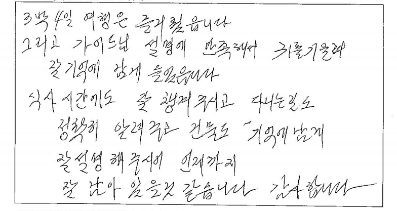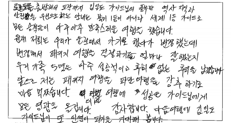 ![]() 가이드님 2박 3일 여행 최고였어요. 후기에 가이드님 칭찬들 보고 예약했는데 정말 선택 잘했어요. 여행내내 감사드려요. 이동하는 차도 너무 편하고 최고의 '버스', 많은 여행지, 이야기, 숙소, 식당 최고예요 ^^ 파란여행이 캐나다에서 1위 여행사~ 다음에도 파란여행으로 이용 꼭 꼭 예약하고 주위사람들에게 추천합니다. ![]() 즐거운 여행이었습니다. 앞으로도 계속해서 더 유익한 정보 부탁드리고 건강 잘 챙기고 행복한 날 계속 되길빌게요~ ![]() 전반적으로 만족스러운 여행이었습니다. 차량도 최신이라 편했고 식사도 맛있었어요. 한식이라 어른들이 좋아하셨어요. 무엇보다 가이드님의 역사 이야기와 재밌는 어투가 오랫동안 기억에 남을 것 같아요. 정말 감사드려요. 퀘벡에서 맛집리스트와 약도 주신 게 세심하게 챙겨주신 것 같아서 아주 좋았어요. ![]() 즐겁고 유익한 여행이었습니다. 주위에도 추천하고 싶어요. 캐나다에 대해 더 많이 알 수 있어 좋았습니다. 가이드님께 감사합니다. ![]() 3박 4일 여행은 즐거웠습니다. 그리고 가이드님 설명에 만족해서 귀를 기울여 잘 기억에 남게 들었습니다. 식사 시간에도 잘 챙겨주시고 다니는 길도 정확히 알려주고 건물도 기억에 남게 잘 설명해주시어 오래 잘 남아 있을 것 같습니다. 감사합니다. ![]() 토론토를 출발해서 도착까지 가이드님의 풍부한 역사 지식과 안전을 우선으로하는 안내는 북미 1등이 아니라 세계 1등 가이드로 모든 승객들이 아주 아주 만족스러운 여행을 했습니다. 원래 저희는 우리가 운전해서 가기로 했다가 변경했는데 패키지 여행을 결정하기를 얼마나 잘했는지 우리 가족 5명은 성공적이고 후회 없는 추억을 남겼습니다. 앞으로 저는 패키지 여행을 파란여행을 강추하기로 마음 먹었습니다. 이번 여행에 성공은 가이드님에게 모든 영광을 올립니다. 감사합니다. 다음여행에 가이드님과 또 인연이 되기를 기대해 봅니다. ![]() 가이드님의 재미난설명에 지루하지 않게 귀에 쏙쏙 들어와서 좋았고 많은 걸 얻고 가는 것 같아 좋았네요. 영화 선택도 굿~ |