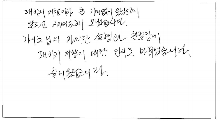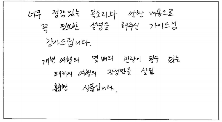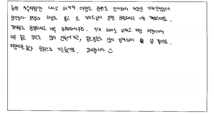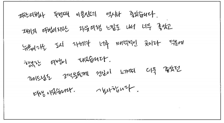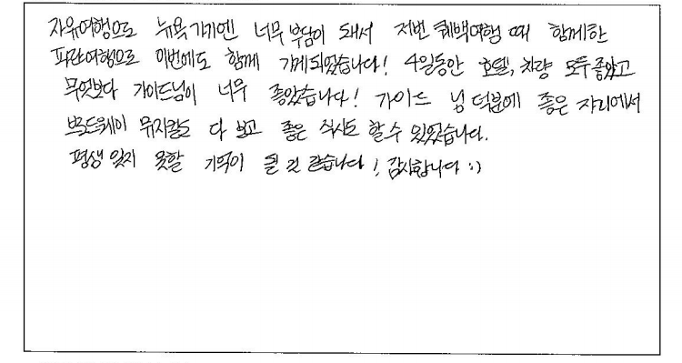 ![]() 이번 캐나다 여행을 통해 파란여행에서 퀘벡을 다녀온 후 상품이 좋아서 미국 뉴욕여행을 결정했습니다. 뉴욕만 4일 상품이 잘 짜여져 있어 매우 만족했습니다. 호텔에서 잠자리가 편하니, 힘든 관광에도 좋았던 것 같습니다. 긴 시간동안 가이드님의 친절한 모습도 너무 좋고 운전기사분도 매우 친절하셔서 파란여행이 기억에 남을 것 같습니다. 패키지 상품이지만 자유관광 시간이 적당하게 있어 파란여행을 추천드리고 싶네요. 가이드님 너무 감사드리고 수고 많으셨습니다. ![]() 너무 정감있는 목소리와 알찬 내용으로 꼭 필요한 설명을 해주신 가이드님 감사드립니다. 개별 여행의 몇 배의 관광이 될 수 있는 패키지 여행의 장점만을 살린 훌륭한 상품입니다. ![]() 짧은 시간안에 뉴욕의 명소들을 다양하게 둘러볼 수 있어서 좋았습니다! 패키지를 이용함으로써 자유의 여신상, 브로드웨이 뮤지컬, 메트로 폴리탄 박물관 등 다양한 장소를 효율적으로 살펴볼 수 있었습니다. 이동시간 동안 가이드님의 설명과 여러 이야기를 들으며 이동하여 지루하지 않게 잘 재미있게 다닐 수 있었습니다 감사합니다 :) ![]() 자유여행으로 뉴욕가기엔 너무 부담이 되서 지난 번 퀘벡여행 때 함께한 파란여행으로 이번에도 함께 가게되었습니다! 4일동안 호텔, 차량 모두 좋았고 무엇보다 가이드님이 너무 좋았습니다! 가이드님 덕분에 좋은 자리에서 브로드웨이 뮤지컬도 다 보고 좋은 식사도 할 수 있었습니다. 평생 잊지 못할 기억이 될 것 같습니다! 감사합니다 :) ![]() 항상 자유여행만 다니고 패키지 여행은 한 번도 안가봐서 처음엔 기대 안했는데 생각보다 호텔과 챠량도 좋고 또 가이드님이 정말 친절하시고 너무 재미있으세요. 기사님도 친절하시고 너무 유쾌하시구요, 기대 하나도 안하고 떠난 여행에서 너무 좋은 추억도 많이 만들어가고, 좋은 분들도 많이 알게 되서 너무 좋네요. 여행하는 동안 힐링으로 가득했어요. 감사합니다 :) ![]() 뉴욕 3박 4일 다녀왔습니다. 뉴욕은 정말 살아서 꼭 한 번은 가봐야 할 곳이라고 느꼈어요. 많은 곳을 다녀봤지만 너무 생동감이 있는 곳입니다. 처음부터 마지막날까지 퍼펙트하게 많은 정보를 주신 가이드님 너무 수고하셨고 감사드립니다. 짧은 기간동안 최고의 여행을 위해 최선을 다해 주신 덕에 즐겁고 편안한 여행을 잊지 못할 것 같네요. ![]() 친절하고 성실한 가이드님 덕분에 안전하고 알찬 여행 잘 마무리했습니다. 버스에서 이동하는 긴 시간이 짧게 느껴지도록 재미있고 알찬 이야기 많이 해주신 김정규 가이드님 고맙습니다. 덕분에 다음에 뉴욕여행을 또 오고 싶다는 생각이 드는 것 같아요 :) ![]() 덕분에 가족들과 좋은 추억 만들었습니다. 감사합니다. 여행은 가도 가도 즐겁습니다. ![]() 여행을 하면서 낯선 나라에서의 불편함이 여행사의 가이드님 친절과 세세한 안내를 해주셔서 많은 도움이 되었습니다. 좋은 추억을 남길 수 있도록 도와주셔서 감사드립니다. ![]() 패키지 여행이라 큰 기대없이 왔는데 알차고 재미있게 보냈습니다. 가이드님의 자세한 설명과 친절함에 패키지 여행에 대한 인식도 바뀌었습니다. 즐거웠습니다. ![]() 파란여행 두번째 이용인데 역시나 좋았습니다. 패키지 여행이지만 자유여행 느낌도 나서 너무 좋았고 뉴욕이라는 도시 자체가 너무 매력적인 곳이라 덕분에 행복한 여행이 되었습니다. 가이드님도 고객분들께 진심이 느껴져 더욱 좋았던 여행이었습니다. 감사합니다. |