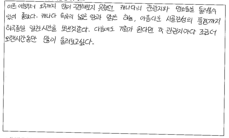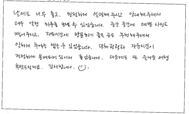 ![]() 동화속을 거닐 듯 행복한 하루였습니다 뻥 뚫리는 광활한 대지와 한적한 풍경이 가슴속에 오래 남을 듯 합니다. 마을에서 오가는 너무 예쁜 명품마차도 좋은 추억거리고 소소하지만 행복감은 최고인 여행되었습니다. 감사합니다~^^ ![]() 세번째 파란여행사와 여행했습니다. 역시나 알찬 프로그램 구성과 만족도 최고입니다. 기대 이상으로 마켓에서의 시간이 재미있고 유용한 시간이었습니다. 넓은 캐나다의 위상을 다시금 확인할 수 있었던 여행입니다. 앞으로 여행사에덧 알려지지 않을 캐나다 구석 구석의 여행지를 발견. 이끌어주시길 바라고 늘 응원하겠습니다. ![]() 당일 관광으로 편안하게 다녀올 수 있었습니다. 부담스럽지 않게 적절하게 설명해주셔서 유익한 시간을 보냈어요. 일정도 여유롭게 이루어져서 충분히 즐길 수 있는 관광이었네요. 가이드님 감사합니다. 재미있었어요. ![]() 날씨도 너무 좋고, 친절하게 설명해 주시고 안내해주셔서 매우 알찬 하루를 보낼 수 있었습니다. 중간 중간에 예쁜 사진도 찍어주시고 자유시간에 방문하기 좋은 곳도 추천해주셔서 알차게 추억을 쌓을 수 있었습니다. 단체 관광과 자유시간이 적절하게 분배되어있어서 좋았습니다. 다음에도 또 즐거운 여행 부탁드릴게요. 감사합니다 ^^ ![]() 이른 아침부터 오후까지 많이 구경해보지 못했던 캐나다의관광지와 명소들을 둘러볼 수 있어 좋았다. 캐나다 특유의 넓은 땅과 맑은 하늘, 아름다운 시골 감성의 풍경까지 하루종일 알찬 시간을 보낸 것 같다. 다음에도 기회가 된다면 각 관광지마다 조금 더 오랜 시간동안 많이 둘러보고싶다. |