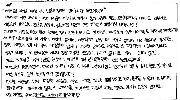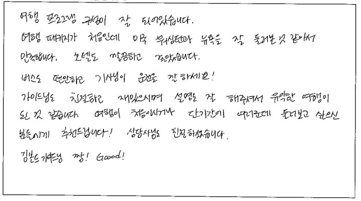 ![]() 기대했던 딸과의 뉴욕·워싱턴 여행. 파란여행에서 준비해주신 훌륭한 스케쥴과 차량, 숙소, 식사로 더욱 즐겁고 행복한 추억이 되었습니다. 특히 '모르고 보면 건물에 불과하지만, 알고 보면 더 큰의미가 있다'고 하시면서 재미있게 역사 이야기 해주신 가이드님 너무 감사합니다. 파란여행 덕분에, 캐나다에 와서 미국여행까지 너무 즐겁게 하고 갑니다. 감사합니다. ![]() 여행 프로그램 구성이 잘 되어있습니다. 여행 패키지가 처음인데 미국 워싱턴과 뉴욕을 잘 둘러본 것 같아서 만족합니다. 호텔도 깔끔하고 좋았습니다. 버스도 편안하고 기사님이 운전을 잘 하세요! 가이드님도 친절하고 재밌으시면 설명도 잘 해주셔서 유익한 여행이 된 것 같습니다. 여행이 처음이시거나 단기간에 여러군데 둘러보고 싶으신 분들에게 추천드립니다! 상담사님도 친절하셨습니다. 가이드님 짱! Good! ![]() 워싱턴 DC와 뉴욕 명소를 효율적으로 관광할 수 있는 최적화 여행이었다. 감기 몸살과 시차문제로 힘든 상황임에도 먹거리 문제가 무난 했으며 무엇보다 뷔페(저녁)식사에서 스테이크는 매우 맛났고 고기누린내를 잘 맡기로 소문난 내게 또 먹고 싶다는 생각까지 하게 하였다. 첫날의 동양식 뷔페의 조개요리와 새우요리는 여러번 퍼다 먹었음에도 아직까지 더 먹을걸 하는 아쉬움이 남는다. 호텔은 깨끗했고 편안하였다. 특히 주변여건이 조용한 곳이라 산책하기에 좋았다. 작지만 수영장이 있어서 아들의 운동에 큰 도움이 되었다. 가장 좋았던 것은 자유의 여신상 페리호였고 엣지 전망대와 페리호에서 가이드의 네트워크 재량으로 신속하게 관광할 수 있어서 만족스러웠다. 아팠음에도 개그와 유머 감각이 뛰어난 가이드 언변덕에 웃을 수 있어서 감사드린다. 비용면에서도 만족스럽다. ![]() 캐나다 딸 집에 귀여운 첫 손주를 보러와서 항상 가보고 싶었던 뉴욕 워싱턴 패키지 상품이 있다는 말을 듣고 딸을 통해 파란여행을 알게되며 남편과 함께 여행했습니다. 생각보다 뉴욕의 멋진 모습 특히 엣지 전망대에서 본 뉴욕의 야경은 너무나 멋졌습니다. 평생 잊지 못할 것 같아요. 차량과 호텔 점심식사, 그리고 가이드님의 차량이동 중 쉰내 없이 미국역사와 재미있는 멘트로 인해 지루하지 않는 즐거운 여행이었어요. 가이드님 최고였습니다. ![]() 두근두근 설레는 마음으로 출발한 워싱턴 뉴욕여행 캐나다에서 자차로 갈까하다 운전해서 길고긴 여정을 셀프로하려니 심난하던차에 구글링을 통해 파란여행을 알고 상담을 드렸고 실시간 답변에 고민없이 선택했습니다. 첫날 가이드님의 재치있는 입담에 지루하지 않게 여정을 즐길 수 있었습니다. 특히나 가이드님의 역사이야기를 통해 더욱 더 알찬여행이었습니다. 특히나 맨하튼 도시투어는 셀프 운전은 절대 못하겠다 싶고 편안한 버스로 도시곳곳을 픽업해주신 기사님 운전실력도 짱입니다. 뉴욕의 핵심투어들을 알차게 설계해주신 가이드님 고생 많으셨습니다. 감사합니다. ![]() 역시 파란여행입니다. 짱입니다. 감동~ 감동~ 또 감동하고 가네요. 3박 4일이 이렇게 짧을 줄이야. 시작부터 돌아가는 오늘까지 너무나 많은 사고를 우리들이 쳤는데 친절의 끝판왕 가이드님께서 너무나도 현명하게 친절하게 잘 가이드 해 주셨어요. 죄송하고 감사합니다. 이렇게 또 많은 추억들이 저장되네요. 여행은 알고보면 스토리와 역사가 보인다. 요런 뉴욕 워싱턴 여행은 너무나도 잘 구성된 상품에 버스는 에어컨 빵빵~~ 호텔 넓고 깨끗하고 식사 짱입니다. 소중한 여행이였어요. 감사하고 고마웠어요. 파란여행 가이드님 짱 짱! 제가 말한 가이드님 중 세계최고 우주 최고입니다. ![]() 가이드님과 함께 한 워싱턴, 뉴욕 패키지는 완벽 그 자체였습니다! 몇 번 와본 뉴욕임에도 불구하고 평소엔 잘 가지않을 스팟도 가고 특히 모든 일정을 끝내고 재즈 뉴욕 뉴욕을 들으며 보던 야경은 잊지 못할 것 같습니다 기사님도 운전을 너무 잘해주셔서 이동 때마다 잠에 푹 들 수 있었어요! 좋은 추억 만들어주셔서 감사합니다 :) . ![]() 가이드님이 여행내내 지루하지 않게 해주셔서 너무 좋았어요! 여행 기획이 너무 만족스러웠어요. 차량도 너무 좋아서 여행오고 가는 과정에서 너무 편했어요. 식사도 맛있는 곳으로 잘 골라주셔서 맛있게 먹었습니다! 가이드님이 정말 유쾌하고 친절하셔서 정말 마음에 들었어요! 다시 한 번 여행하고 싶네요. 미국에서 꼭 가야하는 곳을 쏙쏙 잘 뽑아 정리해 갈 수 있어서 매우 만족했어요! ![]() 가이드님이 재미있으셔서 버스에서 지루할 틈이 없었어요. 버스가 되게 편하고 안정감이 있어서 버스가는 동안에 편하게 잘 수 있었어요. 다른 분들과 짧은시간에도 친해질 수 있었어서 더욱 더 즐거웠습니다. 가이드님이 모든 분께 웃음을 주어 너무 감사했습니다. 호텔도 시원하고 너무 편했습니다. 아침, 점심, 저녁도 푸짐하게 맛있게 배불리 잘 먹었습니다. 타임스퀘어에서 워싱턴 뉴욕에서 가서 너무 좋았습니다! 좋은 추억 남기고 갑니다. ![]() 어럼처럼 파랗고 예쁜기억 선물해 주셔서 감사합니다. 파란여행 16살이라는 어린 나잉에 엄마와 단둘이 여행하는 거