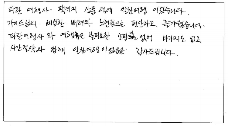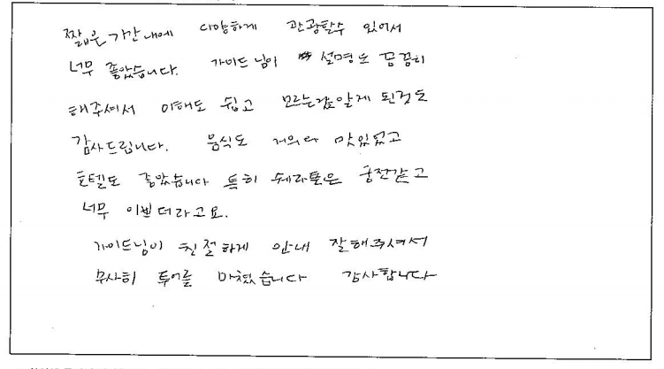 ![]() 가이드님의 세심함이 돋보이는 여행이었습니다. 시간을 잘 배분하셔서 알차게 뉴욕+워싱턴을 잘 구경했고 호텔도 굉장히 좋았습니다. 마지막 식사는 비빔밥이었는데 정말 맛있었네요. 아이들은 뮤지컬을 보러가고, 엄마없이 가는데도 잘 챙겨주시고 그 시간에 저는 뉴욕을 알차게 구경했습니다. 너무 즐거운 여행이었어요. ![]() 토론토에서 오래 산건 아니지만 몇년 전에 퀘벡 여행이후 이번에 뉴욕 여행도 파란여행을 이용했습니다. 퀘벡 여행때도 가이드님이 좋으신 분이셨는데 이번 여행도 좋은 가이드님을 만났어요 맛있는 식사도 하고 좋은 구경도하게 해주셔서 매우 만족합니다 ![]() 3박 4일 짧은시간동안 뉴욕, 워싱턴 다 볼 수 있을까 걱정했는데 가이드님이 꼭 봐야하는 곳, 최소한의 동선, 최대 효율로 도와주셔서 정말 알차게 잘 구경하고 왔습니다~ 버스 이동시간 중에서도 재미있는 이야기, 구경에 도움되는 정보들 미리 잘 알려주셔서 더 유익한 여행이었어요! 무엇보다 사진 스팟을 너무 잘 알려주셔서 걱정없이 많이 찍었습니다. 다음 여행도 파란여행 이용하고 싶어요~ ![]() 타이트한 일정이었지만, 정말 즐겁고 알차게 경험하고 즐겼습니다. 많이 고민하고 또 실행해주신 여행계획이라는 생각이 들고요 특히 뉴욕일정의 경우는 이틀을 해야할 일정들이 하루만에 할 수 잇는 기획과 진행이 놀라울 정도였습니다. 중간 중간에 생기는 어려움들과 고객들이 요구들을 다 해결해주시는 가이드님의 능력, 다시 한 번 감사드립니다. 알찬 진행, 깊이있고 해박한 설명, 즐거운 여행이었어요. 감사합니다. 다른 분들에게도 강추합니다. ![]() 개인적으로 일정이 타이트해도 이것저것 많이 배우고 듣고 보는 여행을 좋아하는데, 들인 돈이 아깝지 않을 정도로 그 니즈에 딱 맞는 여행이었습니다. 여행지마다 상세한 설명을 해주시고, 관련된 비디오를 중간에 보여주셔서 기억에 많이 남을 것 같습니다. 무엇보다 인원이 55명으로 많았는데, 세심하게 케어하시는 모습에서 가이드님의 노련미를 볼 수 있었습니다. 일정이 살짝 늦어지거나 주변 상황에 따라 변경이 있을 수 있는 환경에서도 당황하지 않고 차분하게 이슈를 해결해가시는 모습에서 여행내내 안심하고 따라 다녔습니다. 그 외 식사, 호텔 모두, 무엇보다도 청결면에서 만족스러웠습니다. 고맙습니다. ![]() 짧은 기간내에 다양하게 관광할 수 있어서 너무 좋았습니다. 가이드님이 설명도 꼼꼼히 해주셔서 이해도 쉽고 모르는 것을 알게 된 것도 감사드립니다. 음식도 거의 다 맛있었고 호텔도 좋았습니다. 특히 쉐라톤은 궁전같고 너무 이쁘더라구요. 가이드님이 친절하게 안내 잘해주셔서 무사히 투어를 마쳤습니다. 감사합니다. ![]() 젠틀한 가이드님 덕분에 처음온 뉴욕 관광이 멋짐 폭발이었습니다. 저희들 한 명 한 명 세심하게 챙겨주시고 한 번에 끝나지 않고 두번 세번 체크해주심에 감사드려요~ 다음 여행을 계획한다면 다시 한 번 파란여행과 바다같은 파란마음으로 뵙겠습니다. 주변에 홍보할게요. 가이드님 수고하셨습니다! ![]() 한정된 시간에 다양한 것들을 최대한 할 수 있는 팁을 많이 주셔서 좋았습니다. 일주일 여행을 농축해서 한 기분입니다. 이동 중에 해주신 역사, 경제 이야기 덕분에 의미있는 투어가 됐습니다. 적절한 영상과 영화덕분에 지루하지 않고 여행한 장소들이 더 기억에 남을 것 같습니다. ![]() 파란여행 패키지 상품덕에 알찬여행이었습니다. 가이드님의 세심한 배려와 노련함으로 편안하고 즐거웠습니다. 파란여행과 여행의 불필요한 쇼핑이 없어 바가지도 없고 시간 절약과 함께 알찬여행이었음을 감사드립니다. ![]() 여행을 가기 전에 미리 공부하고 정보를 찾아보고 떠나고 싶었지만, 그러지 못하고 무작정 파란여행 버스에 몸을 싣게되었다. 아는 만큼 보인다는데 아는게 너무 없어서 감흥이 없으면 어쩌나 걱정했는데 세상에! 정치, 경제, 예술, 문화, 역사 등 모든 분야에 뛰어난 지식을 갖고 계신 가이드님을 만나서 정말 많이 배우고 부담없는 알찬 여행이었습니다. 이동시간에는 재미난 영화도 틀어주셔서 좋았습니다. 워싱턴과 뉴욕 모두 처음 가보는데 즐겁고 기억에 많이 남을 것 같다. 조금 많이 걷고 사람도 많고 복잡해서 피곤하긴 했지만 좋은 추억으로 남을 것이다. 그리고 3박 모두 다른 호텔이었는데 넓고 깨끗했다. 쇼핑이 없는건 정말 최고! (개인 자유 쇼핑 시간은 좋았어요!) |
