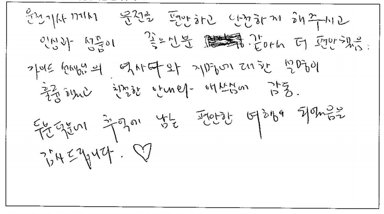 ![]() 친구와의 오랜만의 여행으로 파란여행을 통해 퀘벡 2박3일을 택했습니다. 깨끗한 차량과 친절한 가이드님까지 도저히 믿기지 않을 착한 가격으로 알차고 멋진 즐거운 여행을 했습니다. 2시간마다 휴게소에 들려서 중간 중간 스트레치를 할 수 있었고 목적지가는 내내 가이드님의 재미 있는 역사 이야기와 유례등등 지루할 틈이 없었고, 설명을 듣고 난 후 관광을 하면서 새로운 것들에 대한 흥미와 호기심이 더 해지는 정말, 재미있는 여행을 할 수 있었습니다. 최선을 다해 열심히 가이드 하시는 가이드님! 다음 여행 또 같이 하겠습니다. ![]() 정말 많은 곳을 편하고 재밌게 다닐 수 있어서 정말 뜻깊고 기억에 남을만한 여행이었던 것 같습니다. 더운 날씨에도 정말 자세하고 이해하기 쉽게 열심히 설명해주셔서 정말 감사했습니다. 2박 3일동안 시설도 만족스러웠고 꼭 추천하고 싶은 여행이었습니다. 차량도 정말 편리하고 퀘벡의 건물들 정말 전부 멋지고 예뻤습니다. 감사합니다. ![]() 저를 위해캐나다 방문해주신 어머니와 좋은추억을 만들고 싶어서 신청했습니다! 처음 예약할 때 부터 친절하게 안내 도와주시고 가이드님의 자세한 설명과 위트있는 재치로 더더욱 유쾌한 여행이었습니다! 퀘벡여행 = 파란여행이라는 말 자주 들었었는데 직접 경험해보니 파란여행은 찐입니다 ㅎㅎ 좋은 추억, 좋은 여행상품으로 만들게 해주어서 감사합니다! ![]() 프로페셔널한 가이드님, 기사님 수고 많으셨습니다. 저희 가족에게 소중한 추억이 생겼습니다. 워낙 먼 길이라 힘은 들었지만 중간중간 적절한 휴식, 맛있는 한식 식사로 기운 내내 다닐 수 있었습니다. 앞으로 캐나다를 떠올리면 이번 여행의 좋은 기억이 생각 날 것 같습니다. 감사합니다. ![]() 10년전 인연으로 다시 선택하게 되었습니다. 역시 파란여행입니다. 현지 사정을 제일 잘 아시고 직접 발로 뛰어서 만든 패키지 여행이라는게 너무 잘 느껴집니다! 섬세하게 지도랑 맛집 추천도 해주셨는데 다 너무 좋았습니다. 감사합니다. 너무 행복한 여행이었습니다. ![]() 퀘벡 2박 3일동안 즐겁고 편안했습니다. 토론토에서는 볼 수 없는 멋진 거리와 아름다운 건물. 도깨비 촬영지로 유명한 관광지까지 패키지지만 너무 여유롭고 만족스럽습니다. 2박 3일동안 안전운전과 가이드해주셔서 감사하고 기회가 된다면 다음에도 함께하고 싶습니다. ![]() 날씨까지 너무 완벽했던 2박 3일 퀘베여행! 10일 캐나다 여행 중 토론토에만 있을 수 없다며 예약한 여행! 정말 탁월한 선택이었던 것 같습니다. 가이드님의 열정적인 설명과 함께 많은 공부가 되었던 뜻깊은 여행이었습니다. 올드 퀘벡은 너무 아름다웠고 날씨도 완벽했으며 같이 동행하신 일행들 또한 다들 친절하시고 잘 챙겨주셔서 편안하게 여행을 마치며 한국으로 돌아갑니다. 파란여행 감사합니다. ![]() 운전기사님께서 운전을 편안하고 안전하게 해주시고 인심과 성품이 좋으신 분 같아서 더 편안했음. 가이드님의 역사와 지명에 대한 설명이 훌륭했고 친절한 안내와 애쓰심에 감동. 두분 덕분에 추억이 남는 편안한 여행이 되었음을 감사드립니다. ![]() 퀘벡을 개인적으로 렌트해서 가려고하다가 비용면이나 익숙치못한 운전등으로 인해 파란여행 단체여행 상품을 선택했습니다. 날씨도 너무 좋았고 패키지 내용도 너무 알차고 한식당에서의 식사도 정말 맛있었습니다. 그중에서도 무엇보다 행운이었던 것은 출발 시작부터 여행 마무리까지 최선을 다해 설명해주시고 세심히 배려해주신 우리 가이드님, 너무 감사하고 멋지셨습니다. 다음 여행에서도 만나길 기대해보며, 파란여행 대박나세요! ![]() 퀘벡여행이 파란여행에서 두번째입니다. 겨울퀘벡도 멋있었지만 이번 가을단풍직전의 여름퀘벡도 날씨까지 완벽해서 너무나 좋은 시간 보내고 왔습니다. 무엇보다 차량에서 많은이야기를 나눠주셨던 가이드님 너무 재미있게 잘 들었어요. 가을 퀘벡을 보러 조만간 또 가야할 것 같아요. 2023년 멋진 추억 남겨주어 감사합니다! ![]() 전 토론토에 살고 있는 사람인데 한달 전에 친언니가 한국에서 놀러와서 '파란여행-퀘벡 2박 3일'을 하고 너무 만족했는데요. 한달 뒤에 친구가 한국에서 놀러와서 같이 패키지로 또 오게 되었어요. 저번 뿐만 아니고 이번에도 정말 만족한 여행을 할 수 있게도이ㅓ 파란여행 사랑합니다^^ 특히, 가이드님 최고예요. 너무 재미있으시고 성실하시고 최선을 다하시는 모습 정말 감동이에요 감사합니다. 덕분에 행복한 여행 하게 되었습니다. |