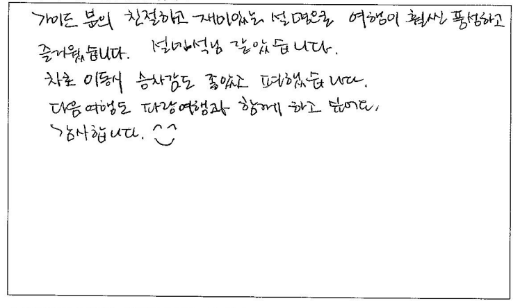 ![]() 가이드님과 함께한 천섬+킹스턴 당일치기 여행. 부모님이 캐나다에 여행오신김에 당일치기 여행을 계획했어요 여행사를 통해서 가는 여행은 처음이라 긴장했는데 처음부터 끝까지 만족스러운 여행이었습니다. 고속도로 달리는 내내 캐나다 역사나 상식 그리고 뜬금없는 질문들 전부 친절히 설명해주셔서 감사했고 즐거웠습니다. 생각보다 너무 여유있게 구경하고 돌아다닐수 있어서 좋았습니다. 다음 번에는 단풍여행을 계획해 보려구요! ![]() 여행사를 통해서 처음으로 여행을 해보는거라 걱정이 많았는데, 가이드님께서 설명도 잘 해주시고 편안하게 이끌어 주신 덕분에 부모님과 함께하는 가족여행이 정말 기억에 많이 남고 좋은 추억으로 남을 여행이 되어 좋았습니다. ![]() 캐나다에서 처음으로 파란여행을 이용했다. 가이드님도 친절하시고 자세히 설명도 잘해주셔서 오늘 하루 여행 만족합니다. 다음여행에도 좋은 추억 만들고 싶다. ![]() 가이드분의 친절하고 재미있는 설명으로 여행이 훨씬 풍성하고 즐거웠습니다. 설민석님 같았습니다. 차로 이동시 승차감도 좋았고 편했습니다. 다음여행도 파란여행과 함께 하고 싶어요. 감사합니다 ^^ ![]() 짧은 시간이었지만 알찬 여행이었어요. 좋은 일정과 상세하게 유머있게 역사를 알려주셨다 가이드님께 감사드려요. |
